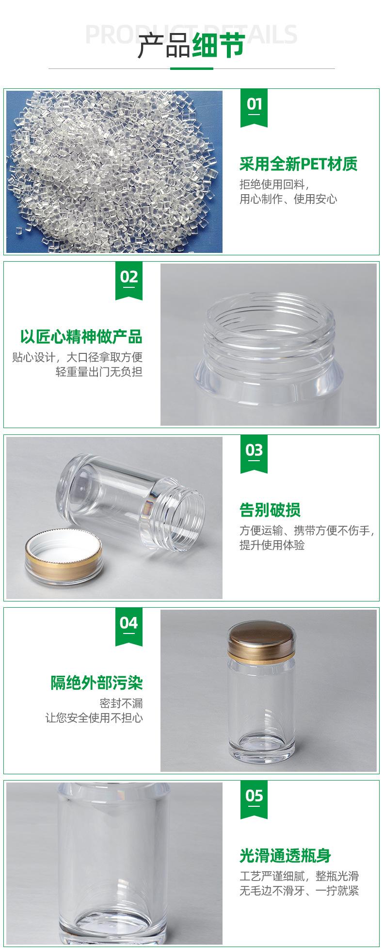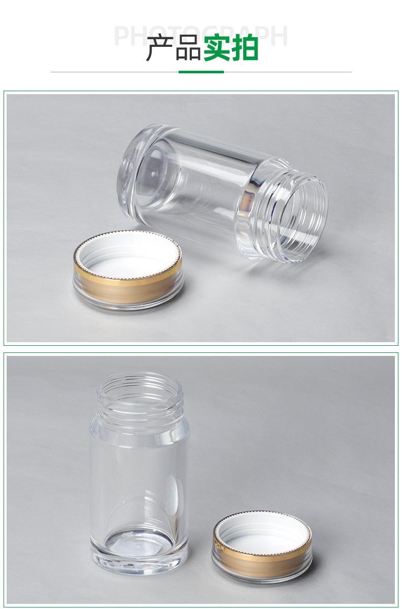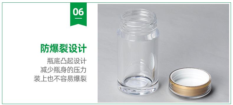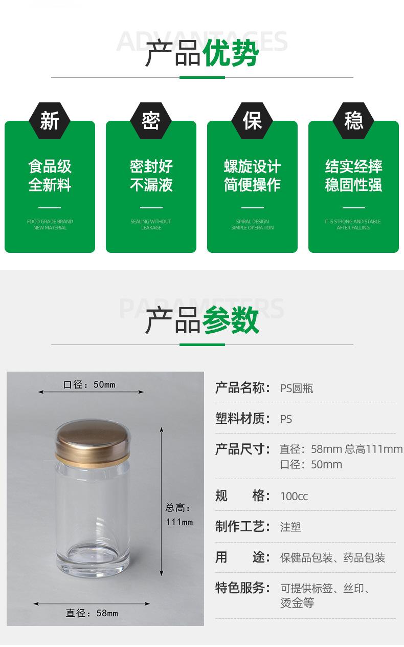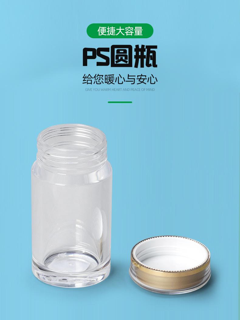 Botella para tabletas de grado alimenticio de fábrica de origen, botella secundaria redonda de plástico transparente, tapa a presión 100C, botella redonda para cápsulas de PS