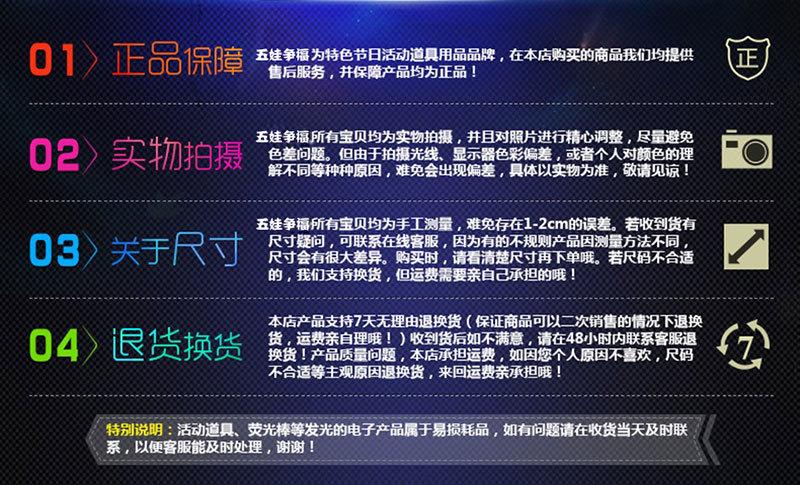 Como todos son accesorios festivos, su tiempo de uso es relativamente corto.Si tiene alguna pregunta, comuníquese con nuestro servicio de atención al cliente en un plazo de 24 horas. No se aceptarán consultas fuera de plazo. Gracias por su cooperación.
