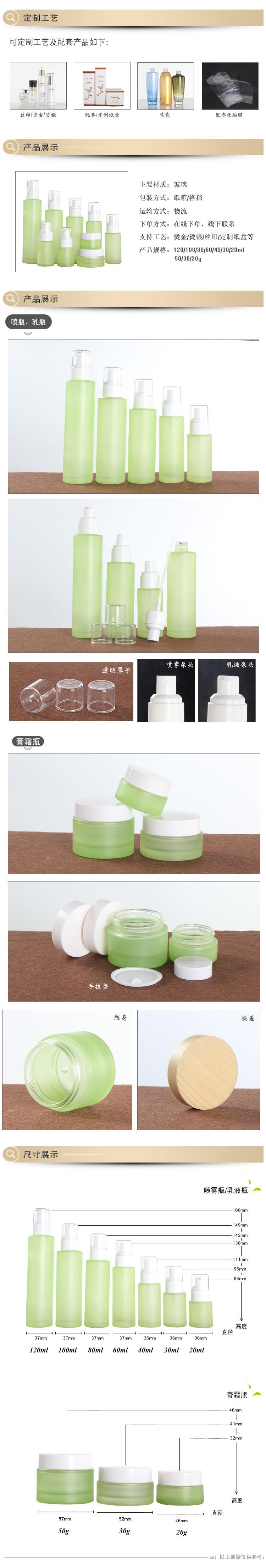 Frasco de vidrio para crema cosmética, spray verde, bomba dosificadora, material de envasado, frasco vacío, frasco de perfume con atomizador