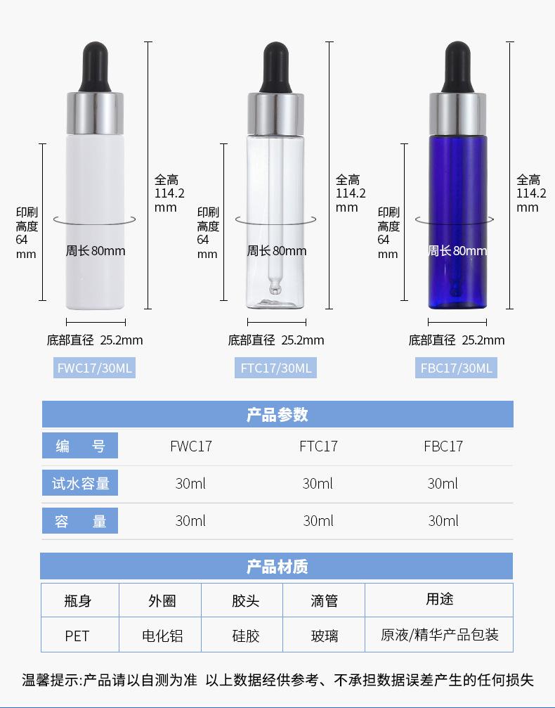 30ml transparent; dropper bottle; pet, 30ml white; dropper bottle; pet, 30ml blue; dropper bottle; pet