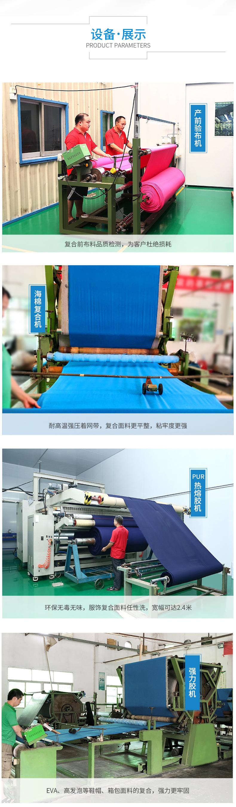 Proceso compuesto: Compuesto con adhesivo PUR de fusión en caliente, respetuoso con el medio ambiente e inodoro, suave y lavable. Admite compuesto de dos capas, compuesto de tres capas y compuesto multicapa.