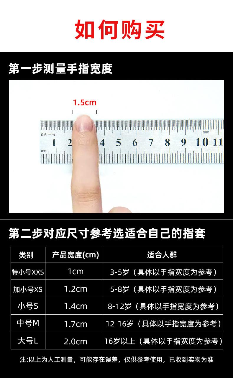 Extra small (No. 0), Small size (No. 1), Medium (No. 2) finger sleeve, Large (No. 3) finger sleeve, Extra Large (No. 4)