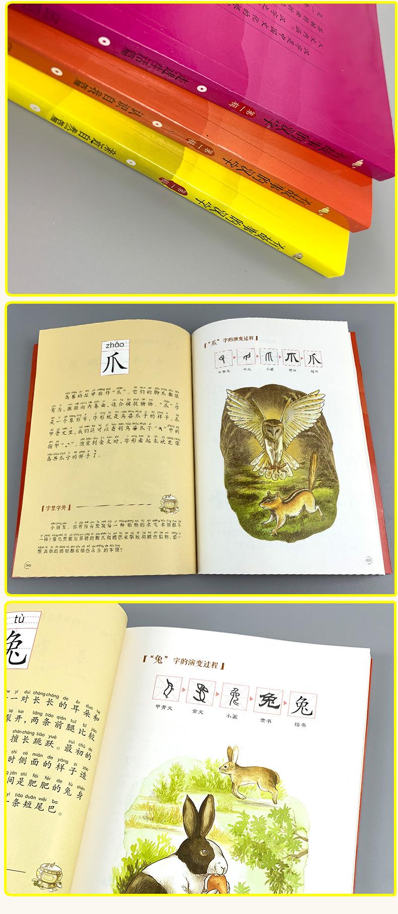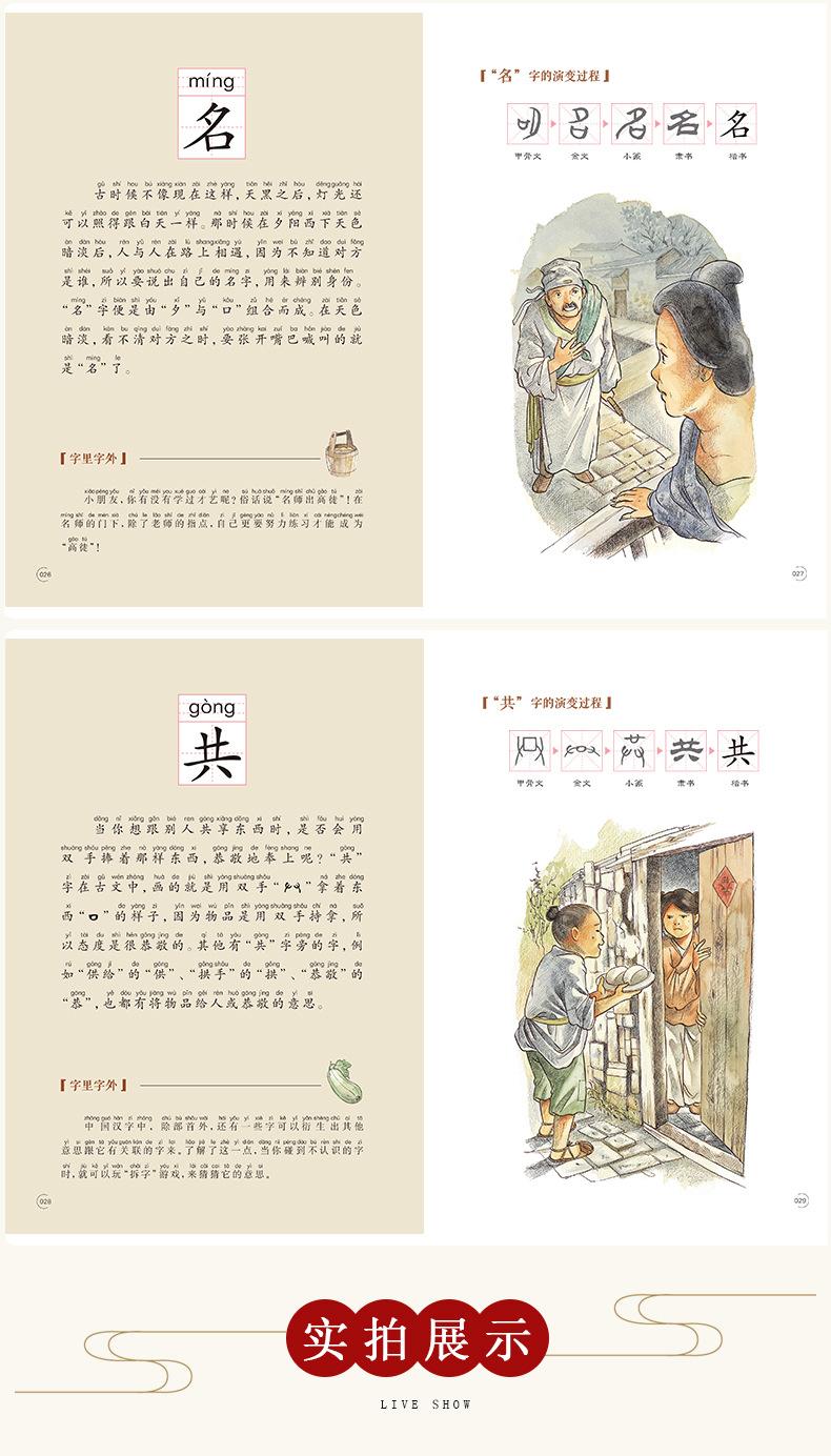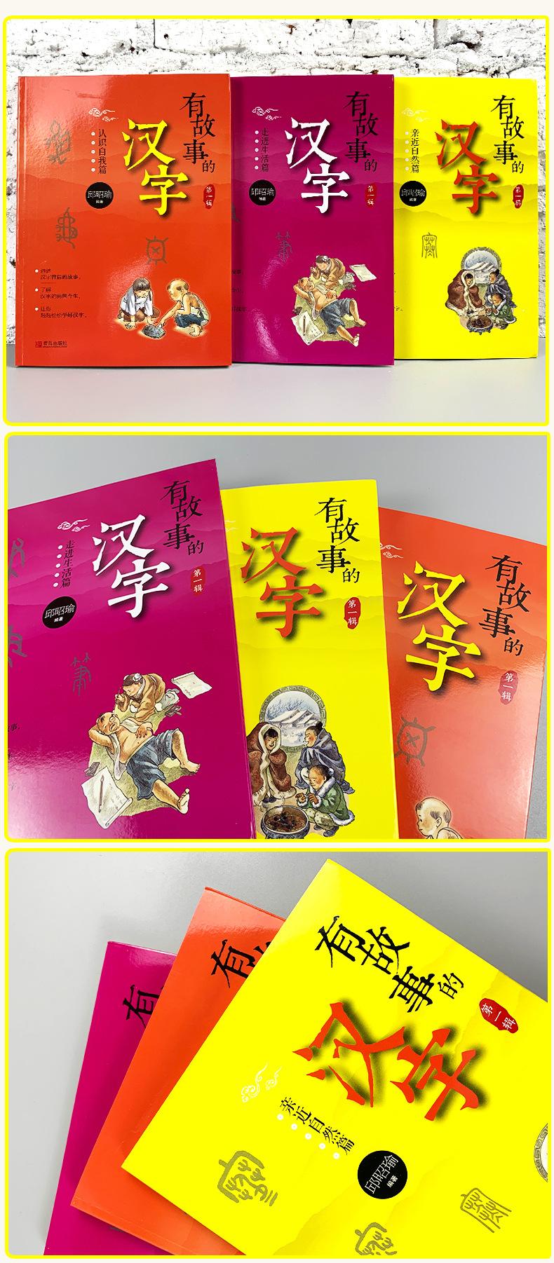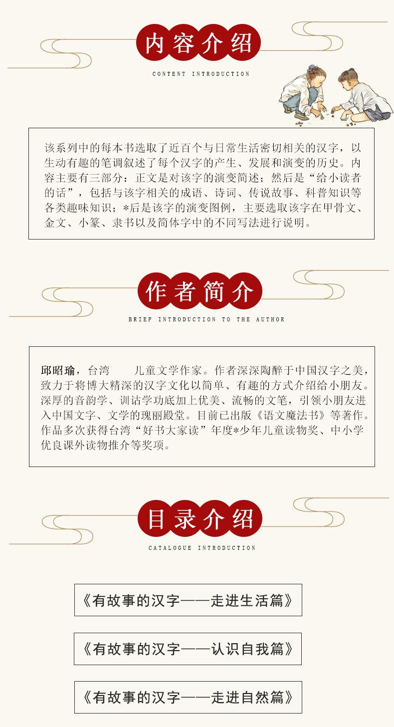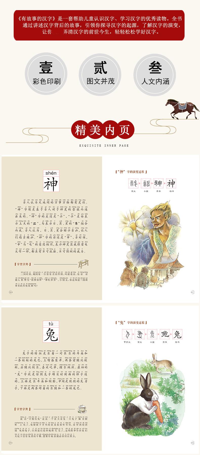Los caracteres chinos son la raíz de la cultura china y poseen una rica connotación humanística. La belleza de los caracteres chinos reside en sus formas y sus trazos elegantes y tortuosos. "Caracteres chinos con historias" (tres volúmenes) es un excelente libro para ayudar a los niños a reconocer y aprender los caracteres chinos. El libro selecciona más de 300 caracteres chinos estrechamente relacionados con el aprendizaje y la vida de los alumnos de primaria, y explica el significado original y el proceso de evolución de cada uno, para que los jóvenes lectores puedan comprender el pasado y el presente de cada carácter y aprenderlos fácilmente. Además, incluye una sección adicional para que los jóvenes lectores aprendan la aplicación específica de los caracteres chinos. El libro narra las raíces y los orígenes de los caracteres chinos en un tono relajado, e interpreta su forma y significado con bellas imágenes.