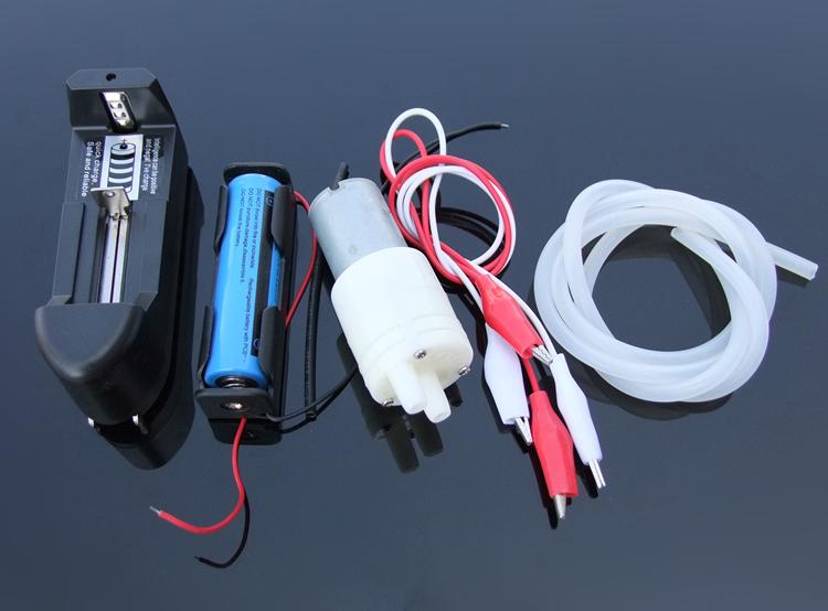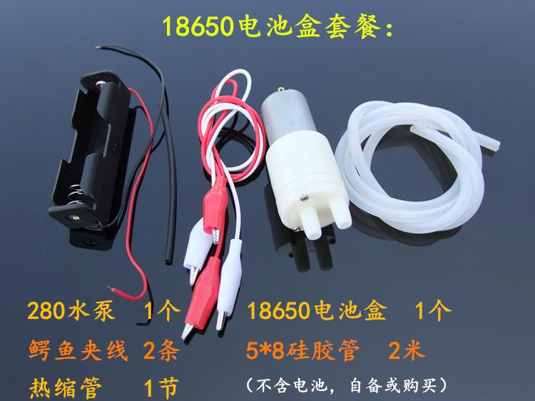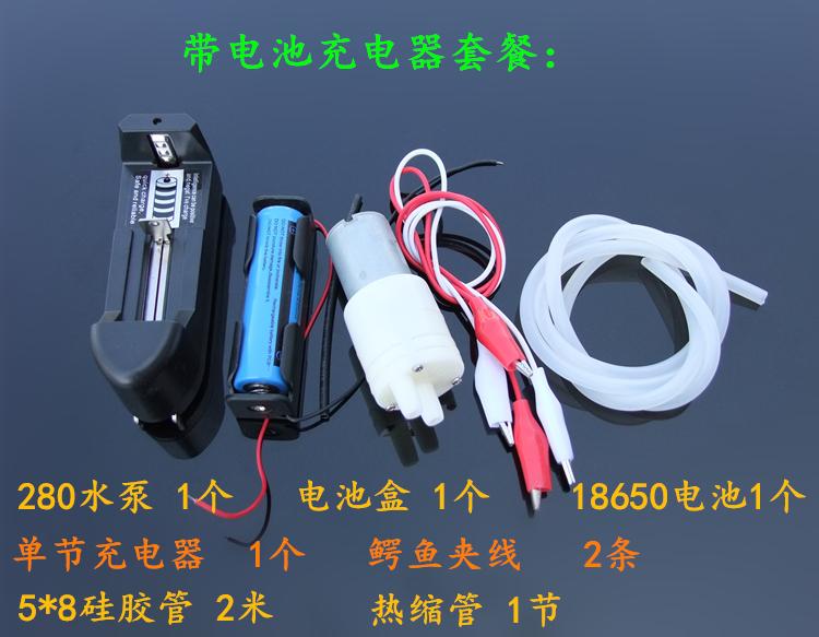 3. Paquete con cargador de batería: 280 bomba de agua + 1 caja de batería 18650 + 1 batería 18650 + cargador individual 18650 + 2 pinzas de cocodrilo + tubo de silicona 5*8 de 2 metros + 1 tubo termorretráctil