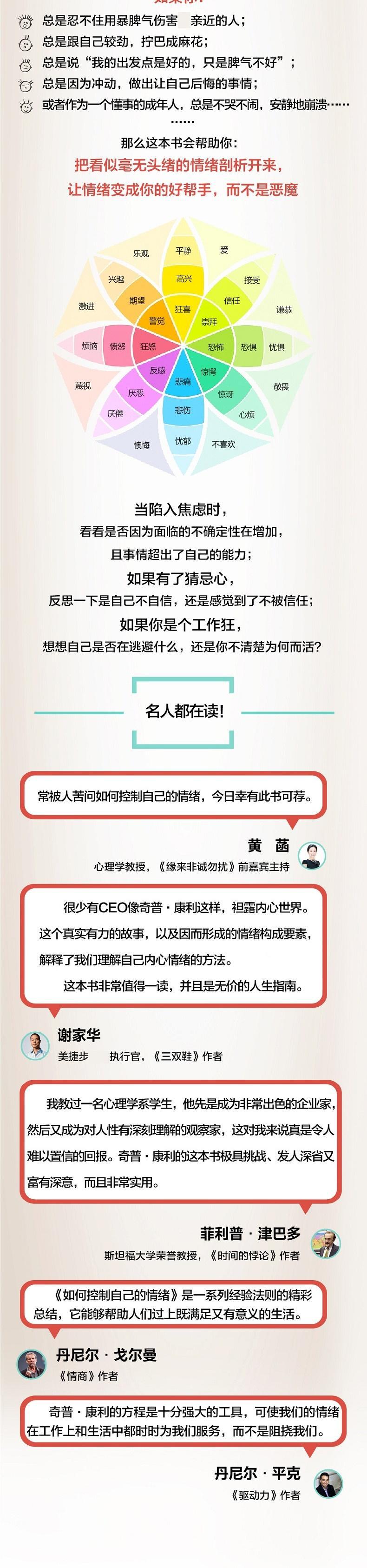 Una persona que es emocionalmente estable también debe ser una persona popular, feliz y exitosa. Si te complaces o alimentas las malas emociones, el resultado final será lastimarte a ti mismo, a otros, a tu corazón y a tu cuerpo. Pero las fluctuaciones emocionales de las personas son como un misterio, difíciles de predecir e incluso más difíciles de descifrar. Chip Conley, el autor de "¿Cómo controlar tus emociones (22 leyes de la gestión emocional)", es un empresario exitoso que una vez cayó en el mundo oscuro de las emociones negativas y fue incapaz de salir de él durante varios años, incluso al borde de la muerte. Más tarde, descubrió la ecuación emocional: Arrepentimiento = Decepción + Responsabilidad Desesperación = Sufrimiento - Significado Ansiedad = incertidumbre × impotencia Felicidad = lo que quieres / lo que quieres