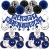 Bandera de cumpleaños azul marino, globo azul noche, juego de decoración de bolas de flores de papel, adornos colgantes en espiral con flores de estrella azul plateada
