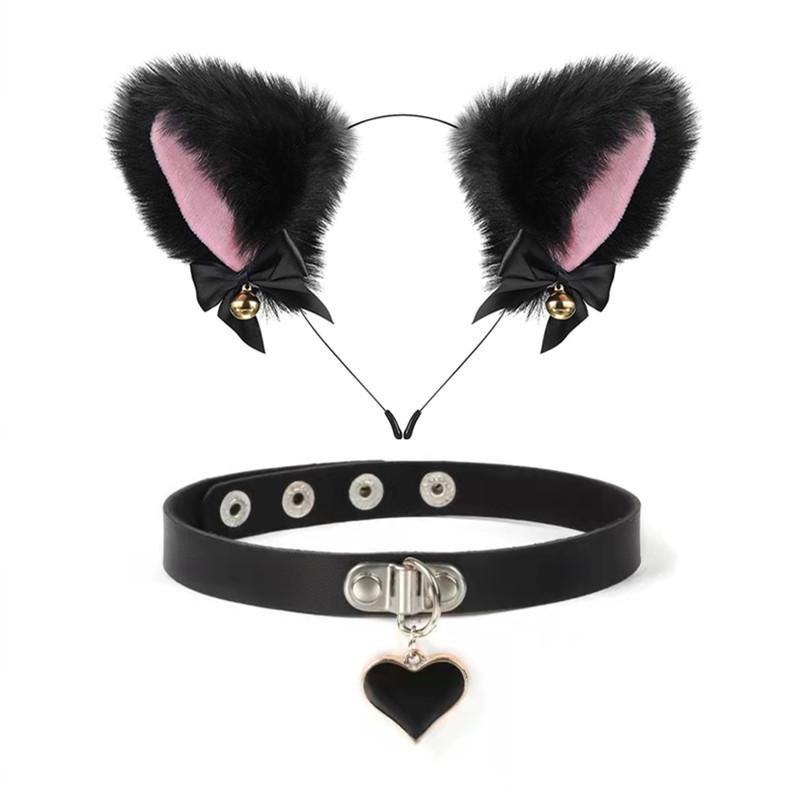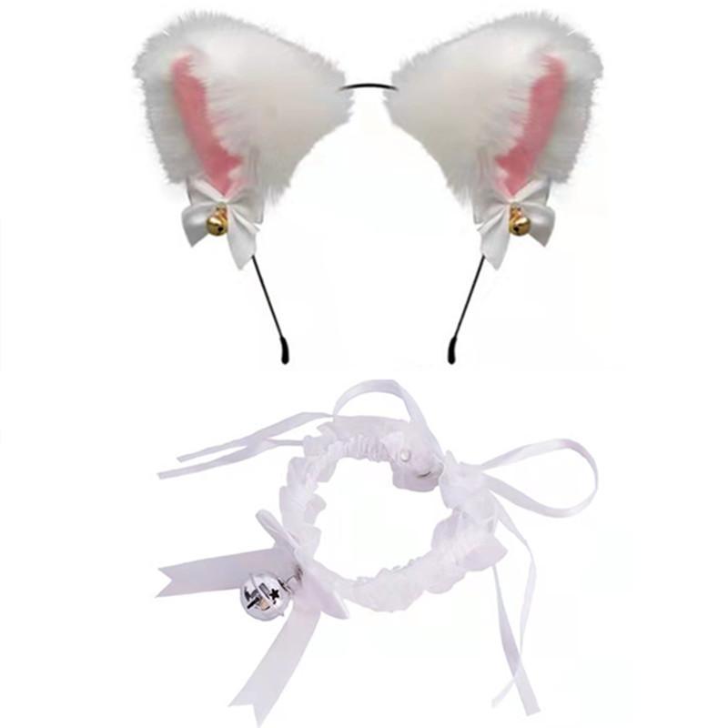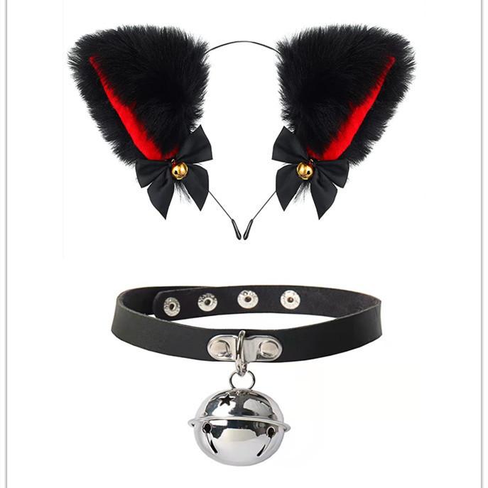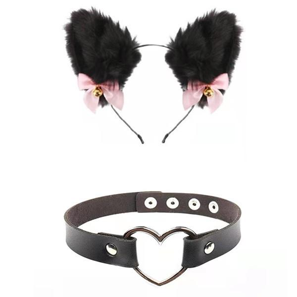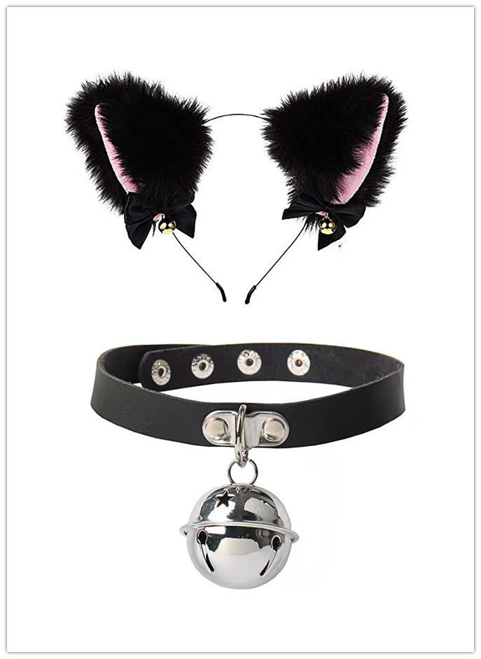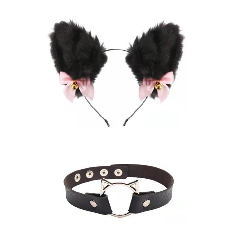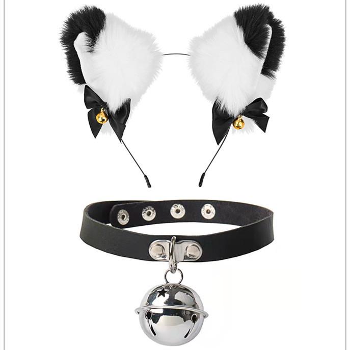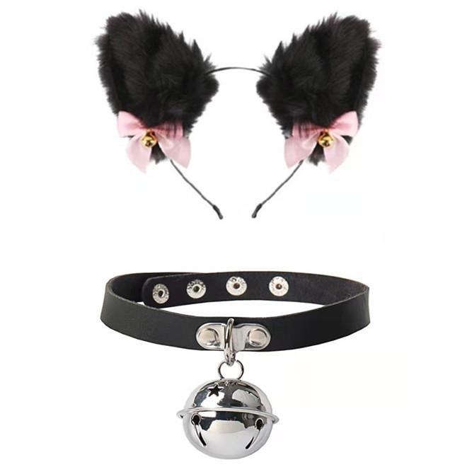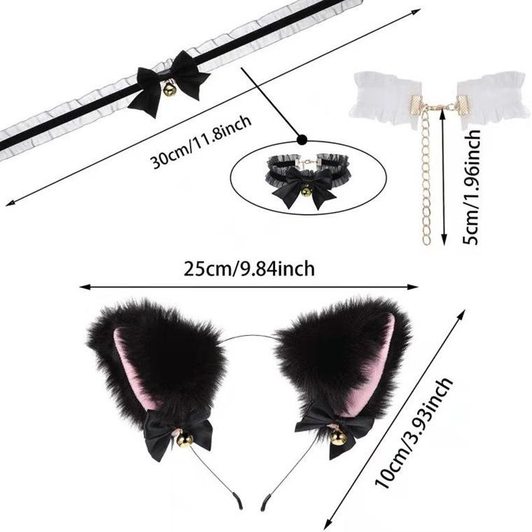 Black Cat Ears Bell Hair Band Plus Necklace, White Cat Ears Bell Headband Plus Necklace, Pure Black Pink Bow b...
