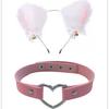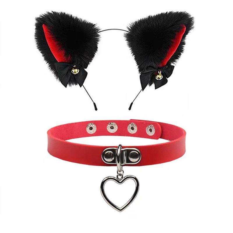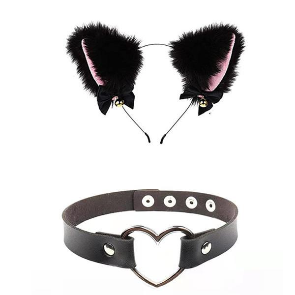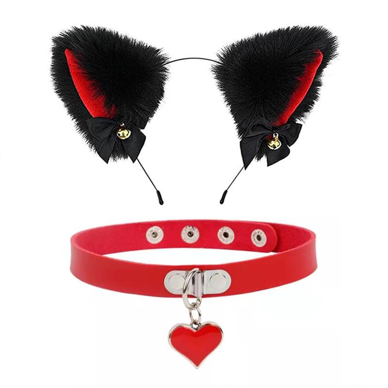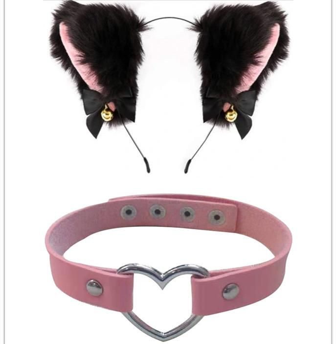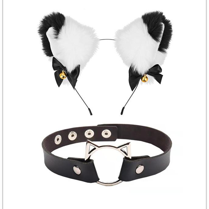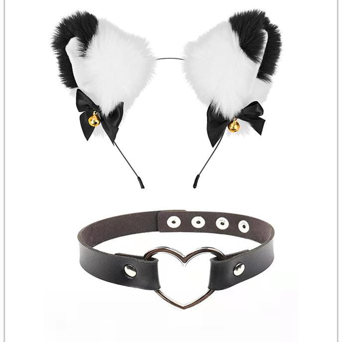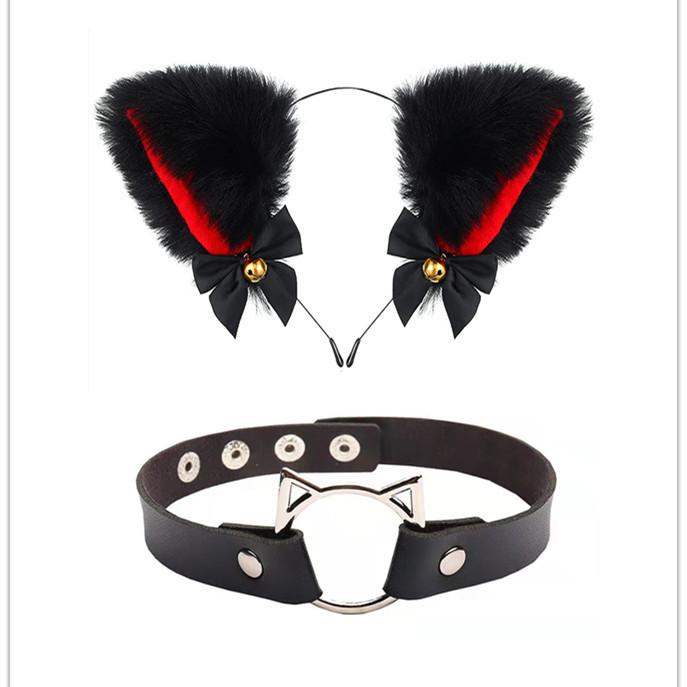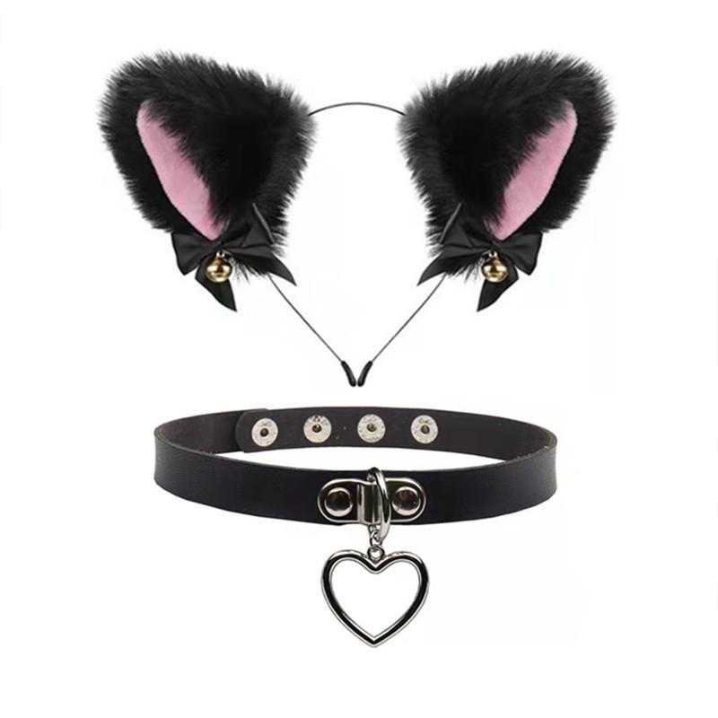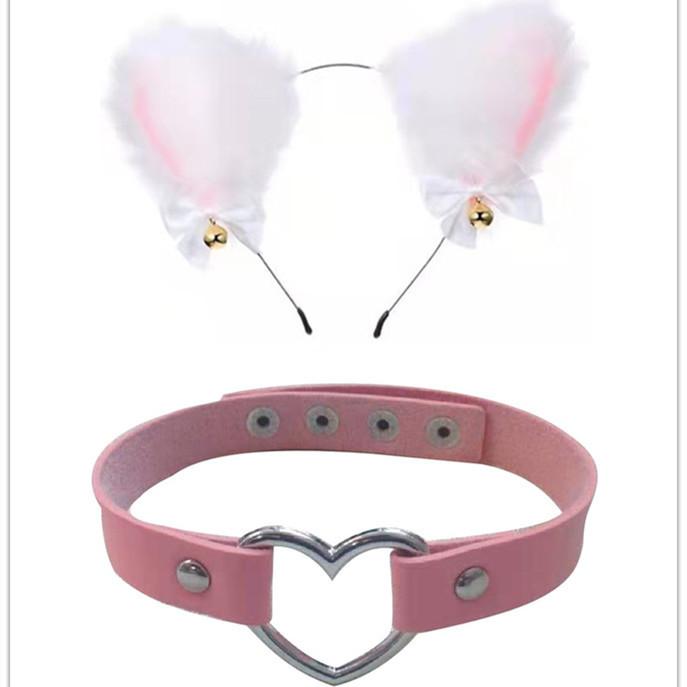 Black Cat Ears Bell Hair Band Plus Necklace, White Cat Ears Bell Headband Plus Necklace, Pure Black Pink Bow b...