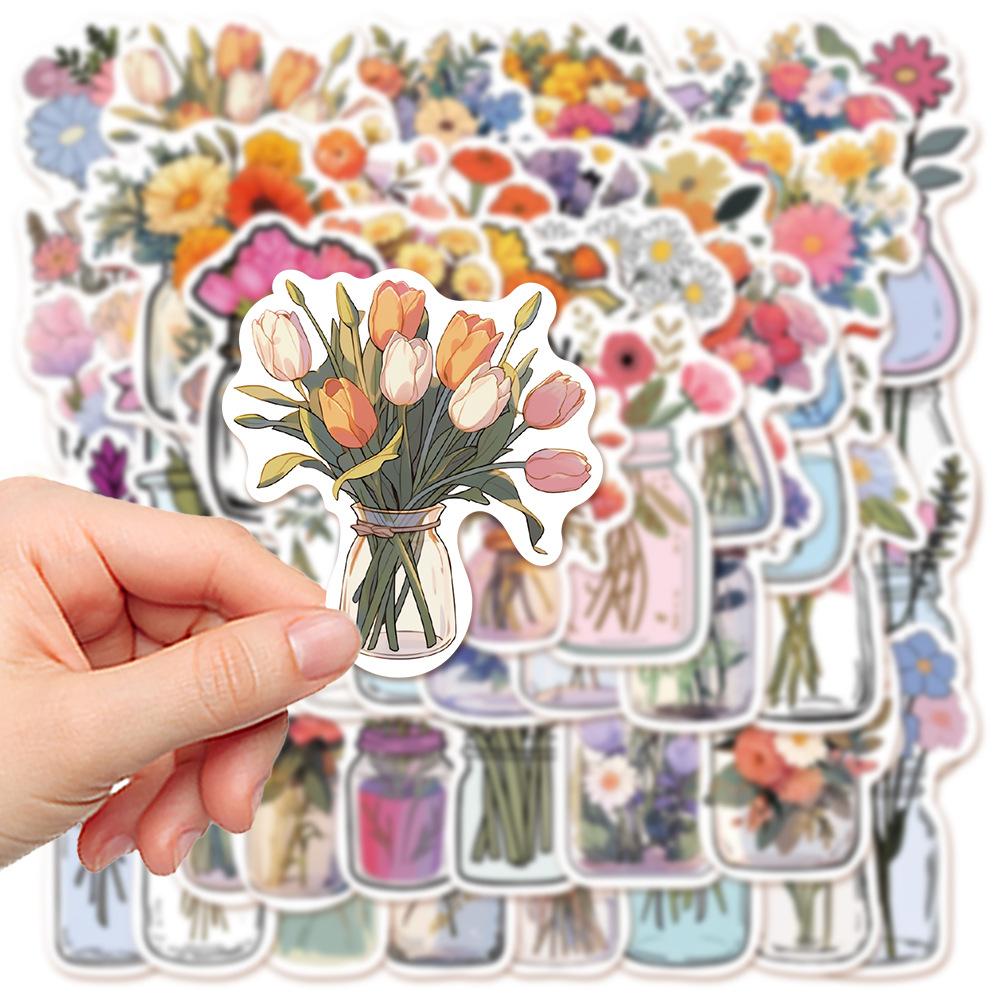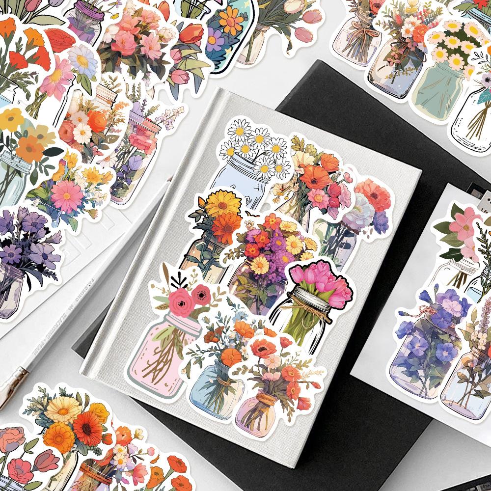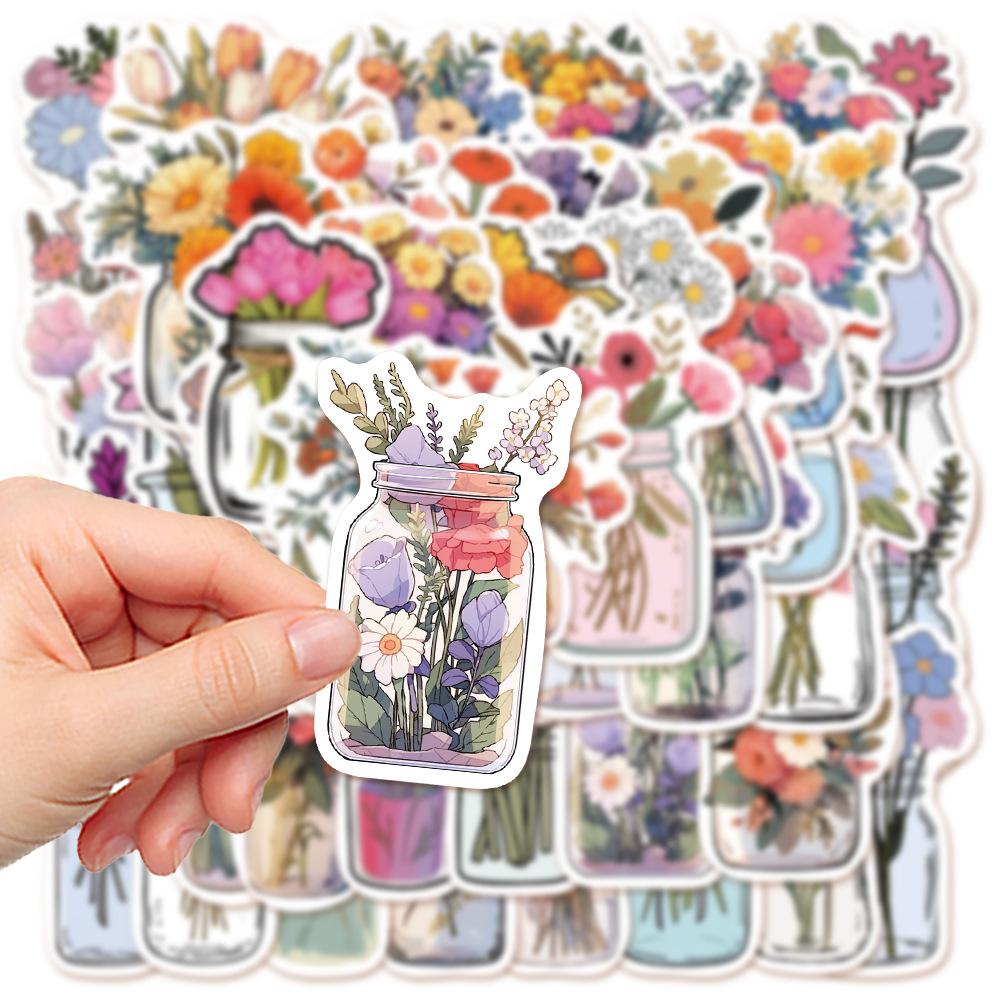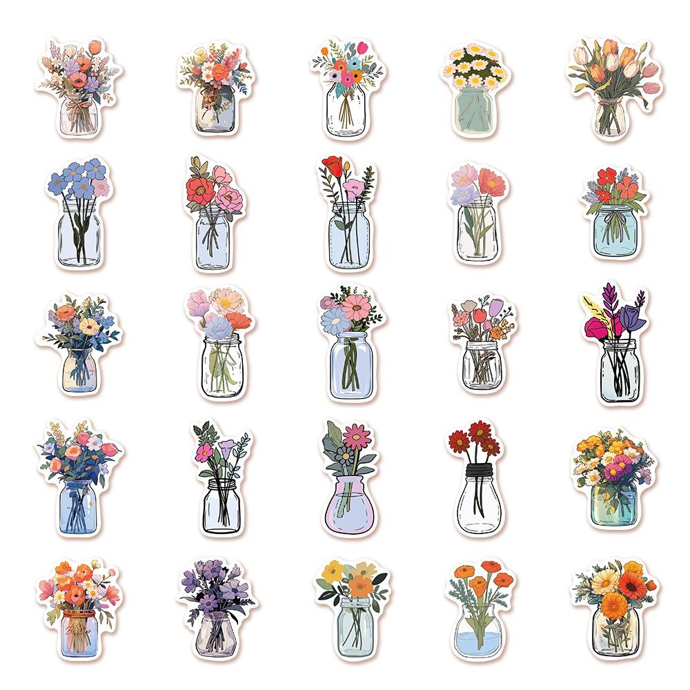 50 pequeñas pegatinas de flores frescas en una botella para portátil, notebook, teléfono móvil, pegatinas decorativas DIY con bordes transfronterizos.