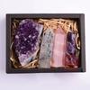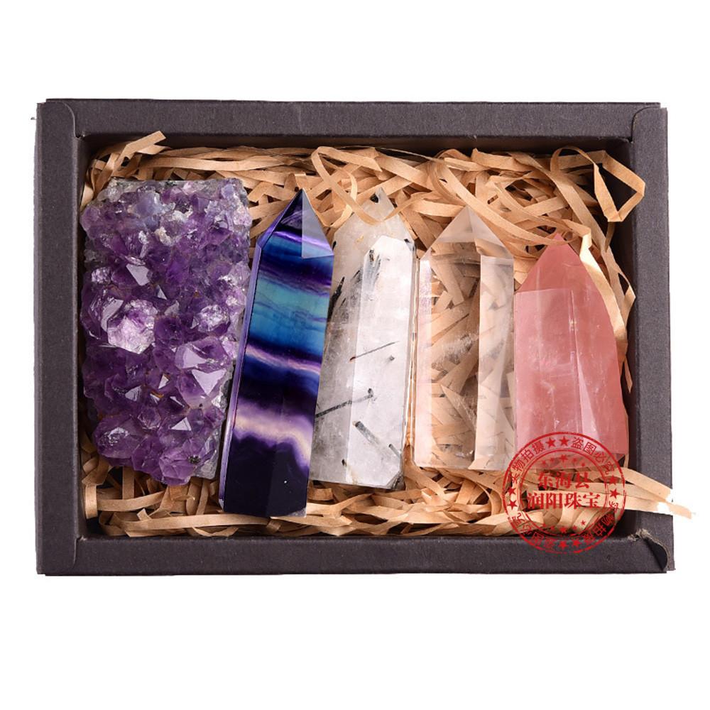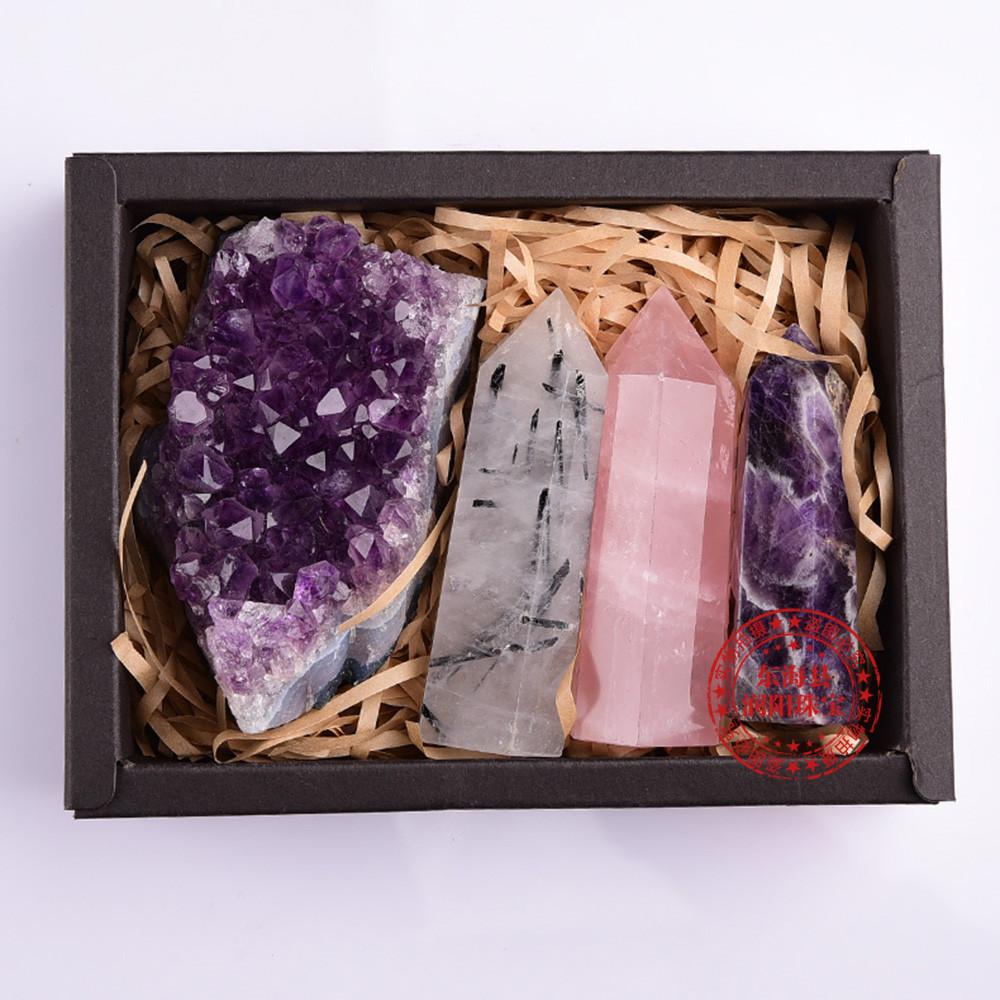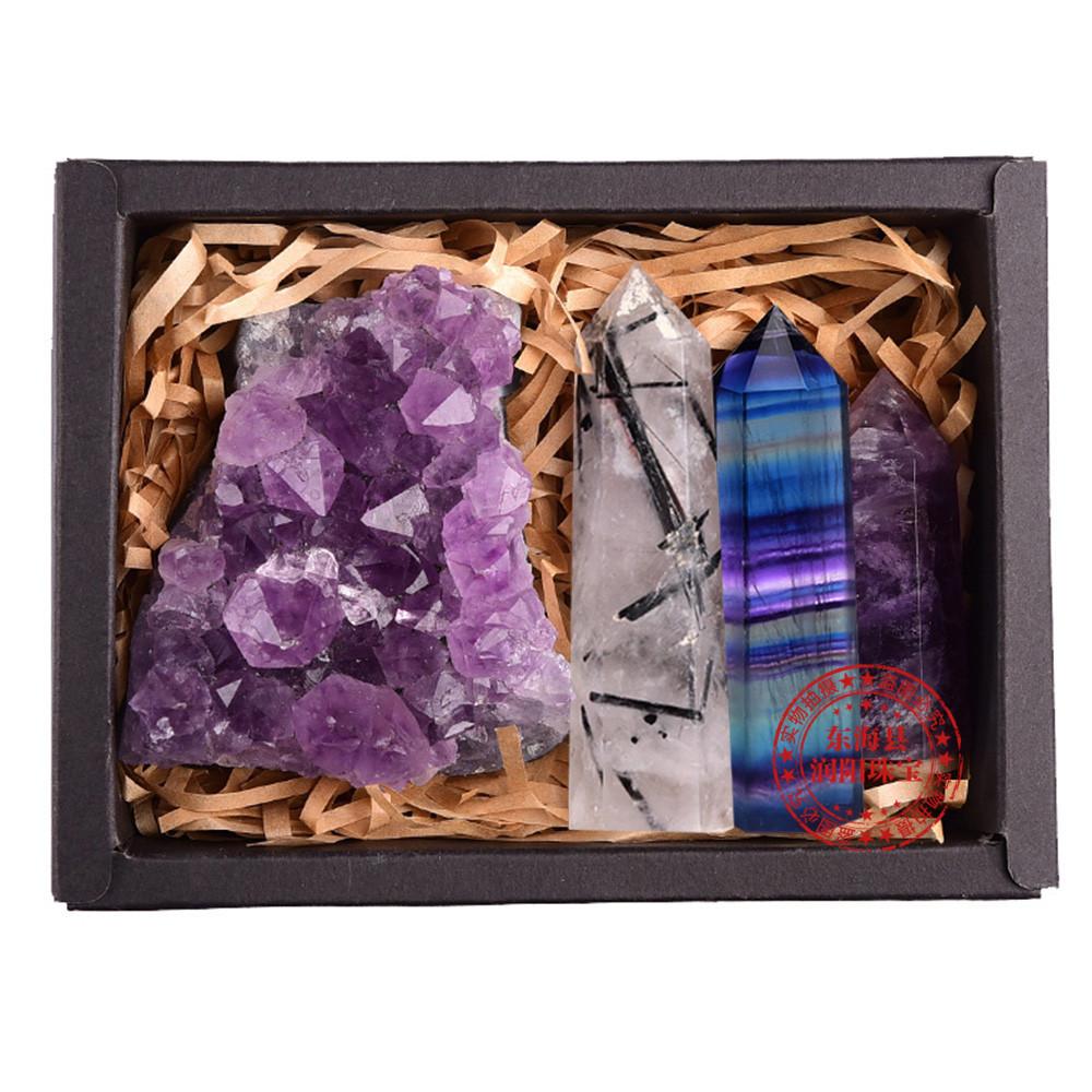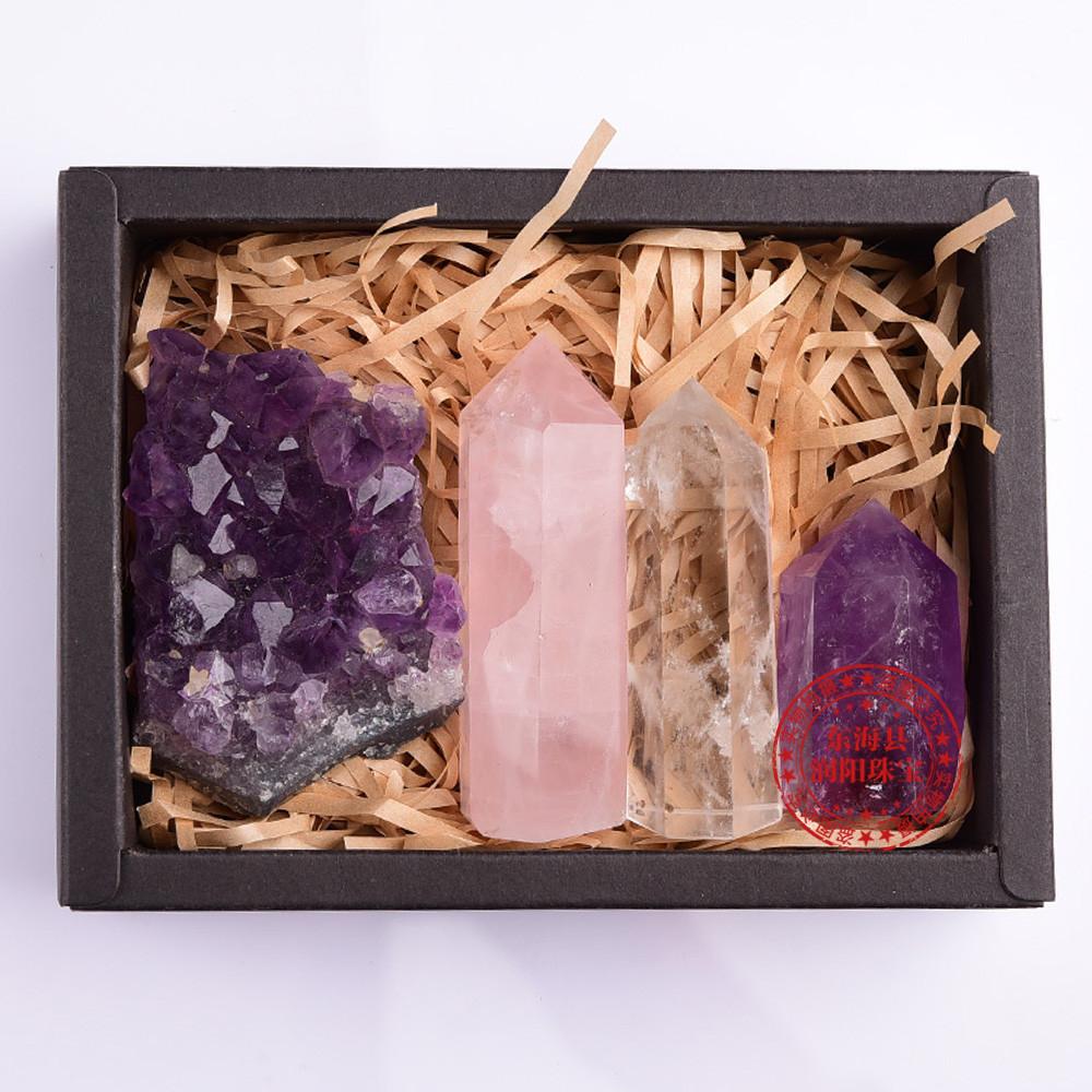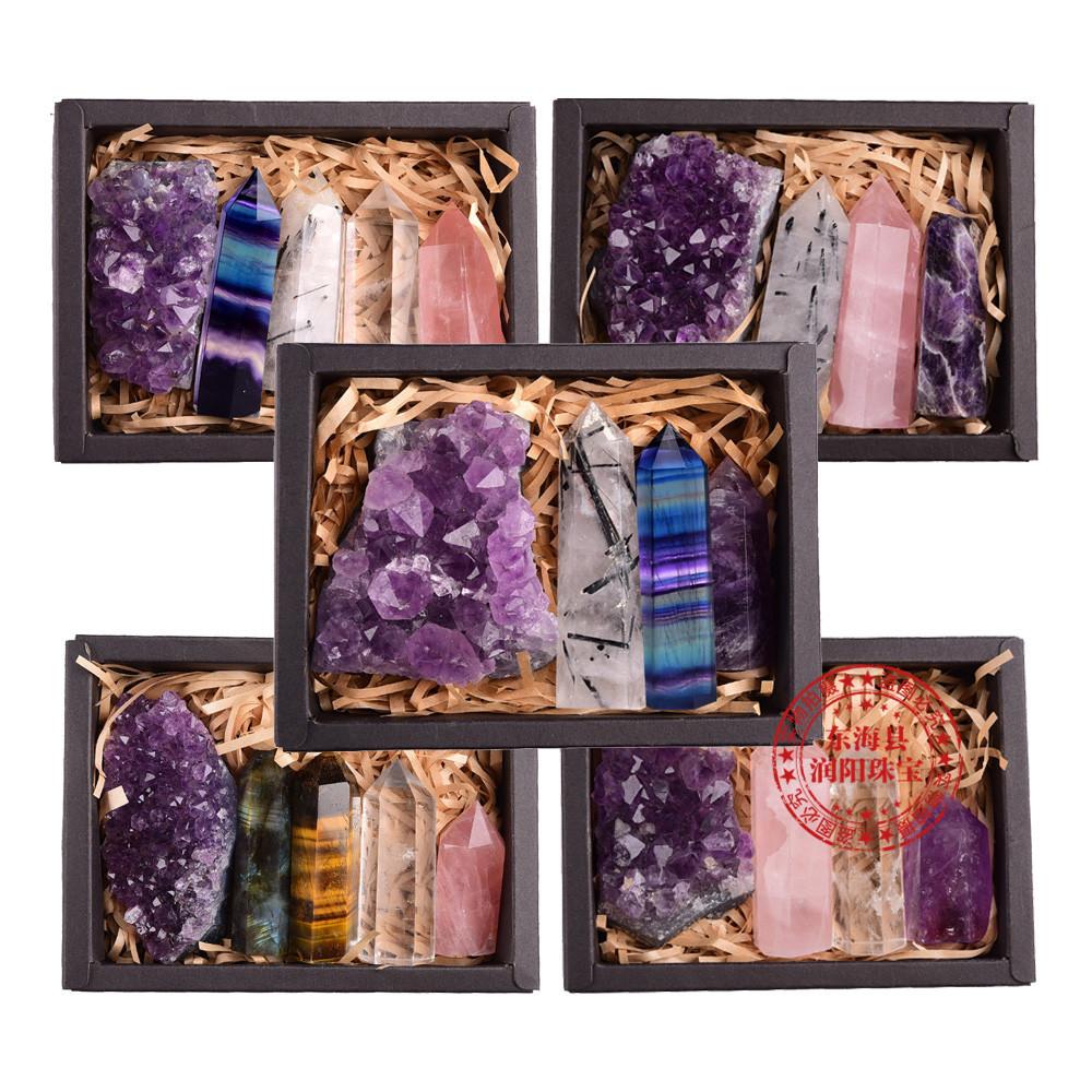 Set de racimo de amatista natural de Amazon transfronterizo Piedra en bruto Pulida Piedra energética Cristal Prisma hexagonal Caja de regalo Adornos