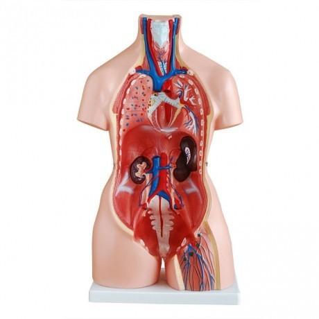 XC205 Modelo de Torso Intercambiable de Género 45CM (23 piezas) Este modelo de torso intercambiable de género es casi idéntico al modelo de torso intercambiable de género de 80 cm, pero tiene solo la mitad del tamaño. Tiene un valor didáctico muy alto. Está dividido en 23 piezas, mostrando: torso, cubierta de pecho femenino, cabeza, globos oculares, cerebro, un nervio espinal, pulmones (2 piezas), corazón (2 piezas), hígado, riñones, estómago (2 piezas), intestinos (4 piezas), órganos reproductores masculinos (2 piezas), órganos reproductores femeninos con feto (3 piezas).