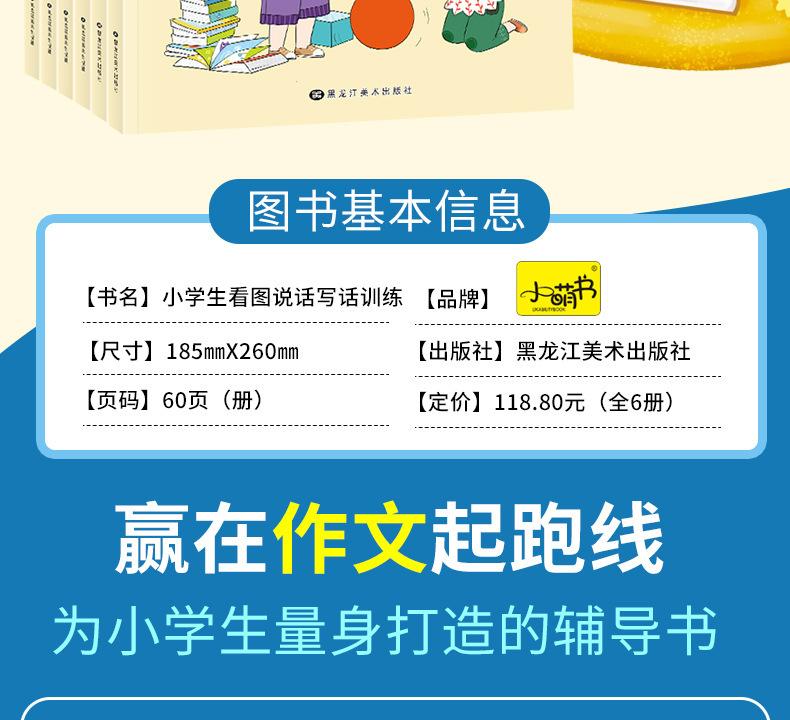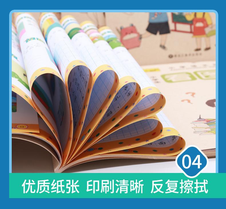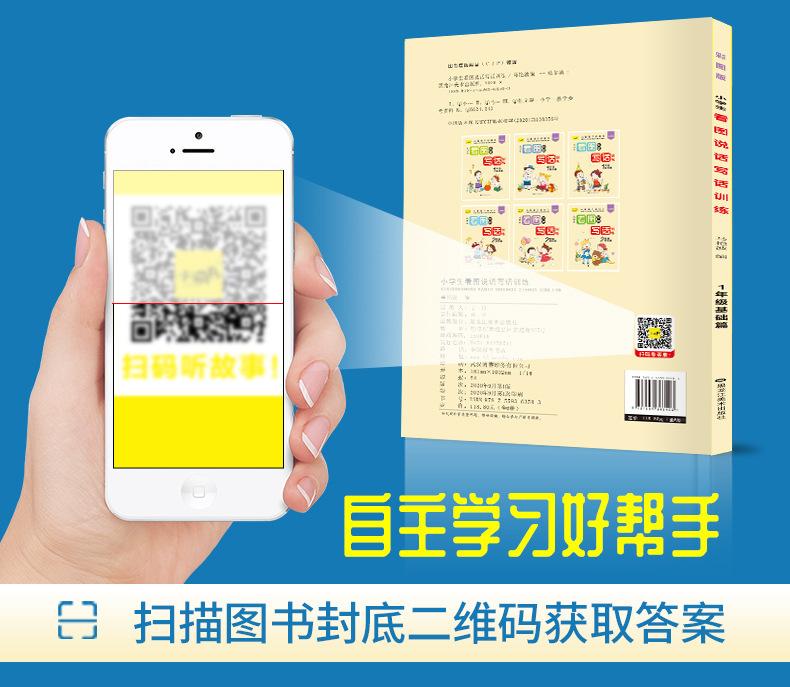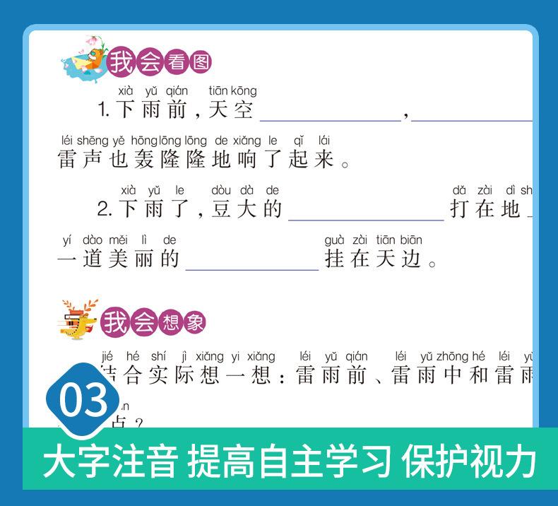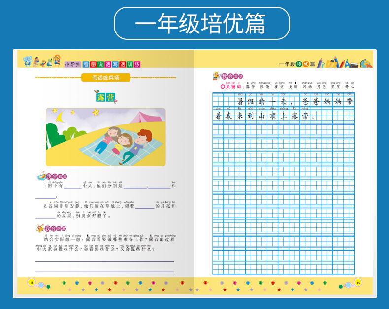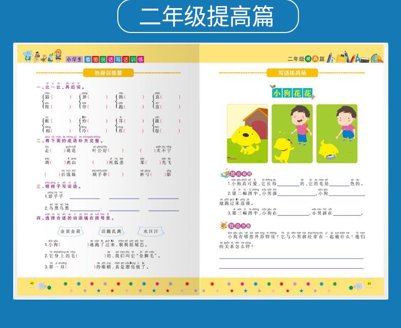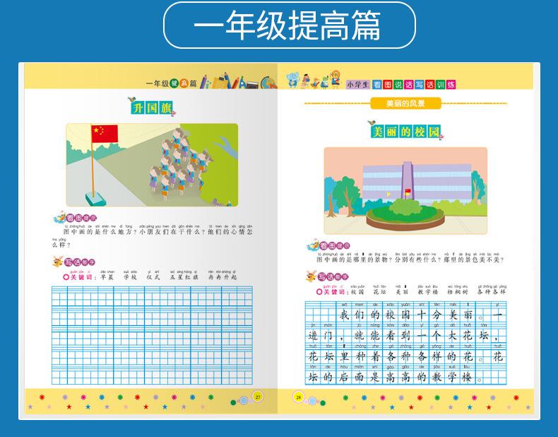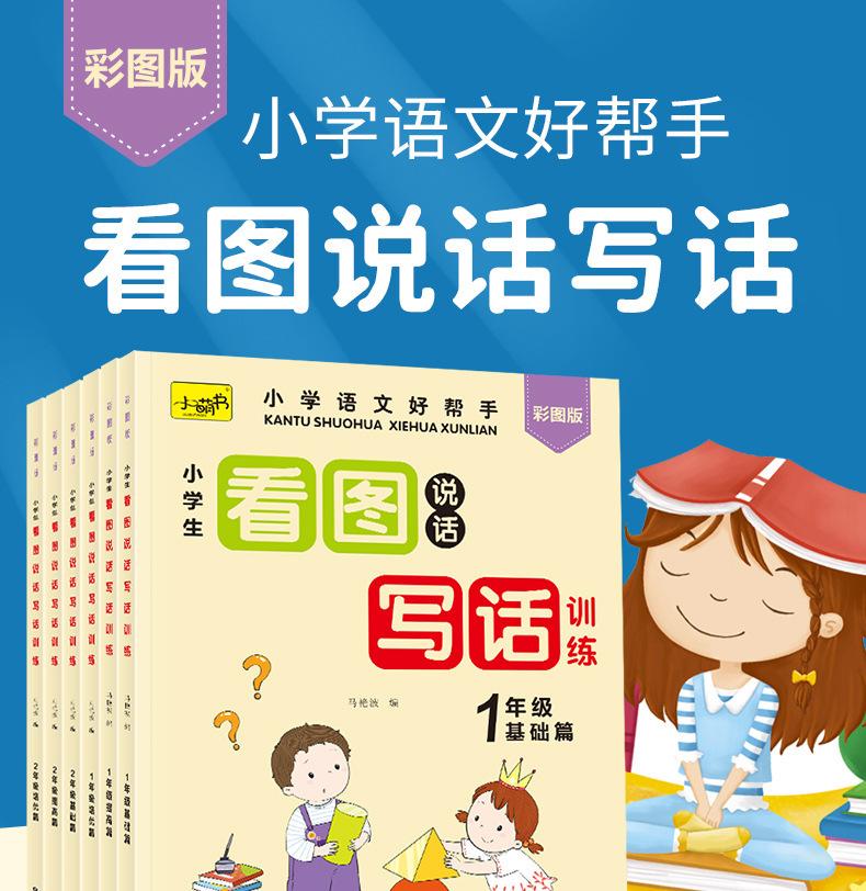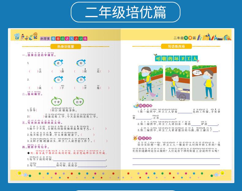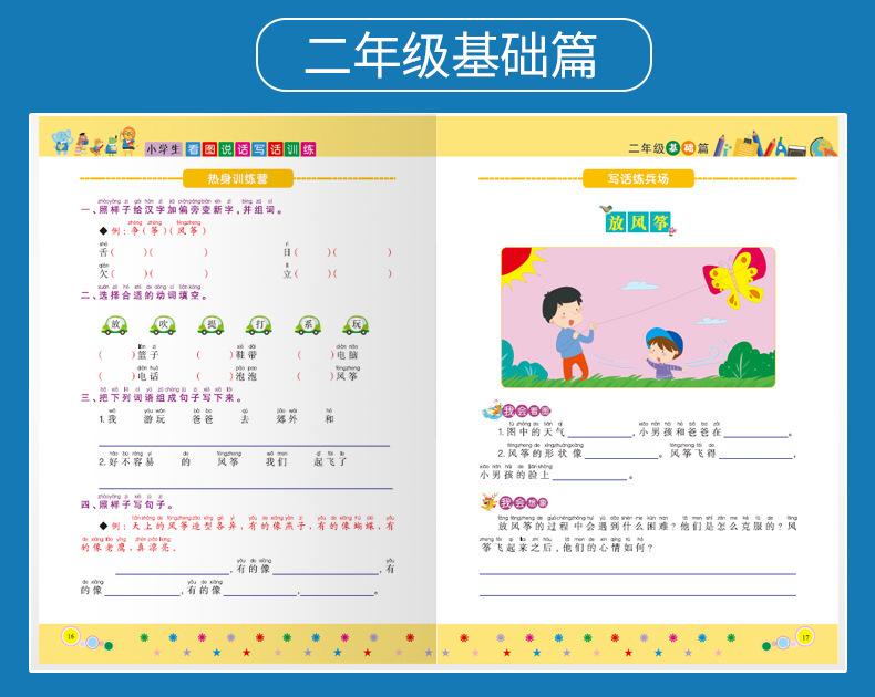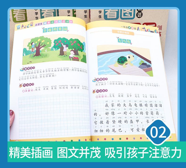 Estudiantes de primaria miran imágenes, hablan y escriben palabras, entrenamiento, primer grado, segundo grado, mirar imágenes, composición, versión a color, impresión clara, Libro Grande