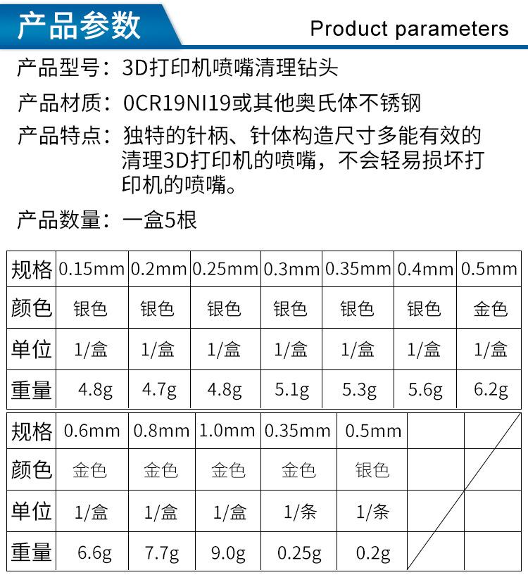 Accesorios para impresora 3D, boquilla MK8, limpiador de boquillas E3D, limpiador de agujas de acero, aguja perforadora de acero inoxidable y latón.