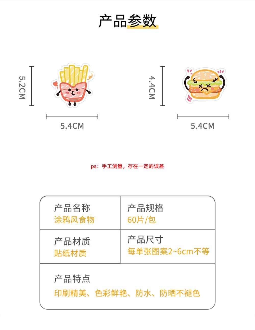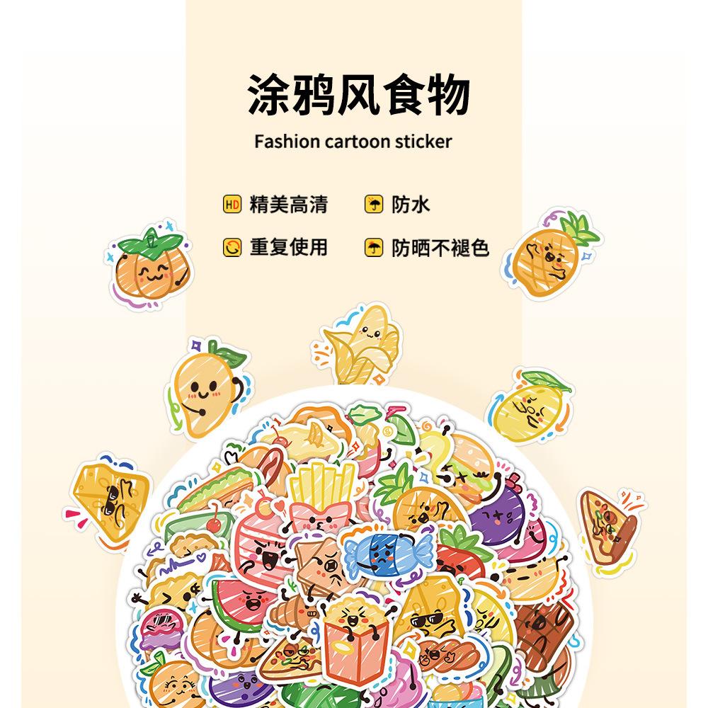 60 pegatinas de snacks para niños de comida estilo grafiti de dibujos animados, decorativas para funda de teléfono móvil, vaso de agua, guitarra, material de pegatinas impermeables