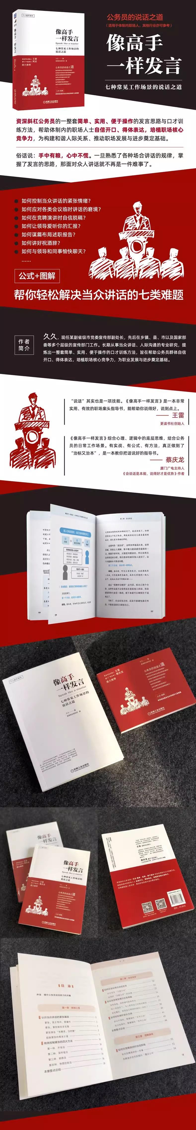 La expresión y comunicación de los funcionarios públicos no es solo una simple expresión de voluntad personal, sino más bien una externalización y encarnación del comportamiento laboral, con requisitos especiales. Este libro combina las escenas laborales comunes de los funcionarios públicos, desglosa, demuestra y analiza muchos casos reales del lugar de trabajo, explora las características y reglas del habla, y proporciona a los funcionarios públicos fórmulas y métodos para "hablar bien". Como dice el refrán: Si tienes comida en las manos, no te asustarás. Una vez que estés familiarizado con las reglas del habla en diversas ocasiones y domines las ideas para hablar, ya no será una tarea difícil hablar en público.