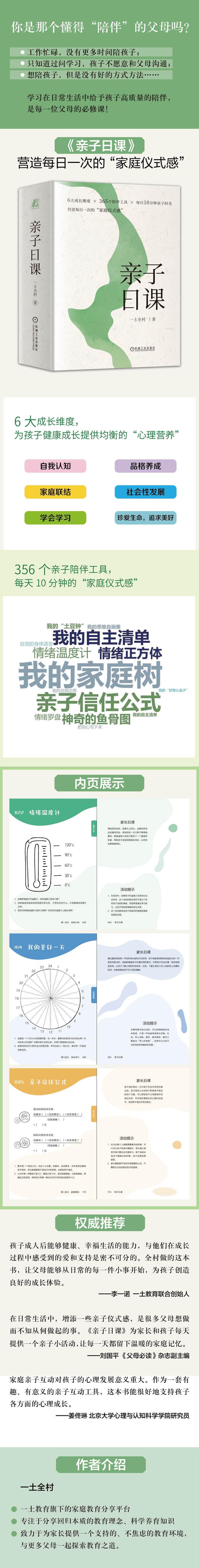 365 herramientas de acompañamiento padre-hijo para ayudar a los niños a crecer en 6 aspectos. Proporcionar a los padres una herramienta de acompañamiento padre-hijo de alta calidad cada día para guiar a padres e hijos a llevar a cabo interacciones educativas padre-hijo, y promover el crecimiento de los niños desde 6 dimensiones: "autoconocimiento", "conexión familiar", "aprender a aprender", "desarrollo del carácter", "desarrollo social" y "apreciar la vida y perseguir la belleza". 10 minutos al día para crear un "sentido ritual familiar" diario. Guiar a los padres para llevar a cabo 10 minutos de interacción valiosa padre-hijo con sus hijos cada día, y crear un sentido ritual de acompañamiento padre-hijo único perteneciente a su propia familia. Recomendado conjuntamente por expertos autorizados en educación y psicología. ¡Li Yinuo, cofundador de Yitu Education, Liu Guoping, subdirector de la revista "Parents Must Read", y Jiang Tonglin, investigador de la Escuela de Psicología y Ciencia Cognitiva de la Universidad de Pekín, recomendaron conjuntamente!