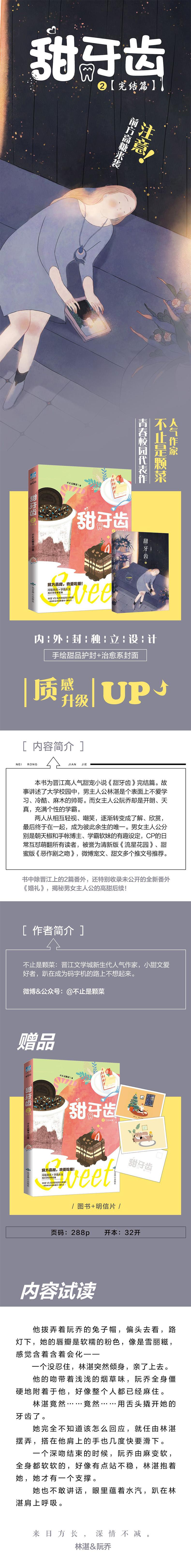 Este libro es el capítulo final de la popular novela Jinjiang de mascotas dulces "Dientes Dulces". La historia cuenta que en un campus universitario, el protagonista masculino Lin Zhan es un chico guapo que parece ser poco estudioso, frío y apático. La protagonista femenina Ruan Qiao es alegre, inocente y llena de personalidad. Los dos pasaron gradualmente de despreciarse y burlarse mutuamente a comprenderse y apreciarse, y finalmente se juntaron y se convirtieron en el exclusivo del otro por el resto de sus vidas. Los protagonistas masculino y femenino son configuraciones interesantes de un bloguero manuscrito y una chica popular de la escuela. Las bromas diarias de la pareja son tan lindas que todos los lectores están abrumados. Es aclamada como una versión fresca de "Meteor Garden" y una versión dulce de "It Started with a Kiss". Es recomendada por múltiples artículos de mascotas y artículos dulces de Weibo. Además de los 2 extras en Jinjiang, el libro también incluye especialmente un nuevo extra inédito "Boda", ¡revelando el dulce seguimiento de los protagonistas masculino y femenino!