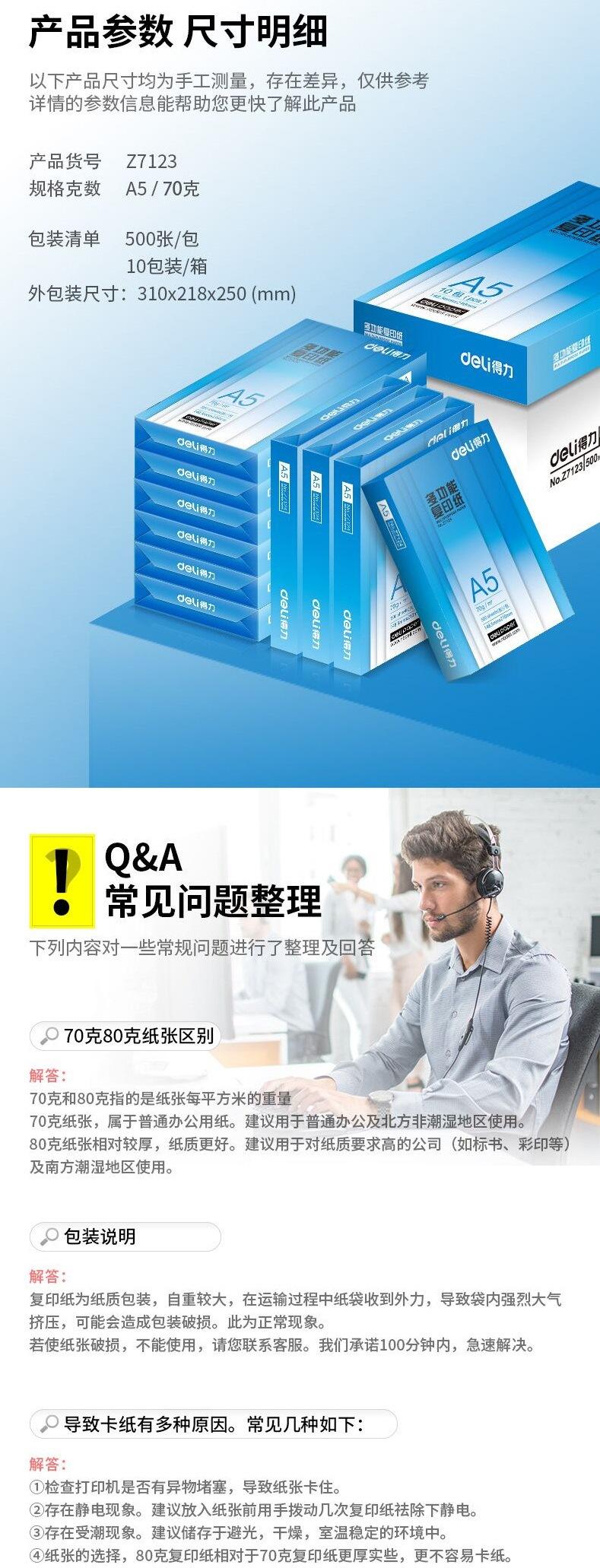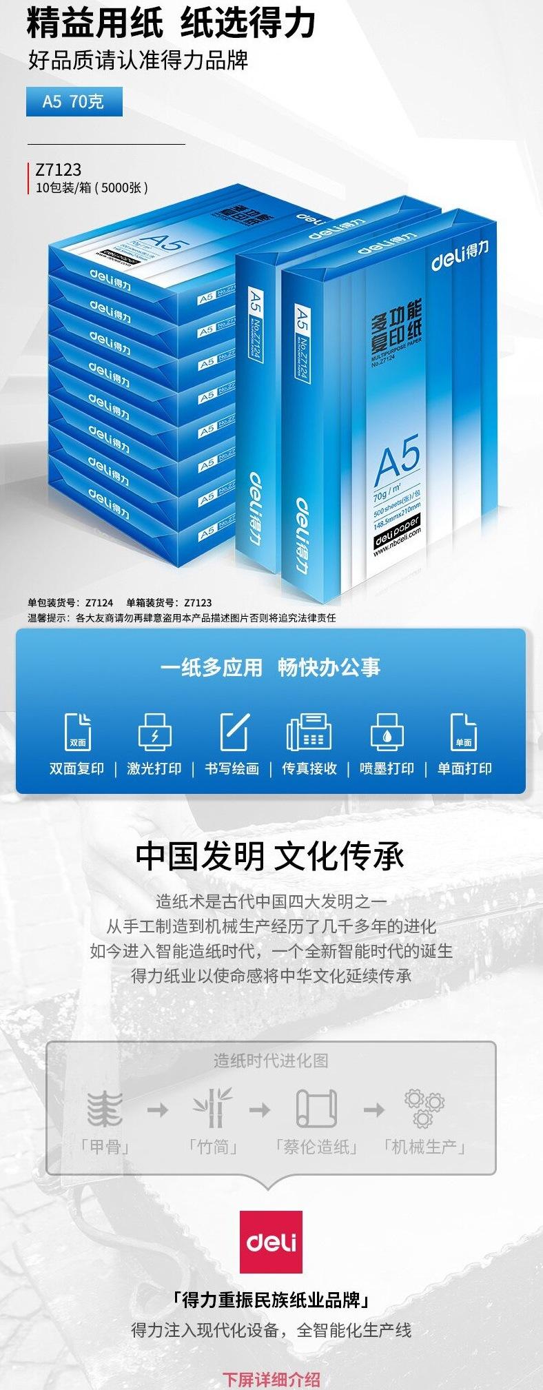 Deli Z7123 papel de impresión papel de copia A5 impresión a doble cara papel blanco oficina hogar 70g papel borrador papel blanco