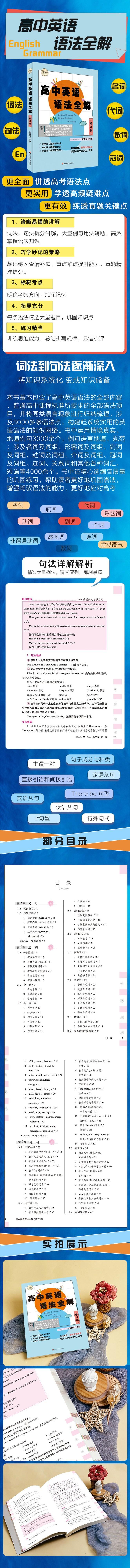 Este libro cubre básicamente todos los contenidos de gramática inglesa en las escuelas secundarias y todos los puntos gramaticales requeridos por los recientes nuevos estándares del currículo de inglés. También resume y clasifica fenómenos lingüísticos similares, involucrando más de 3,000 puntos gramaticales, y construye una red de conocimiento sistemática y práctica de la gramática inglesa. El libro utiliza más de 3,000 ejemplos auténticos con situaciones reales. Las oraciones de ejemplo son auténticas y estandarizadas; involucra más de 4,000 sustantivos y frases, adjetivos y frases, adverbios y frases, verbos y frases, preposiciones y frases, artículos y frases, conjunciones, palabras relativas y otras diversas palabras y frases. El libro también selecciona cuidadosamente ejercicios de consolidación de alta calidad para ayudar a los lectores a consolidar mejor la gramática, mejorar su capacidad para dominar la gramática y afrontar mejor el examen de admisión a la universidad.