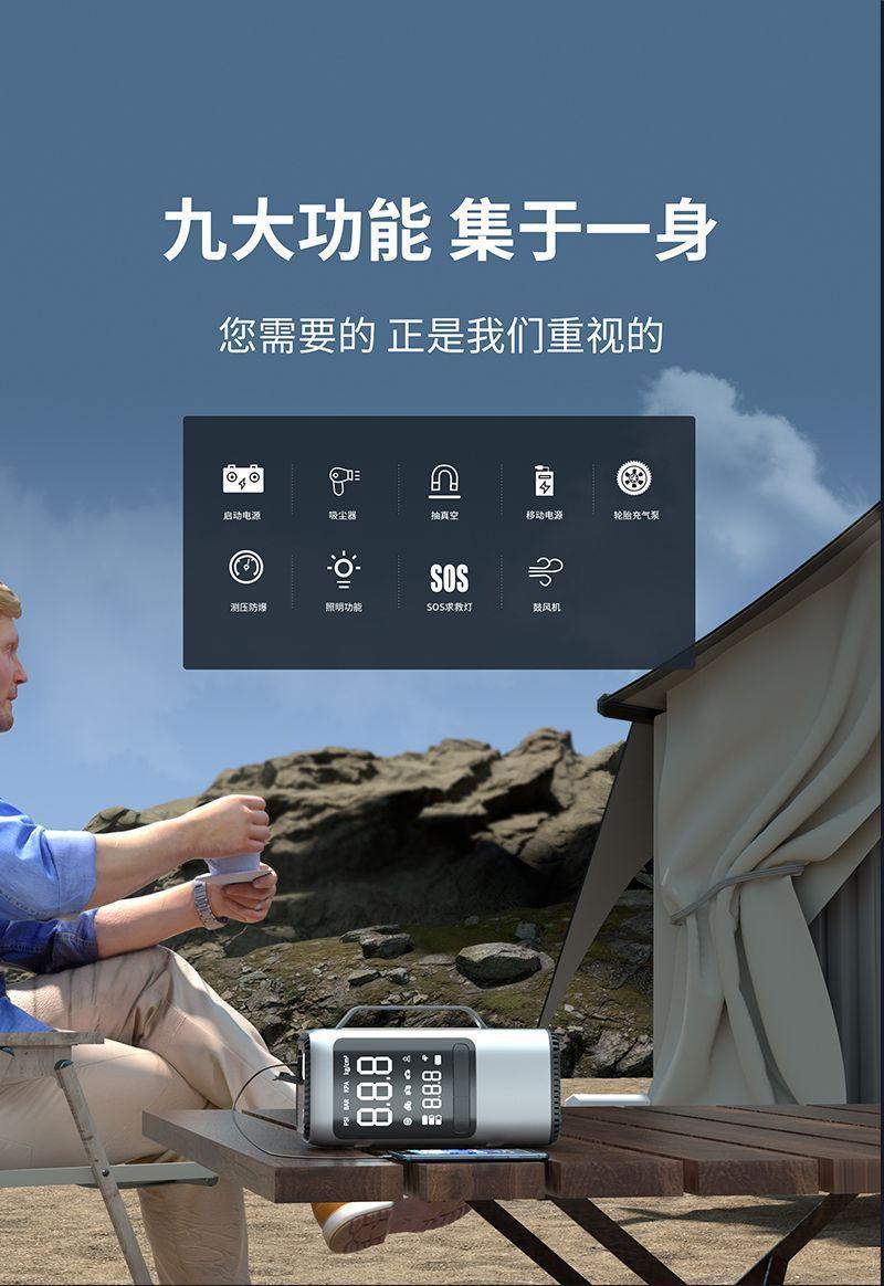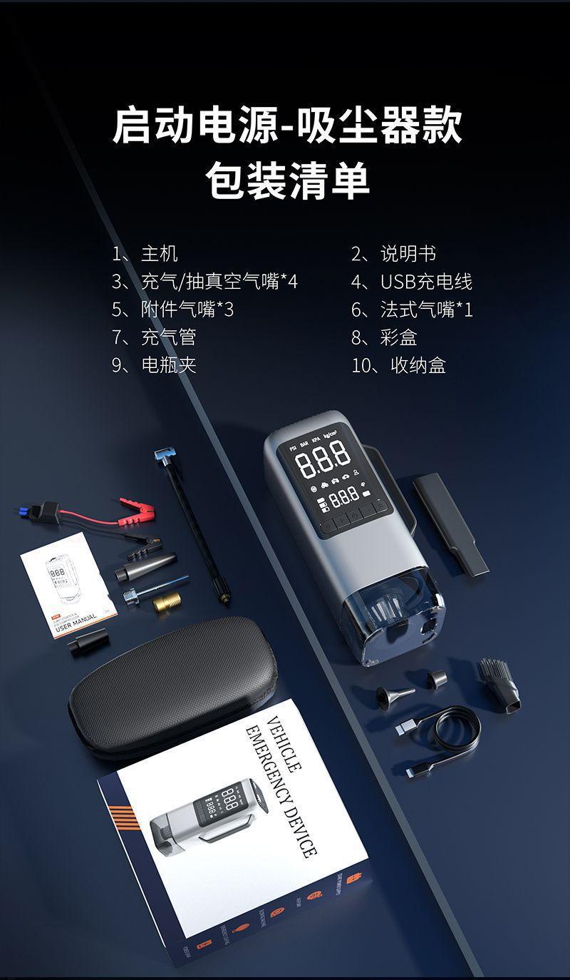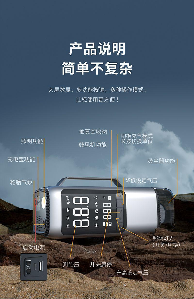 Lighting, Tire pressure gauge, Warning light, vacuuming, water absorption, USB charging