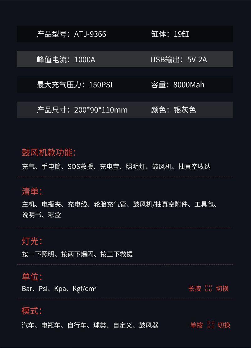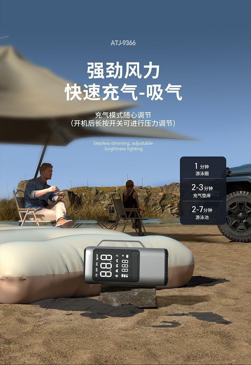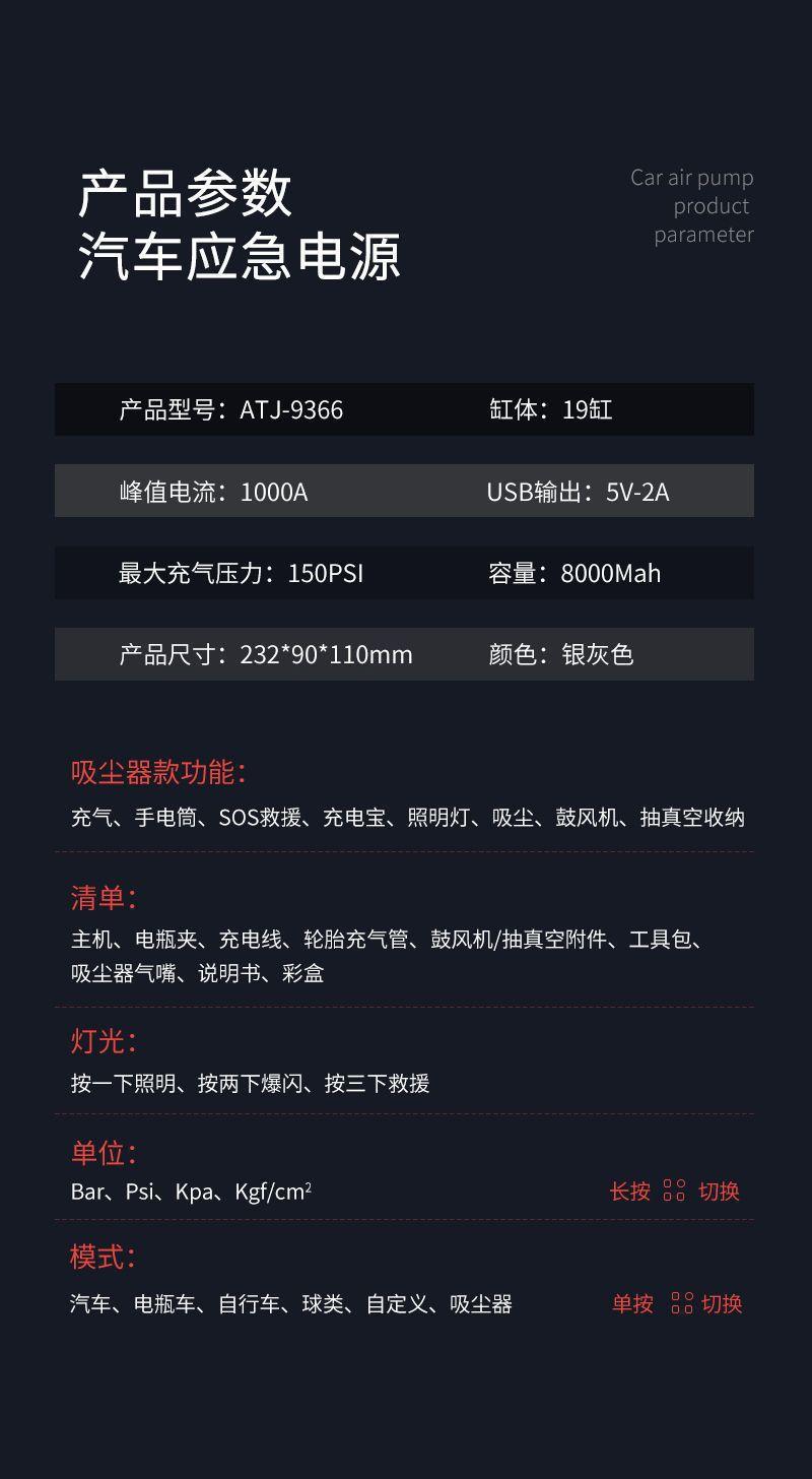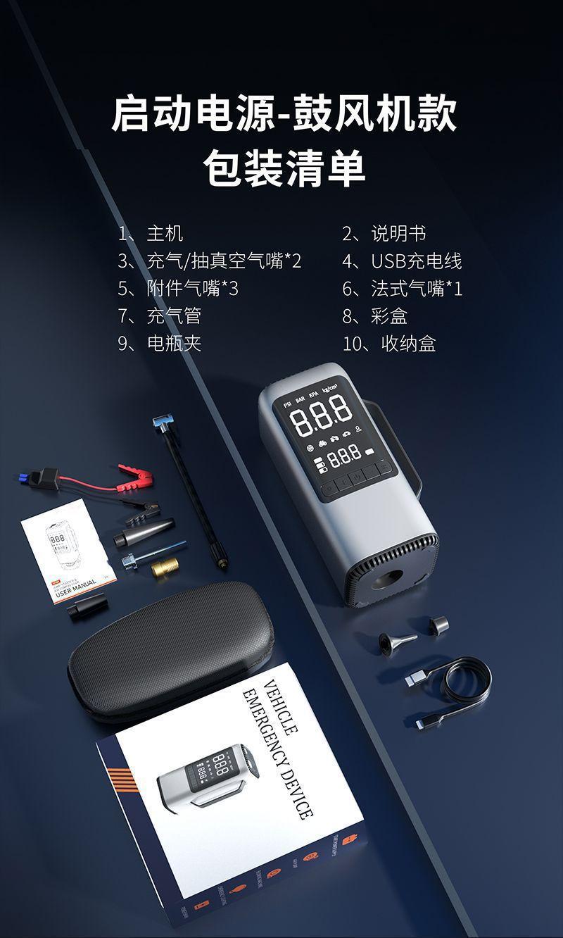 Lighting, Tire pressure gauge, Warning light, vacuuming, water absorption, USB charging