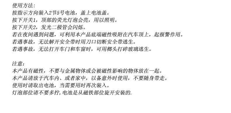 [Descripción del producto]: Este producto se utiliza para la advertencia de averías nocturnas y la evacuación en caso de accidente de tráfico, y también puede utilizarse como equipo de iluminación general. 1. Martillo salvavidas/martillo de seguridad: Un martillo afilado y resistente, utilizado para romper cristales y escapar en caso de accidente. 2. Cuchilla de corte: Hoja incrustada en forma de gancho, utilizada para cortar el cinturón de seguridad y escapar en caso de accidente. 3. Linterna: Ubicada en la parte delantera del mango, con un interruptor independiente que puede proporcionar iluminación continua. 4. Luz de advertencia: Ubicado en el mango, hay un interruptor independiente que puede parpadear luces de advertencia rojas (o alternar rojo y azul). El cabezal magnético del producto puede ser atraído al techo del coche para actuar como una alarma.