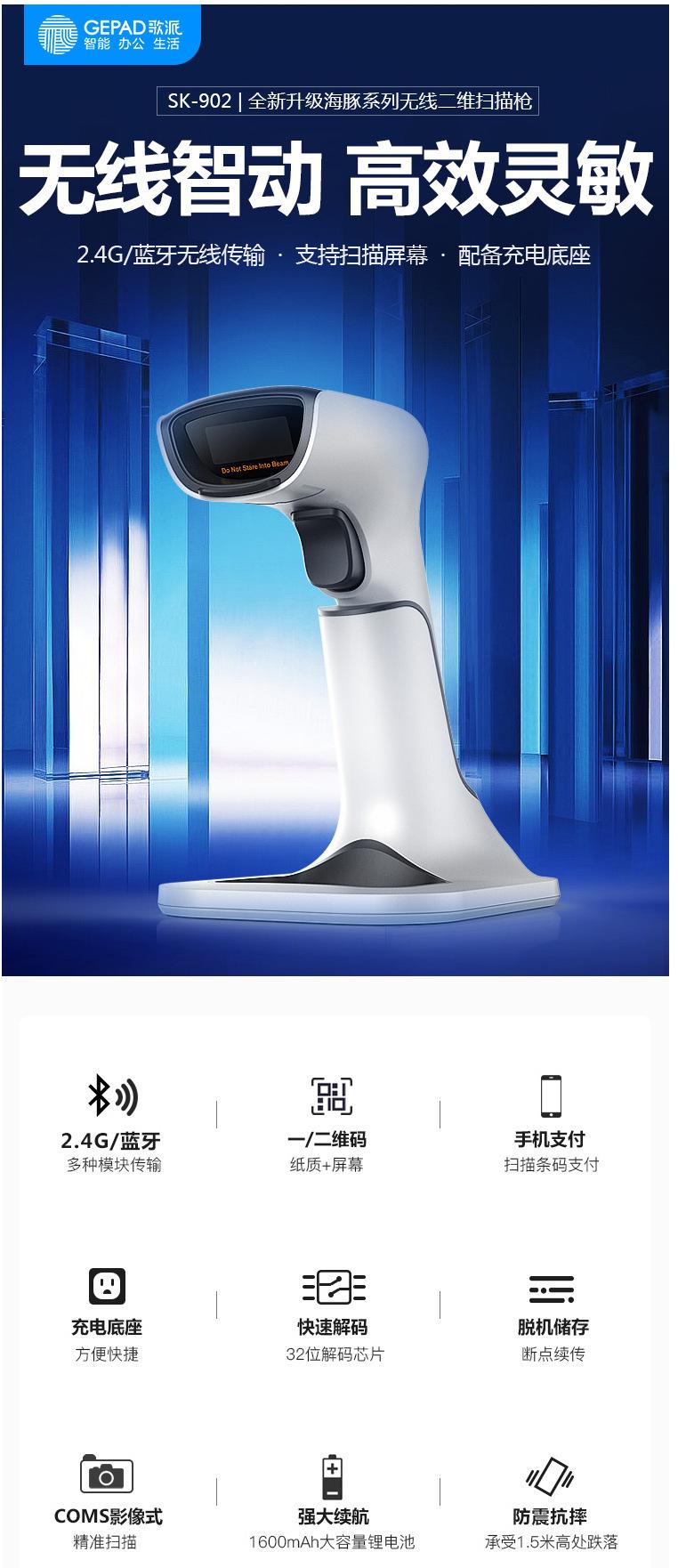 Pistola de escaneo GE Pai SK-902, escáner inalámbrico de código QR, escáner Bluetooth, cajero, facturación, comercio