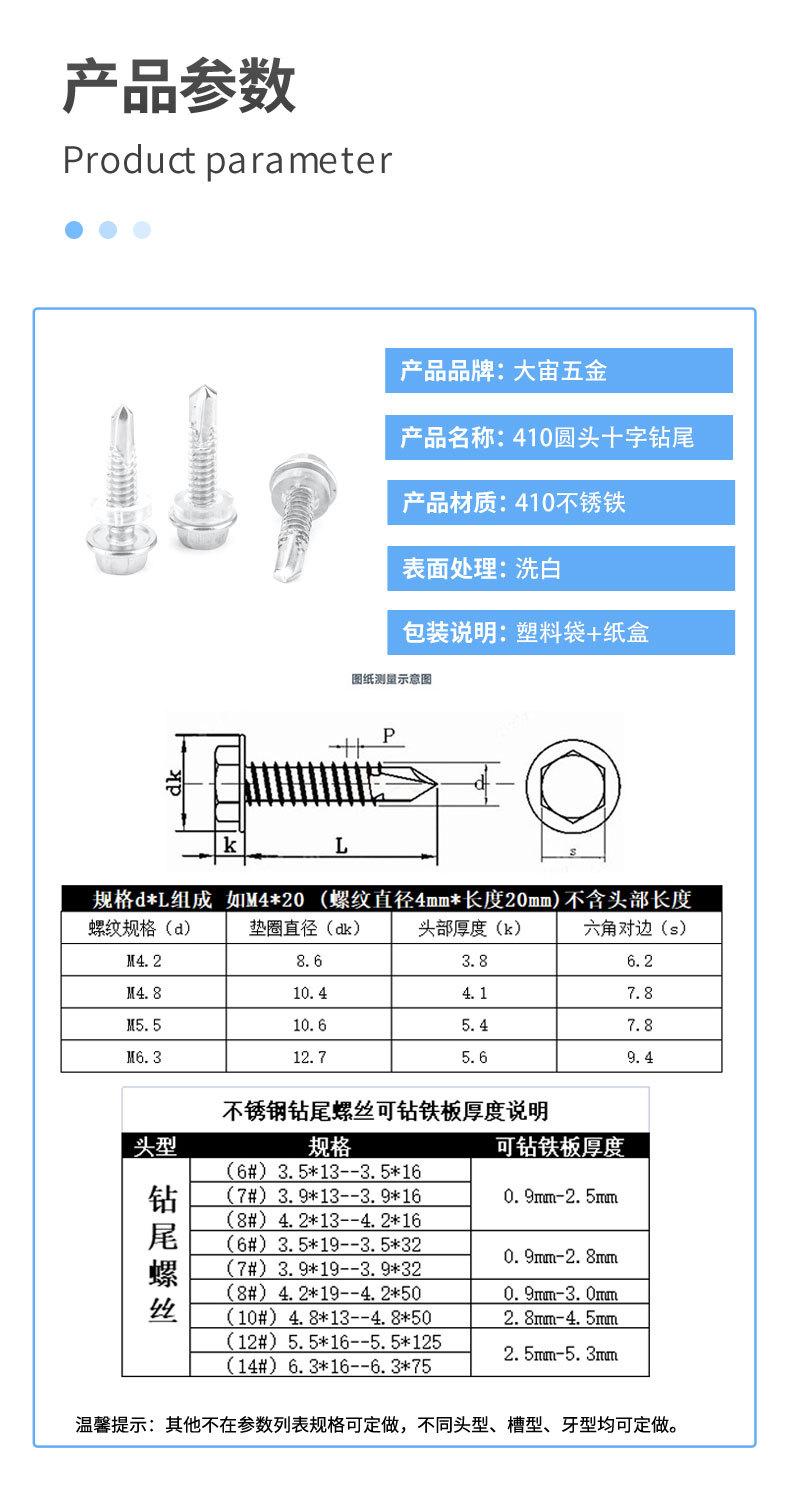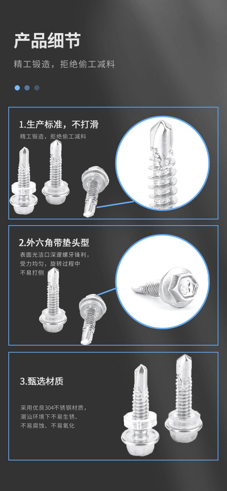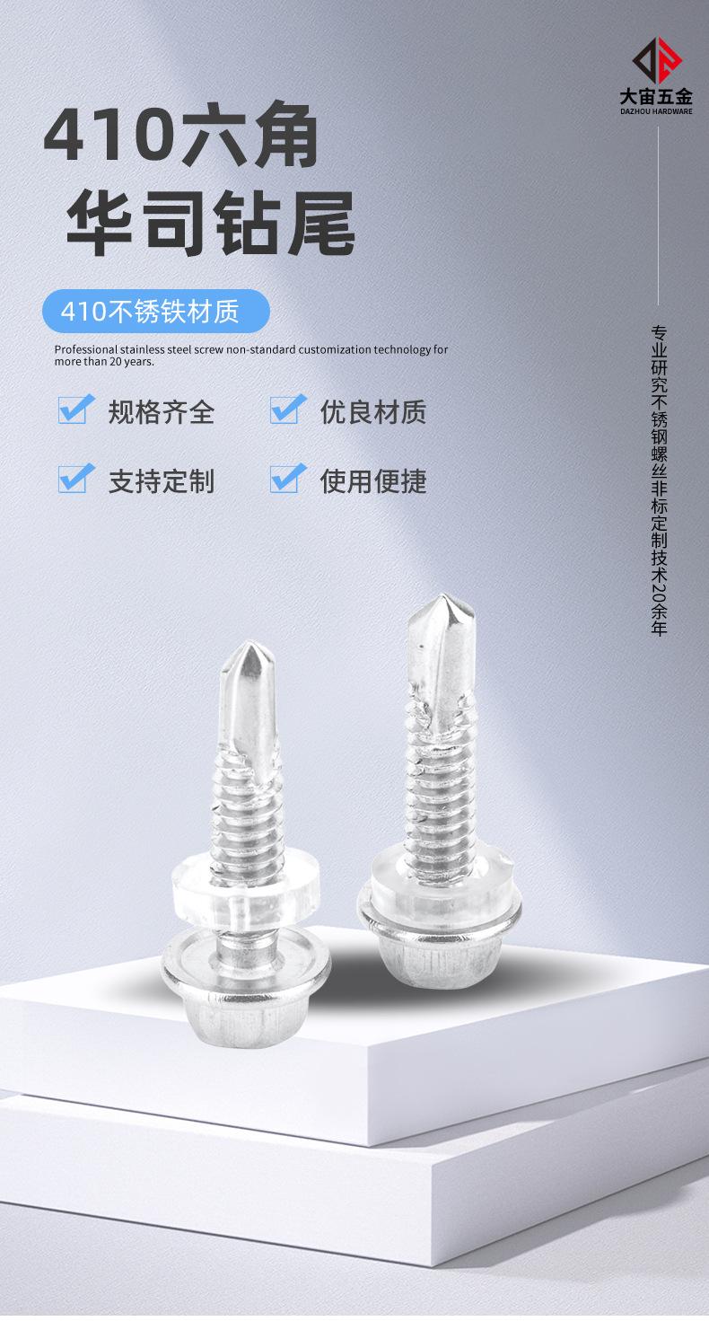 Tornillo autorroscante de cola de milano con brida Huashi, de acero inoxidable 410, con hexágono exterior y cola de milano de perforación media, con almohadilla