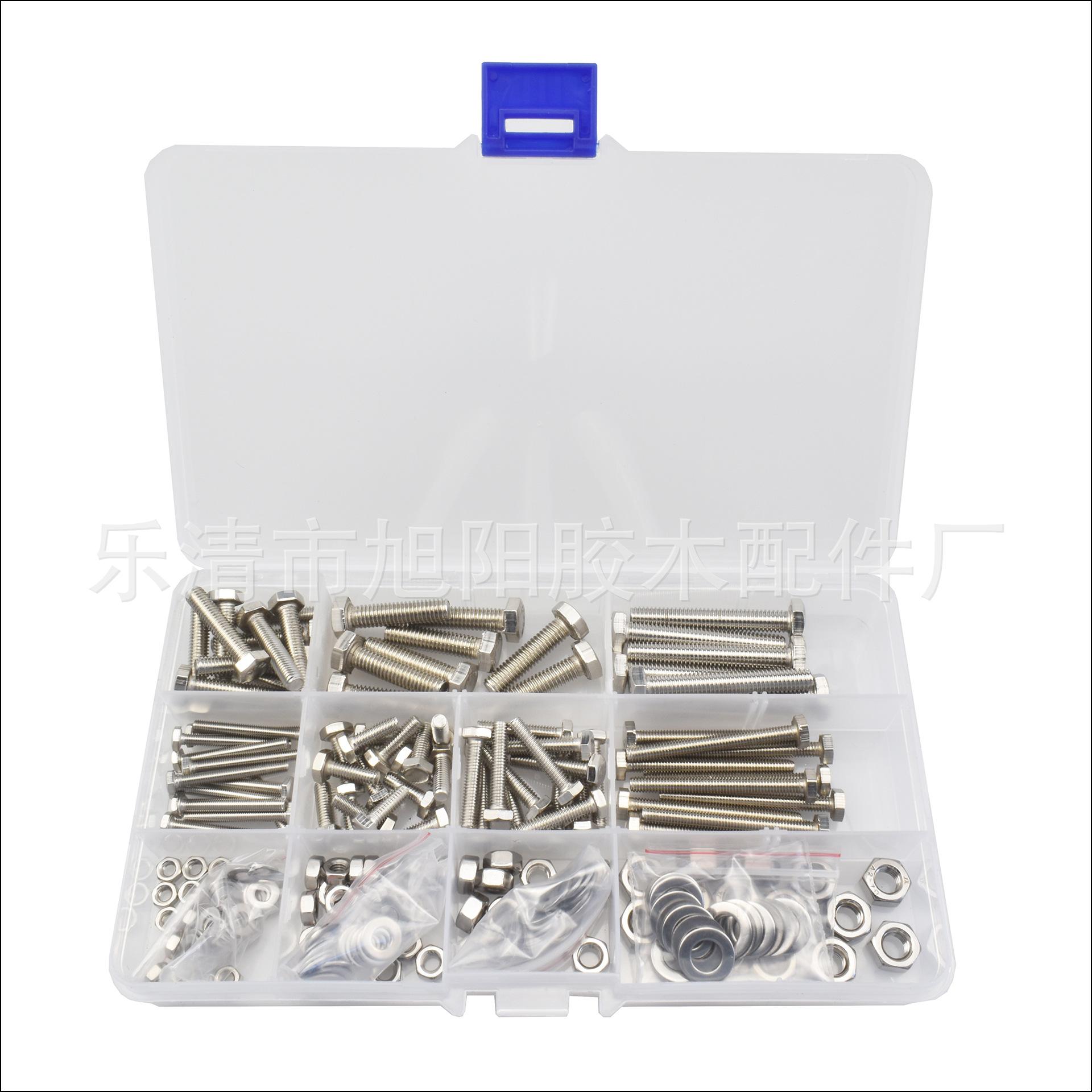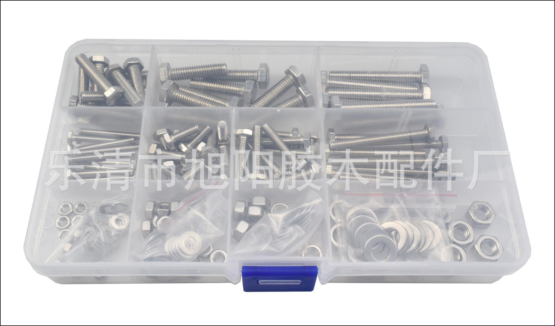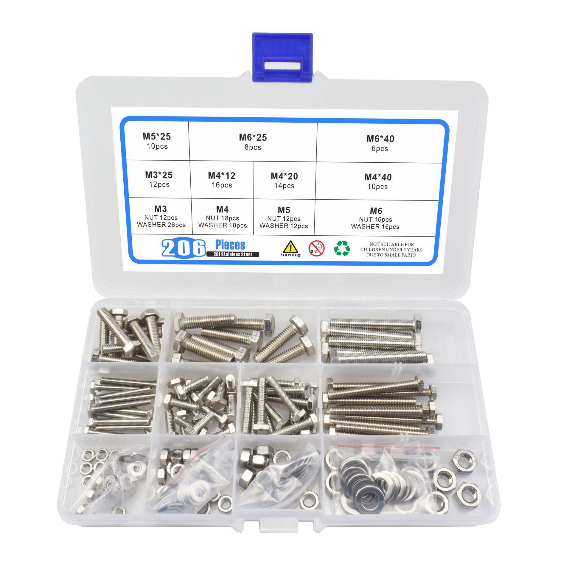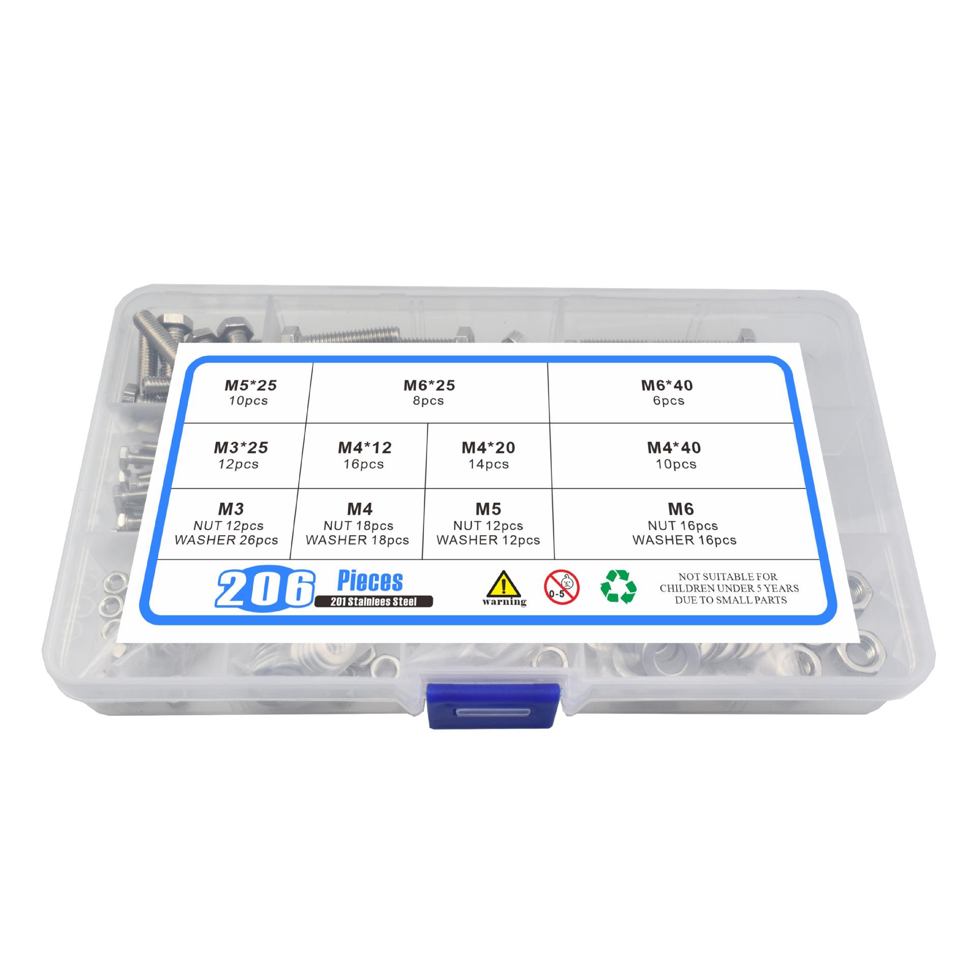 206 piezas 201 perno de acero inoxidable, arandela plana, tuerca, combinación, traje, caja, tornillo hexagonal exterior