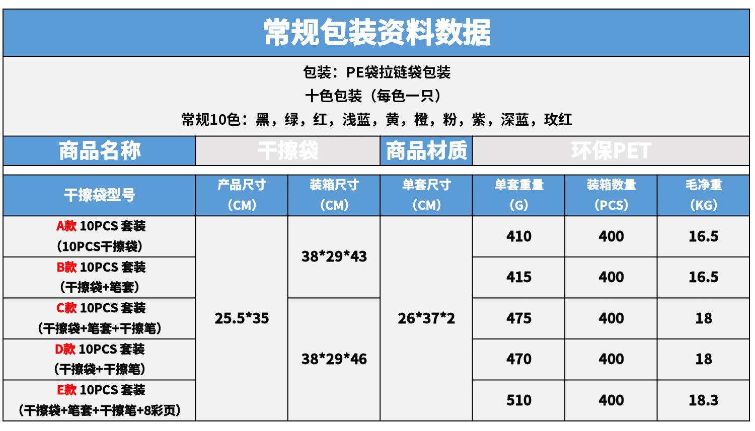Embalaje estándar: Bolsa de PE con cierre de cremallera, 10 unidades (10 colores, 1 unidad por color).