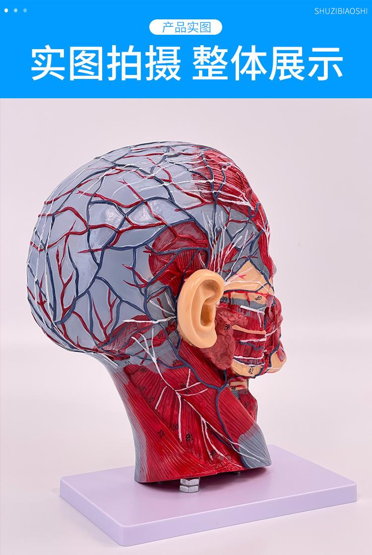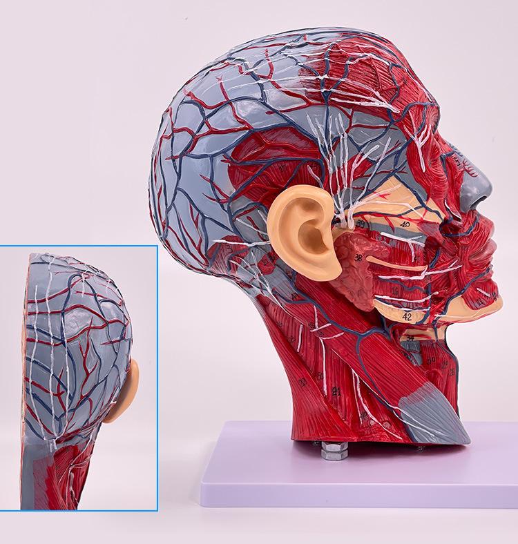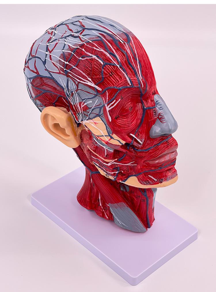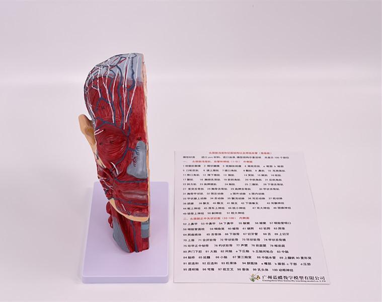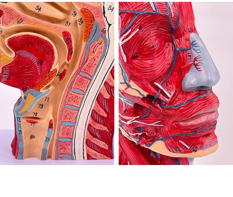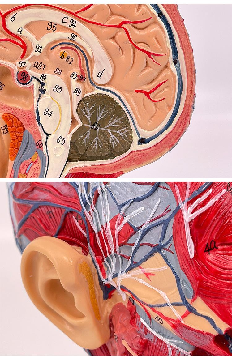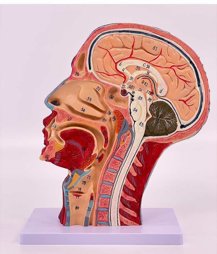 Características: ■ Este modelo muestra la forma local de las superficies interna y externa de la cabeza y el cuello en la sección mediosagital y sus vasos sanguíneos, nervios y otras estructuras, con un total de 100 indicadores de sitio. ■tamaño:Tamaño natural, altura 27cm, ancho 20cm, grosor 10cm ■Material:Materiales de PVC importados, pintura importada, combinación de colores por computadora, pintura