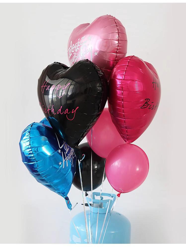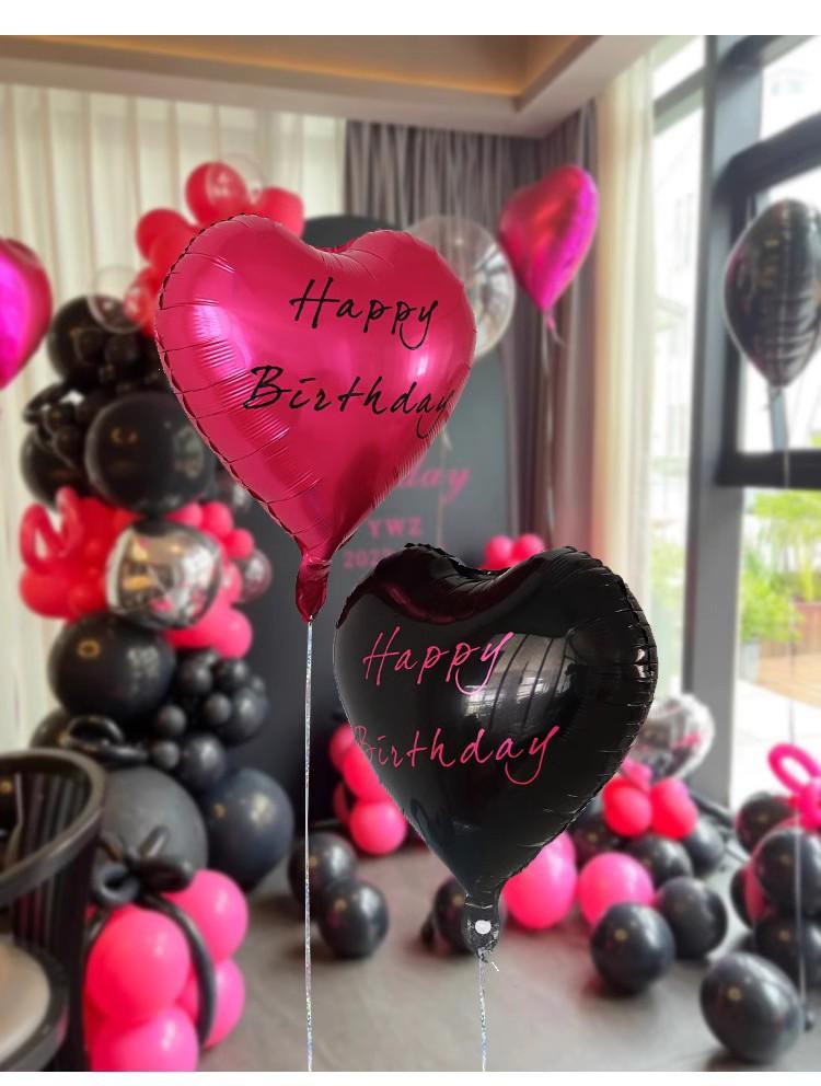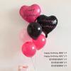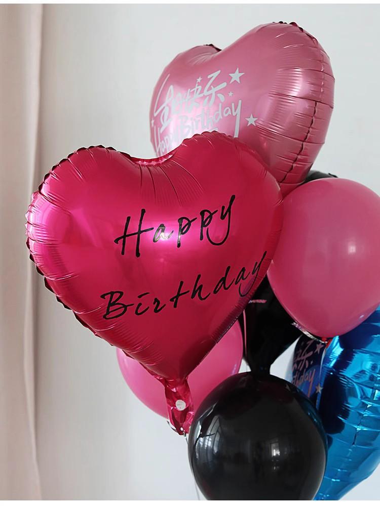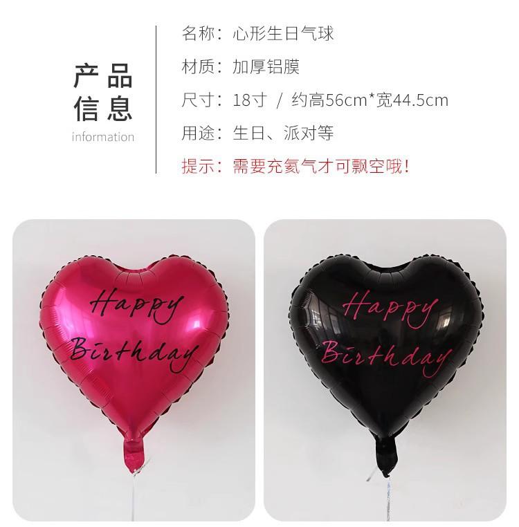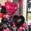Globo de aluminio en forma de corazón con diseño de red roja feliz cumpleaños, fondo de fiesta con temática de rosa negra y roja, diseño de bola de aire flotante