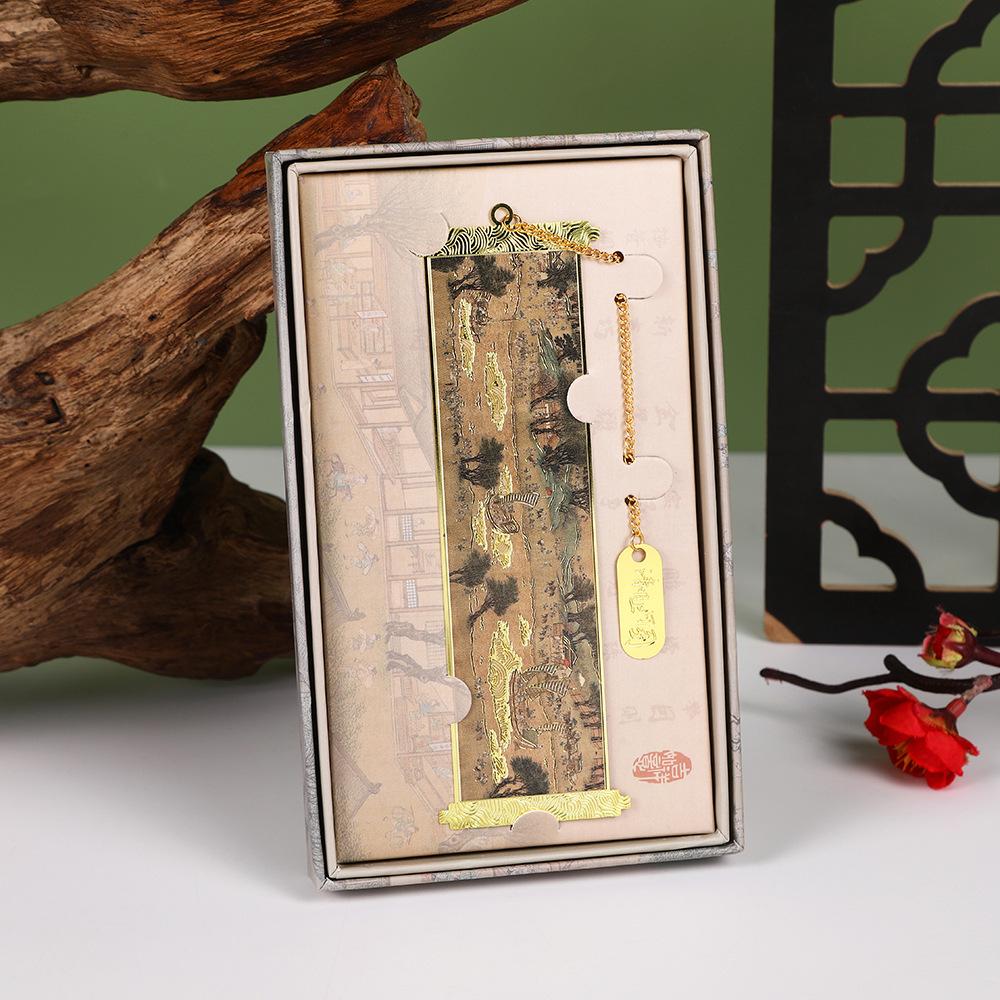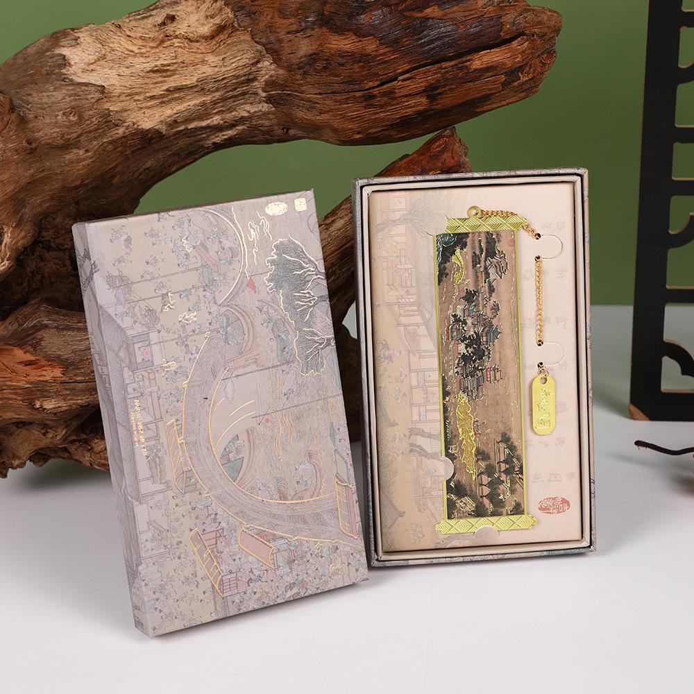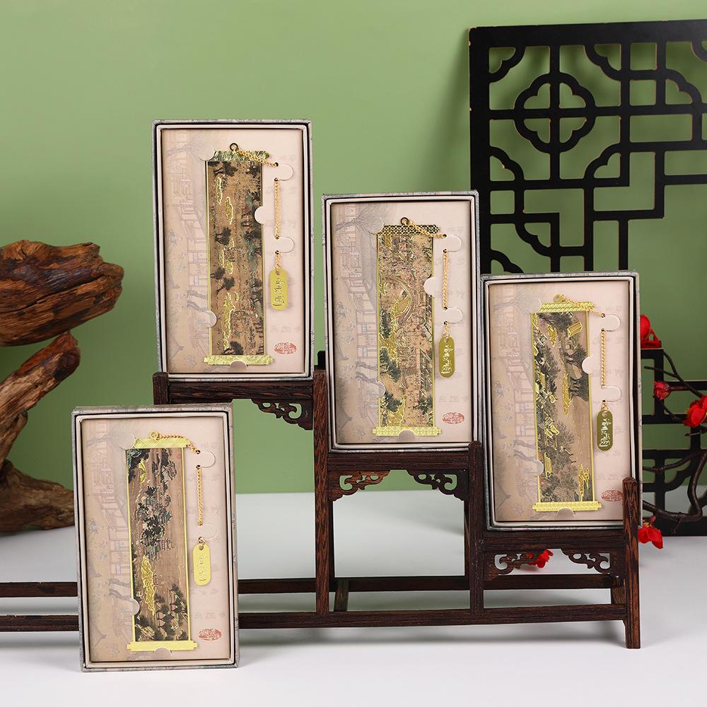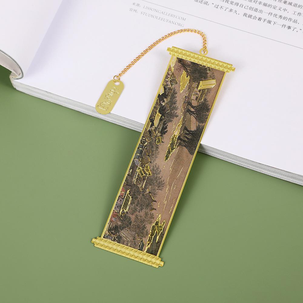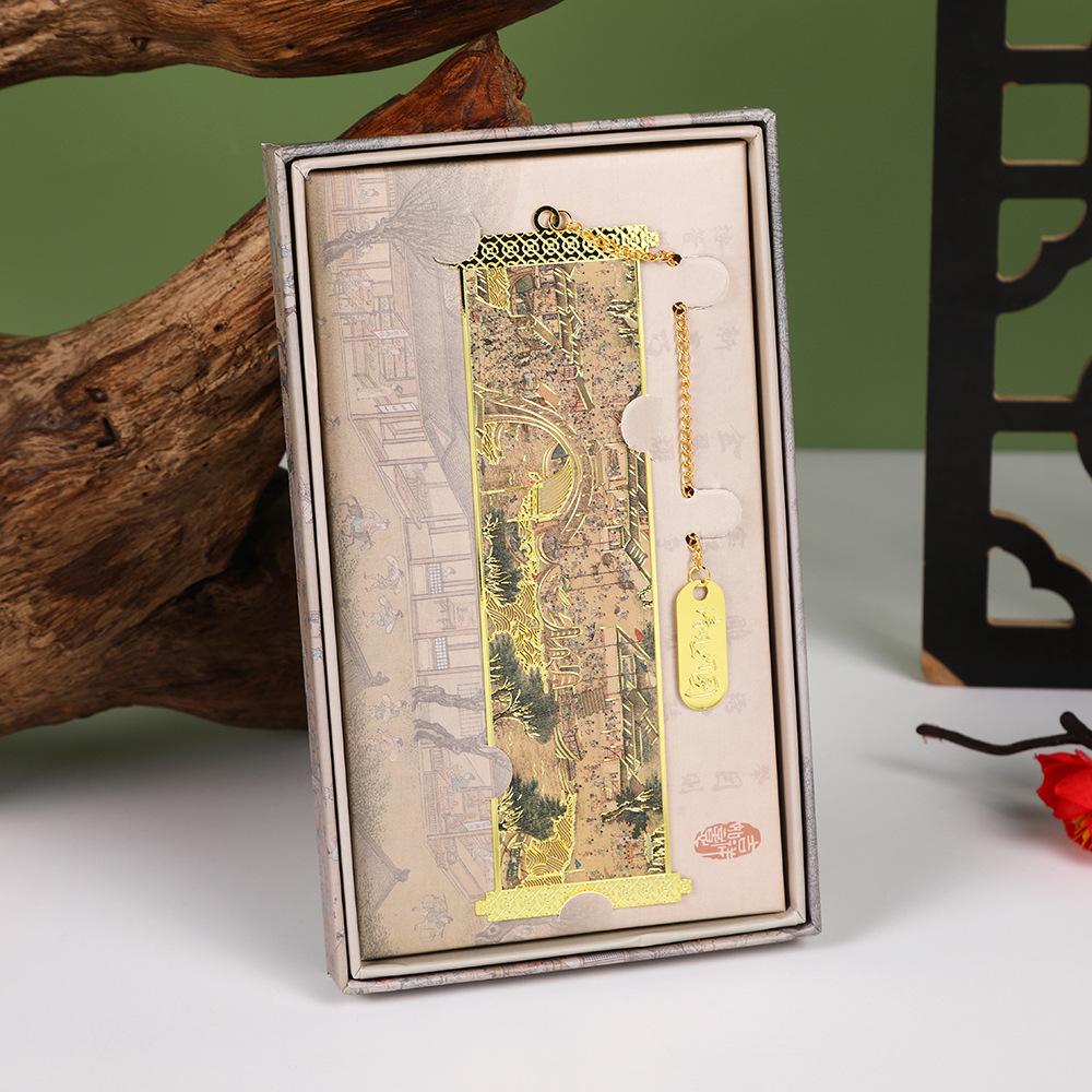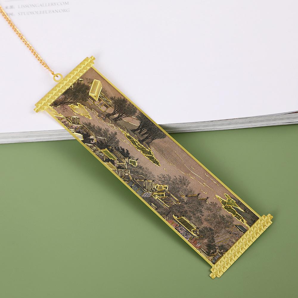 Marcador de metal de latón retro estilo chino, colgante de borla artística, mapa clásico de Qingming Shanghe, regalo creativo cultural, conmemorativo