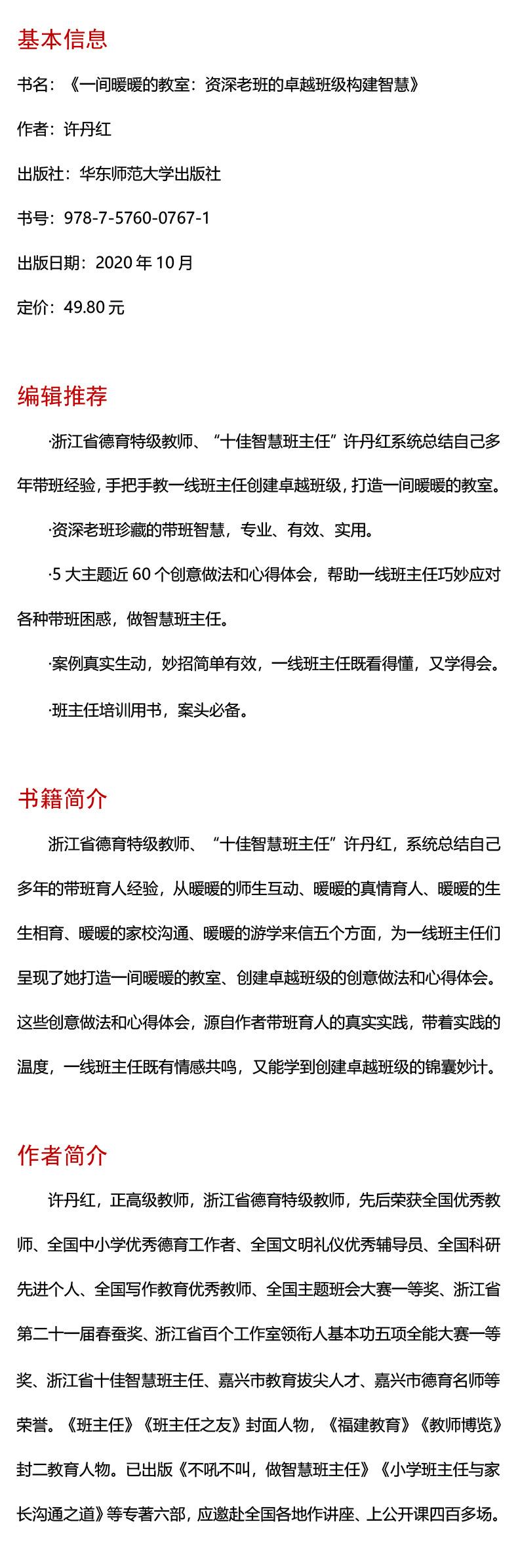 Xu Danhong, maestra de educación moral de grado especial en la provincia de Zhejiang y una "maestra tutora sabia líder", resume sistemáticamente sus muchos años de experiencia en dirigir clases y nutrir estudiantes. Desde cinco aspectos: interacción maestro-alumno conmovedora, educación genuina conmovedora, interacción estudiante-estudiante conmovedora, comunicación hogar-escuela conmovedora y cartas conmovedoras de viajes de estudio, presenta a los maestros tutores de primera línea sus prácticas creativas y conocimientos para construir un aula conmovedora y crear una clase excelente. Estas prácticas creativas y conocimientos provienen de la práctica real de la autora en dirigir clases y nutrir estudiantes, llevando la calidez de la práctica. Los maestros tutores de primera línea pueden tanto resonar emocionalmente como aprender la clave para crear una clase excelente.