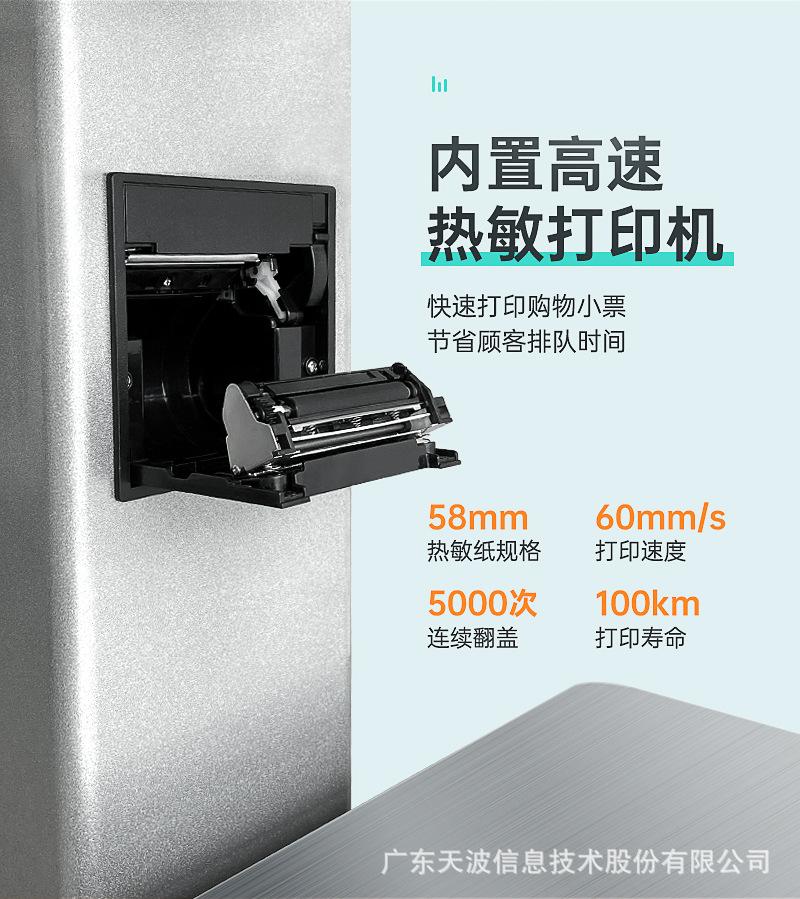Teniendo en cuenta la aplicación de nuevos escenarios minoristas, Telpo Intelligent Hardware ha equipado la báscula registradora de pago con escaneo facial Android TPS655 con una impresora térmica de alta velocidad, que admite 5,000 giros continuos, tiene una vida útil de impresión de hasta 100 km y una velocidad de impresión de hasta 60 mm/s. Puede imprimir rápidamente recibos de compra y ahorrar tiempo de espera a los clientes.