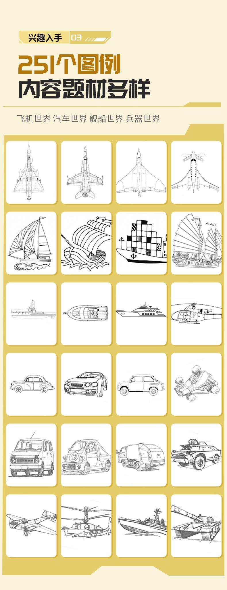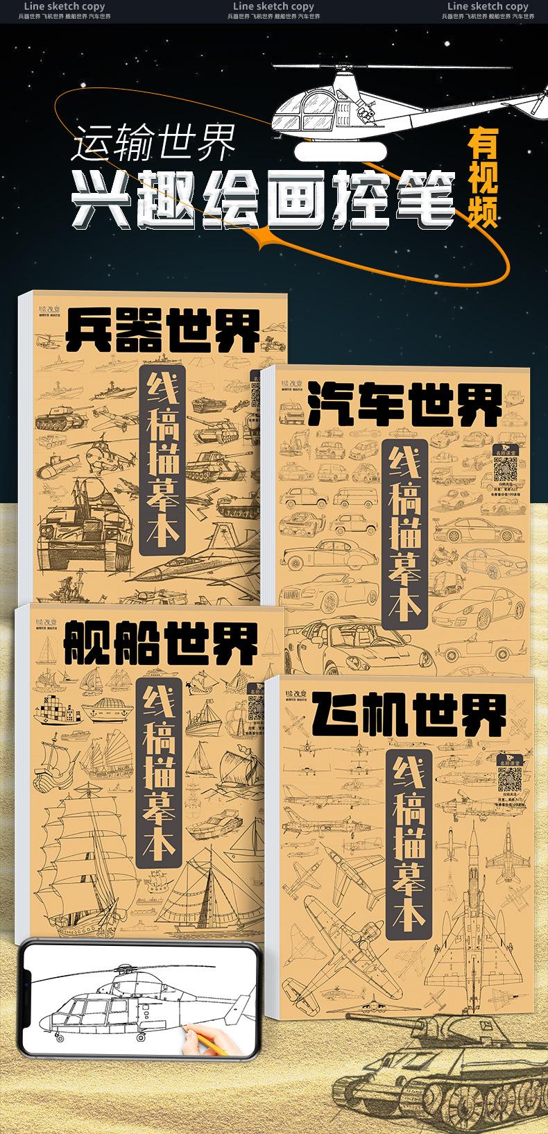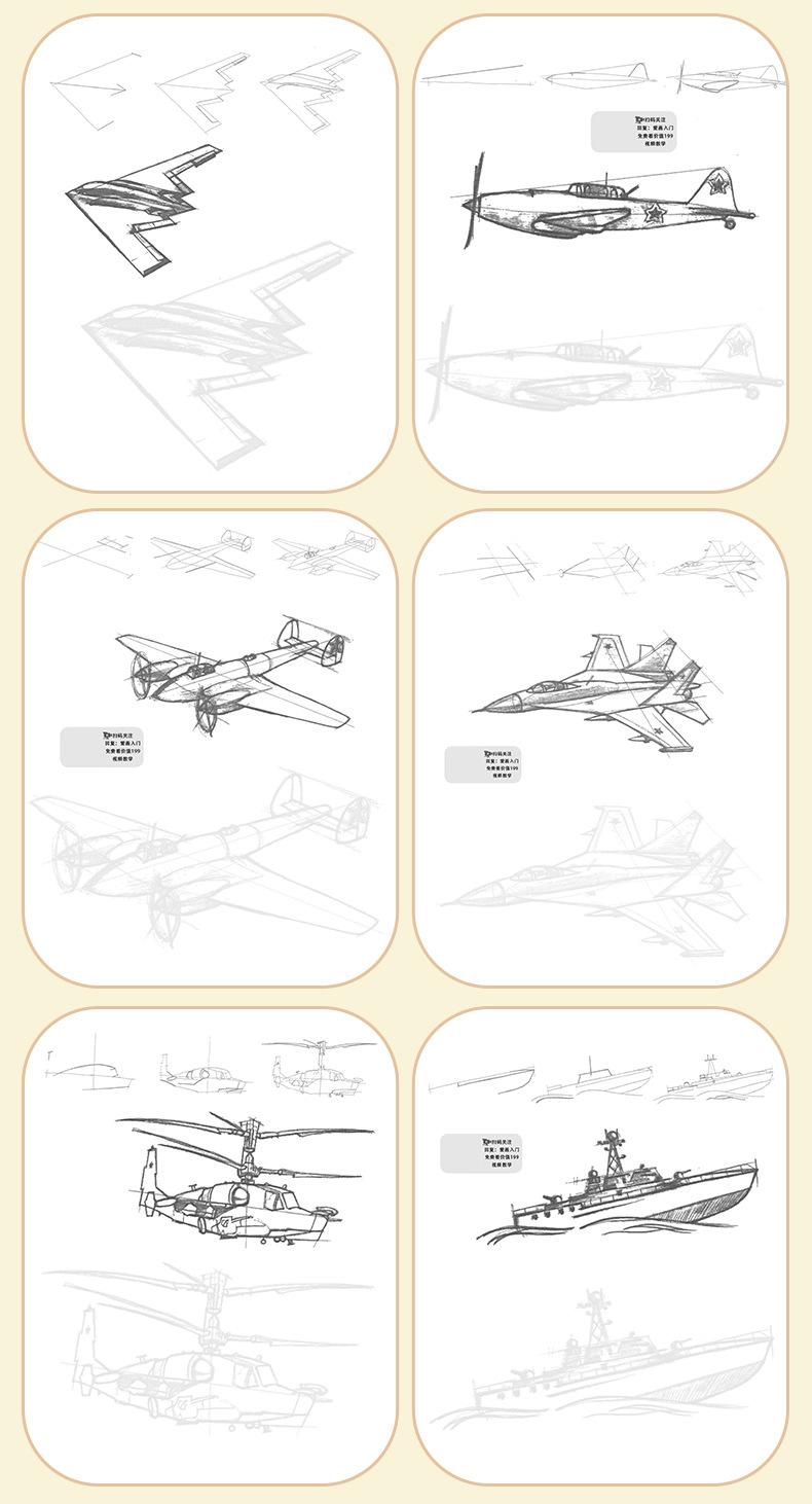 Libro de seguimiento de borrador de línea de aeronaves y automóviles, barco, arma, caza, tanque, dibujos animados, dibujos animados, técnica de control de lápiz de dibujos animados