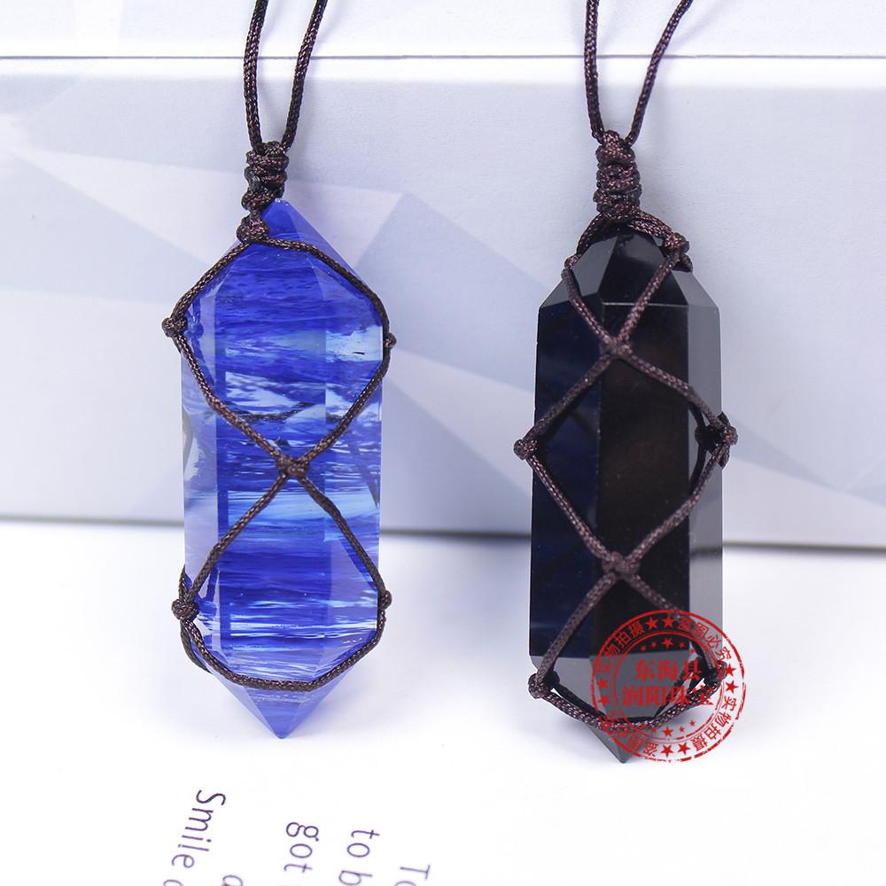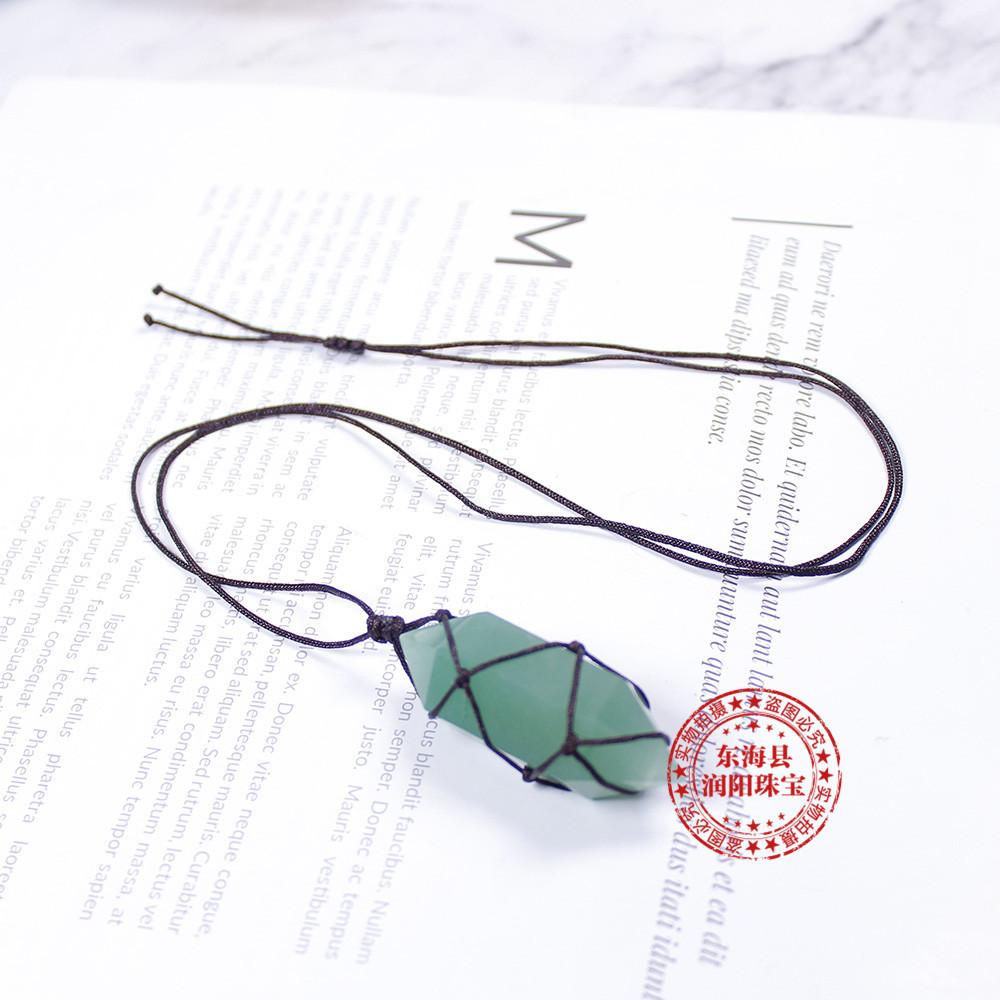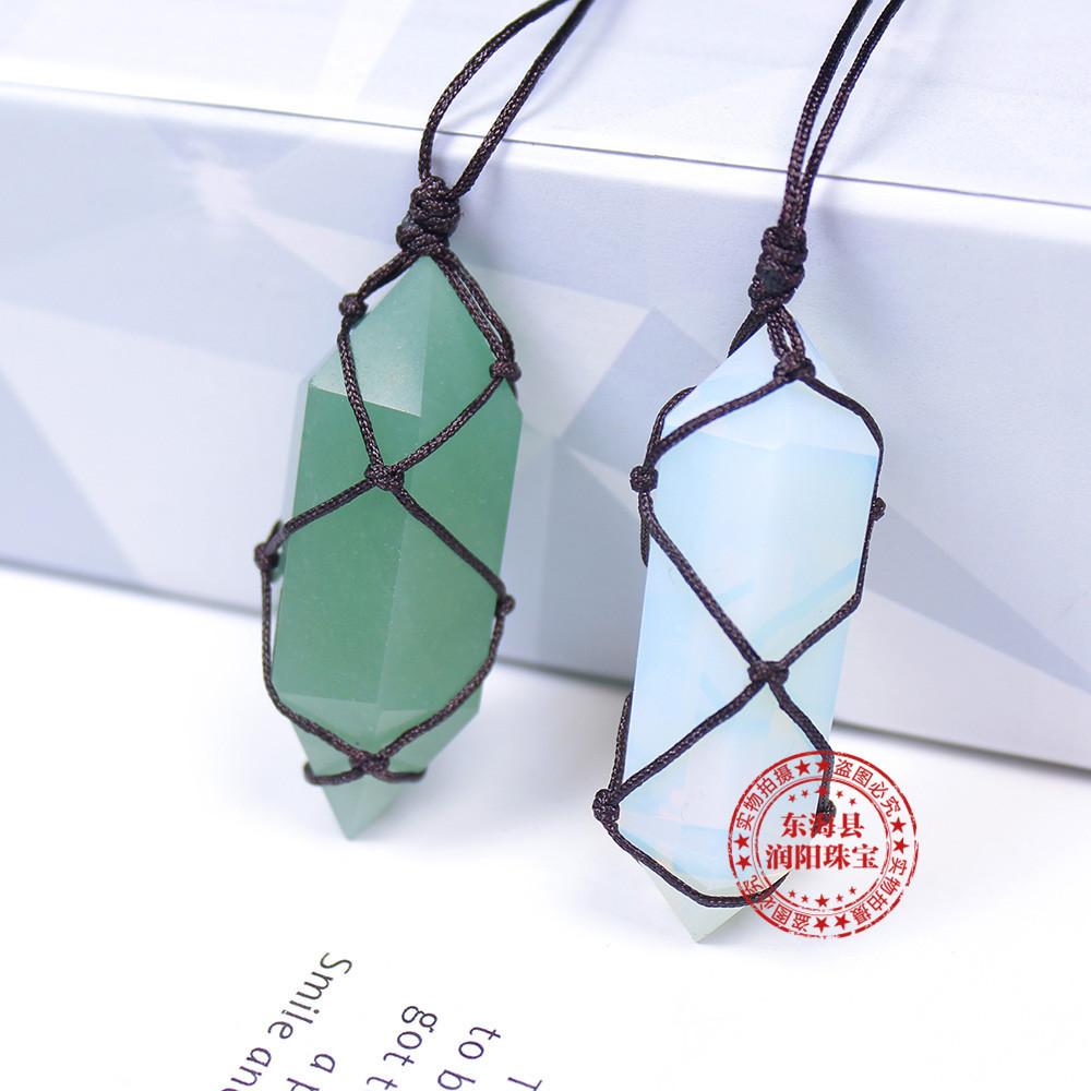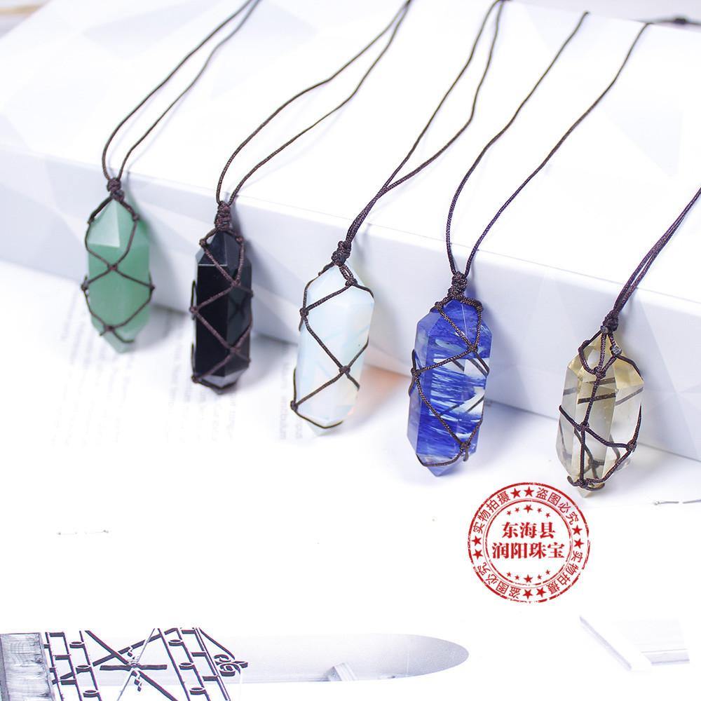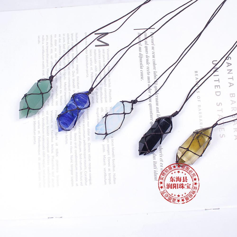 Donghai cristal natural piedra en bruto cristal doble punta prisma hexagonal colgante bolsa de malla tejida a mano joyería collar europeo y americano