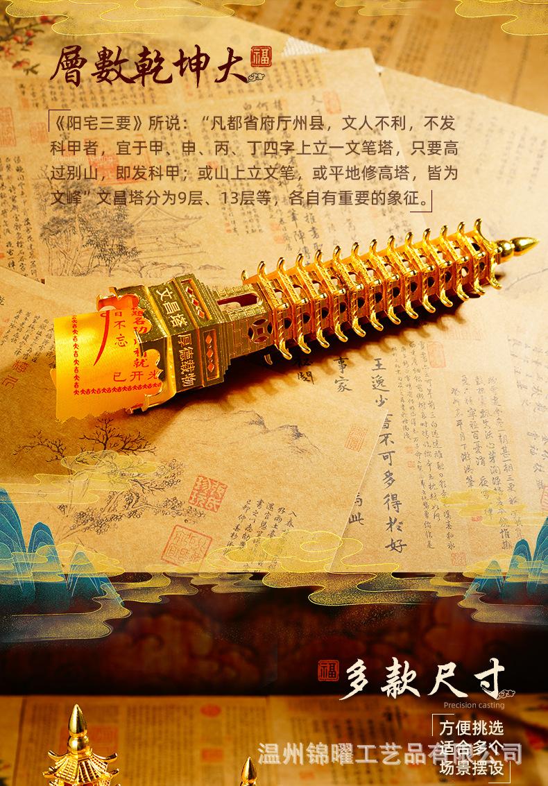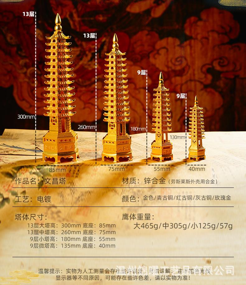La Torre Wenchang de latón mide 16 cm, 18 cm, 20 cm, 26 cm, 30 cm y 38 cm. Véase la imagen a continuación.