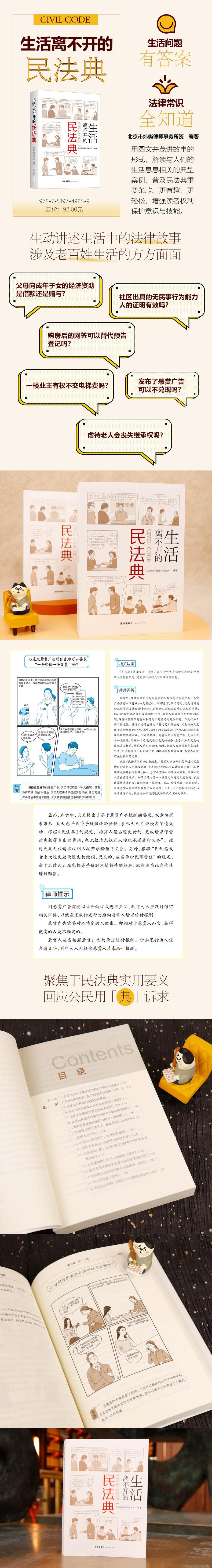 Este libro está compilado por un equipo de abogados profesionales senior del Bufete de Abogados Beijing Weiheng. Utiliza imágenes y textos para contar historias. Espera popularizar las disposiciones importantes del Código Civil interpretando casos típicos que están estrechamente relacionados con la vida de las personas, para que los lectores puedan aprender más sobre él. Es una forma interesante y más relajada de aprender el Código Civil de lo más superficial a lo más profundo, paso a paso y capa por capa, con el fin de inspirar y beneficiar a los lectores, mejorar eficazmente el concepto del estado de derecho, aumentar la conciencia y las habilidades de protección de los derechos y combinar el conocimiento y la práctica. Implementar el Código Civil en un solo lugar.