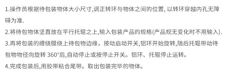 Función de operación: Operación automática, finalización automática de la función de ajuste de la máquina, detección automática de la altura de la carga y función de protección fotoeléctrica, reinicio automático de la plataforma giratoria, función de bobinado manual reforzado, puede configurar el número de bobinados de la capa superior/inferior, los tiempos de subida y bajada, el número de círculos de refuerzo y el tiempo de sobre-tope, reforzar las partes requeridas localmente para hacer el embalaje más perfecto. Reinicio de la plataforma giratoria para garantizar un posicionamiento preciso durante la manipulación.