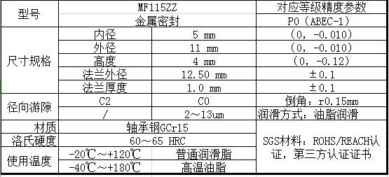 MF115ZZRodamiento, rodamiento con brida diámetro interior 5 diámetro exterior 11 altura total 4mm, diámetro exterior del borde de la brida es 12.5mm, espesor del borde de la brida es 1mm; rectificado fino de alta precisión, adecuado para operación a alta velocidad; el material está garantizado que es acero para rodamientos GCr15, material respetuoso con el medio ambiente, con informes de prueba SGS RoHs y REACH, si necesita información más detallada, ¡consúltenos!