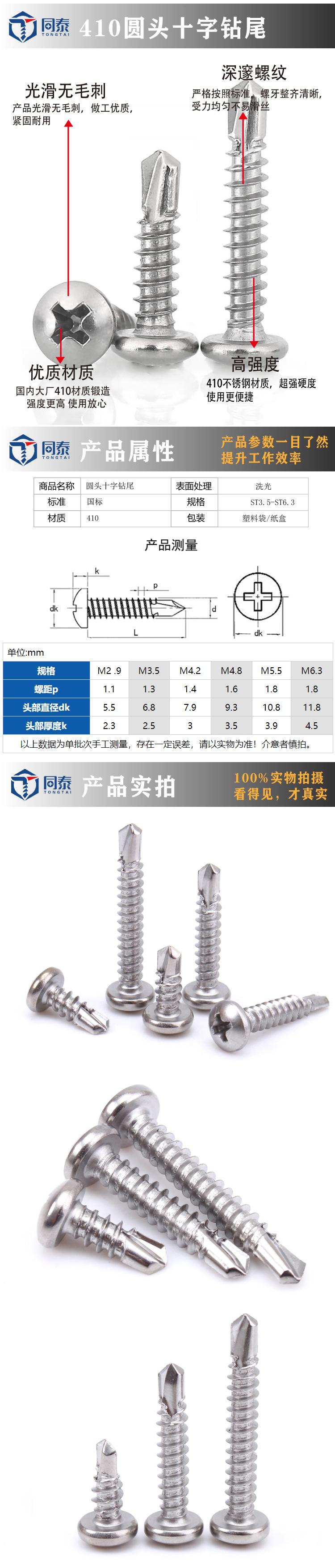 Acero inoxidable 410 cabeza redonda cruzada tornillo de cola de taladro cabeza plana cola de milano autorroscante autoperforante directo de fábrica ST4.2