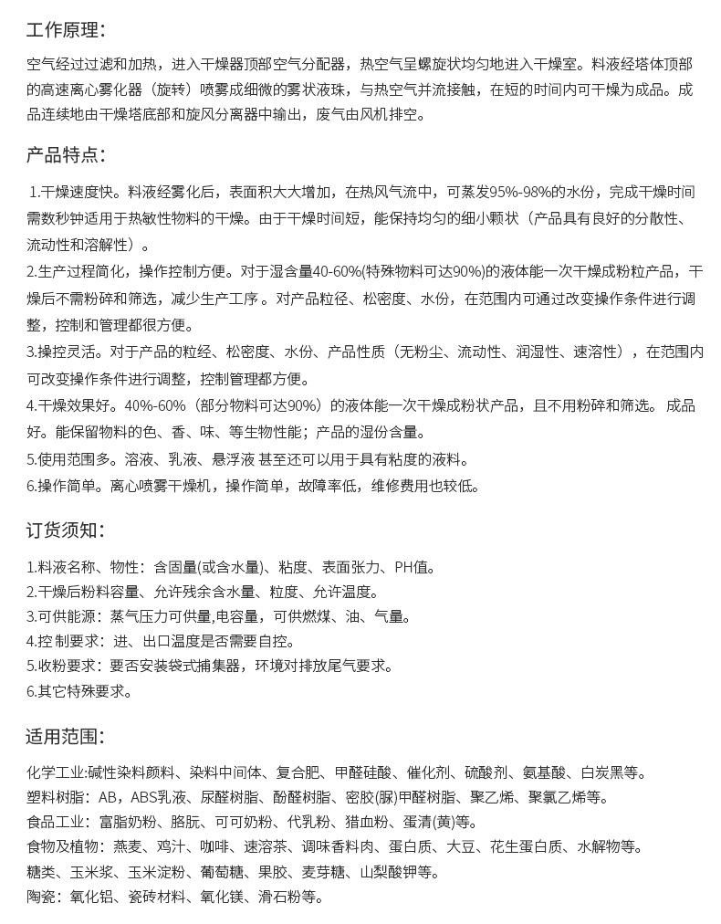 2. Dado que el secado se realiza con aire caliente, el producto mantiene una forma esférica similar a las gotas, con buena dispersabilidad, fluidez y solubilidad. El funcionamiento es sencillo y estable, el ajuste y el control son cómodos, y el funcionamiento automático es fácil.