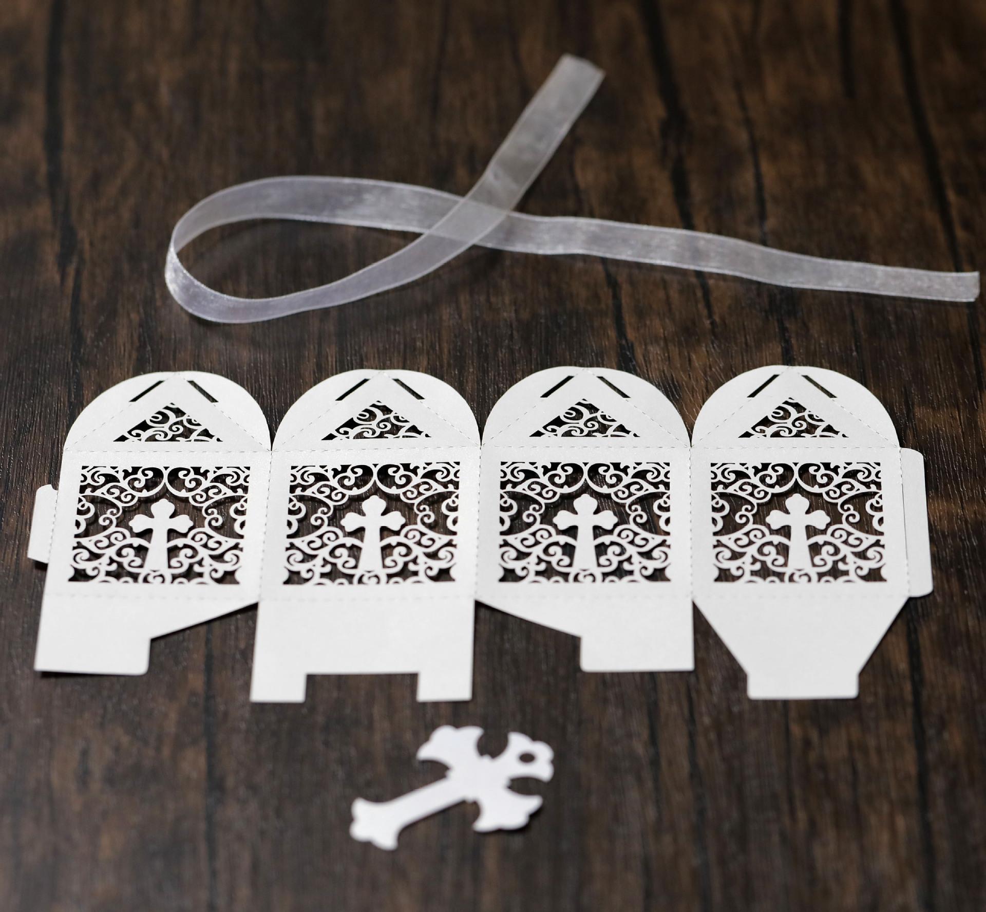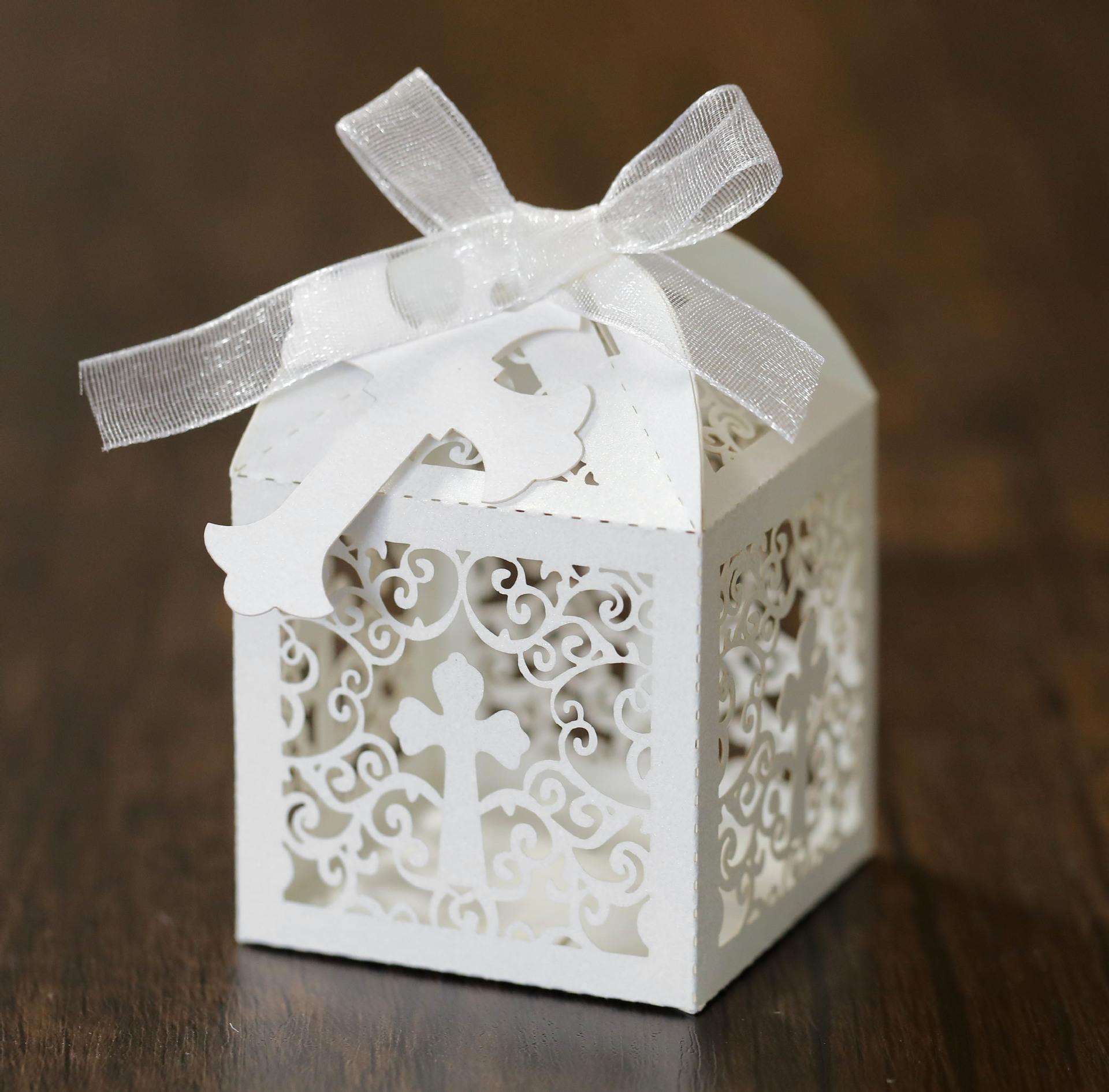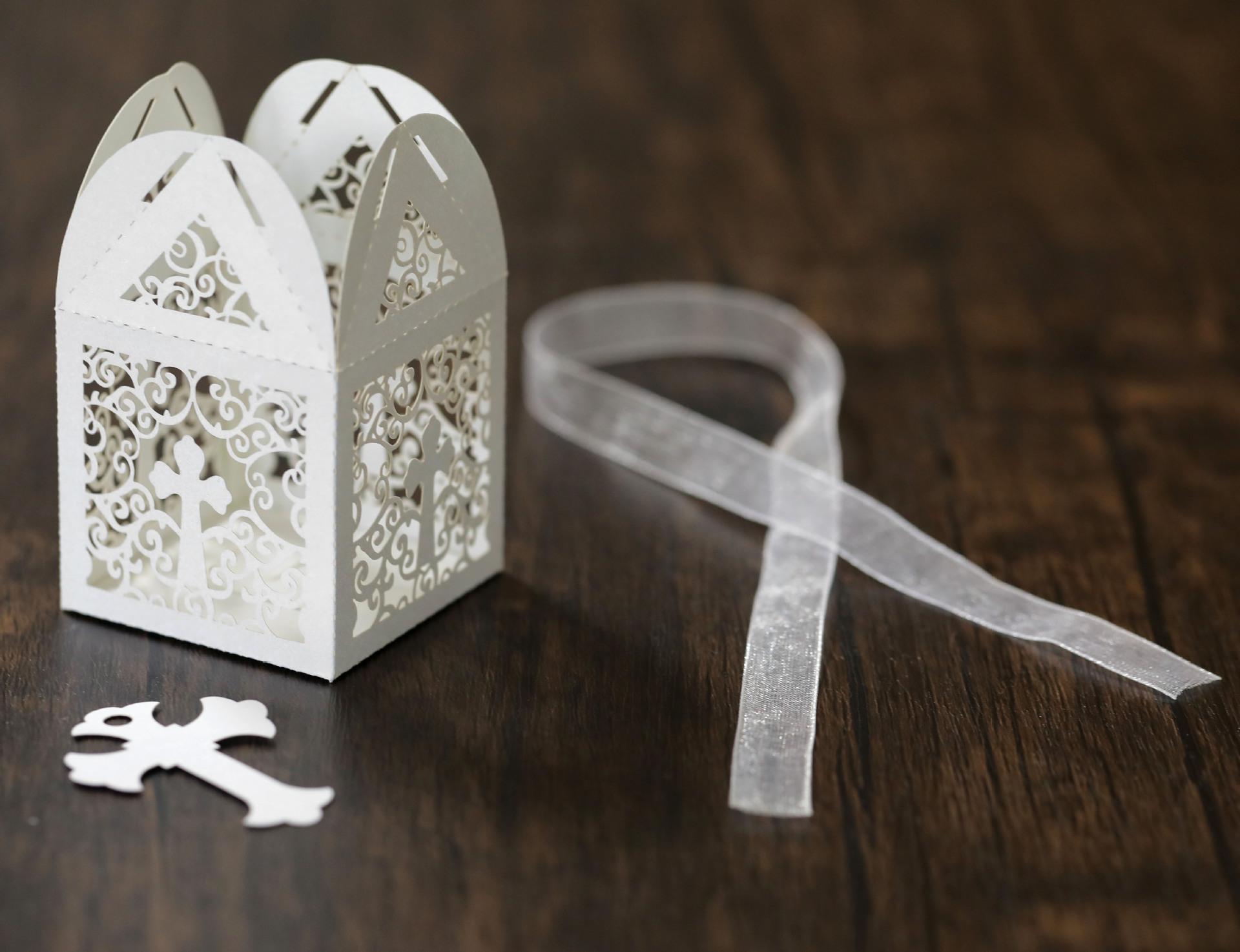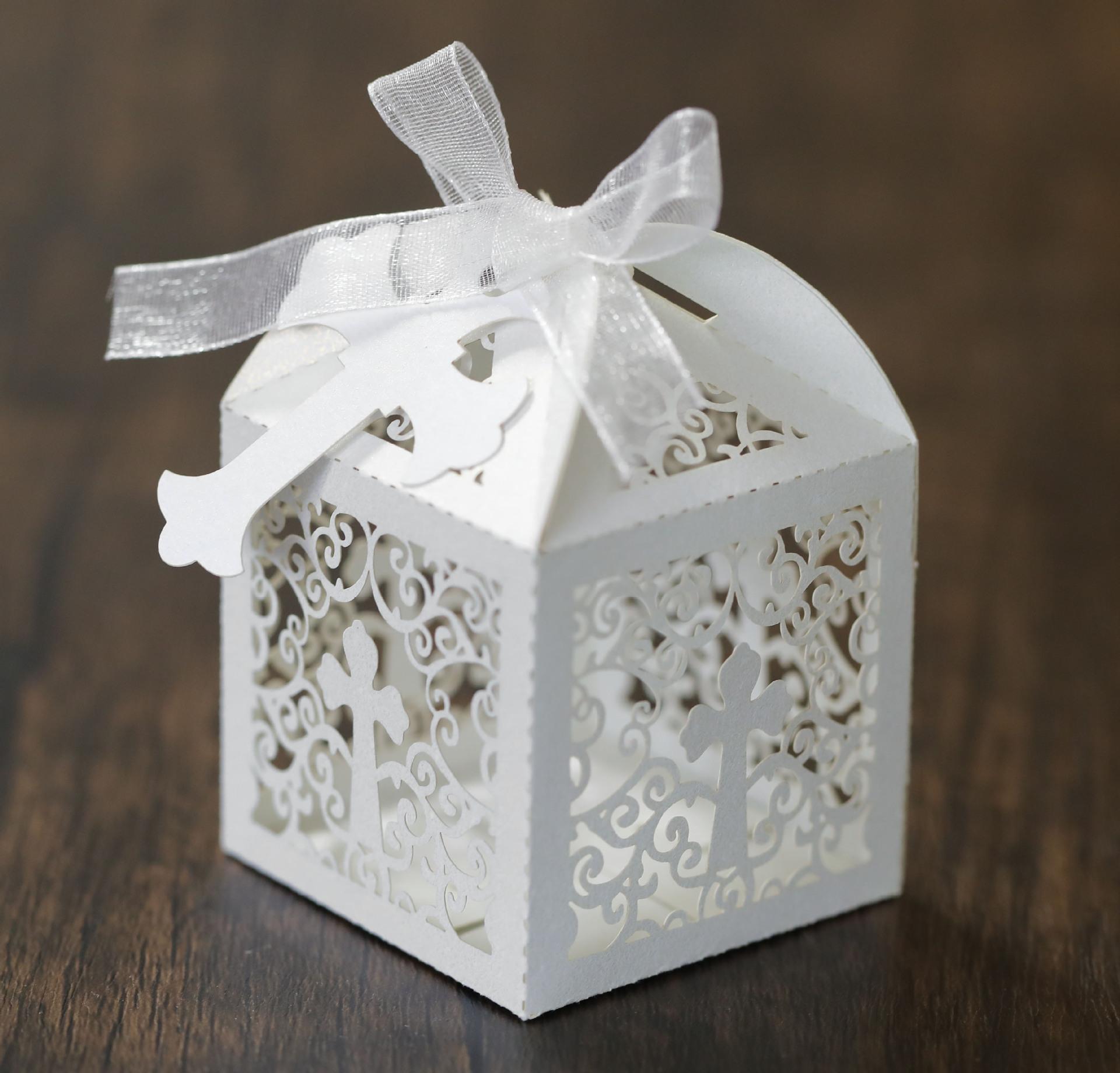 Papel perlado de 210 g. Caja de dulces para bodas con cinta hueca.