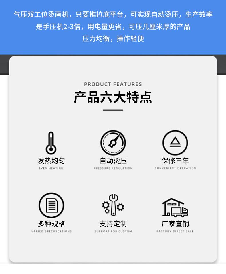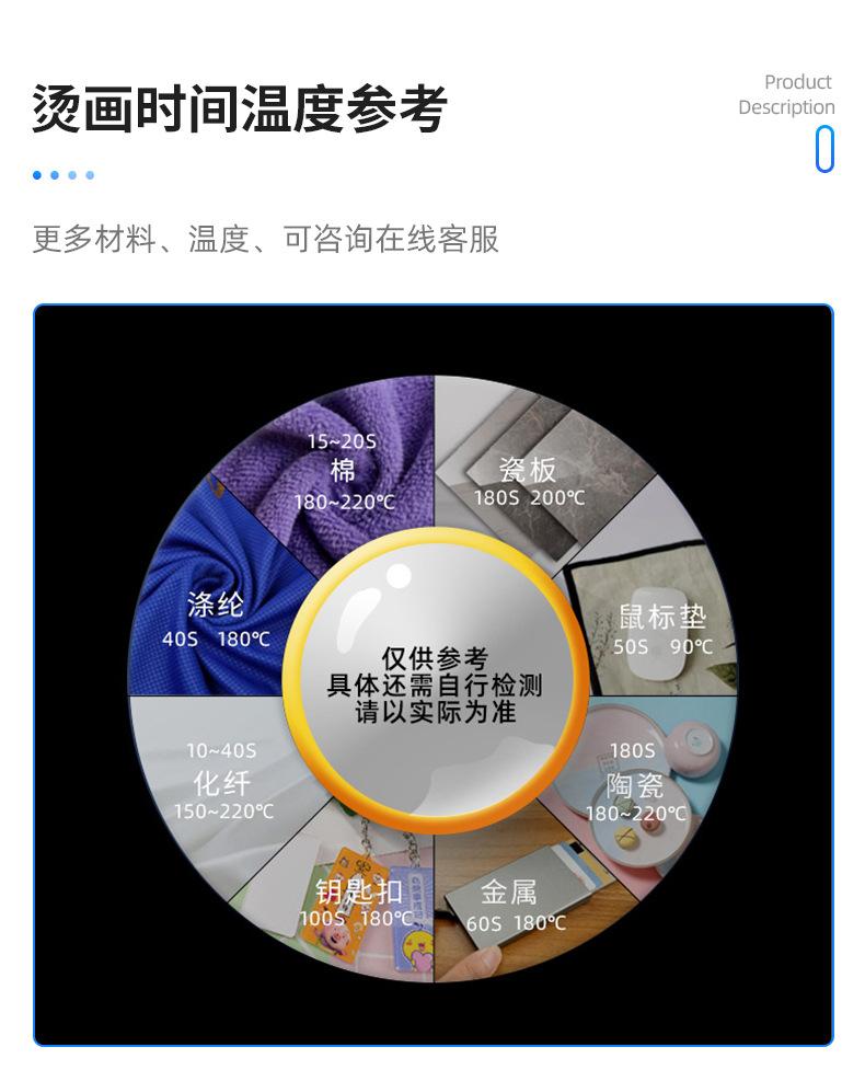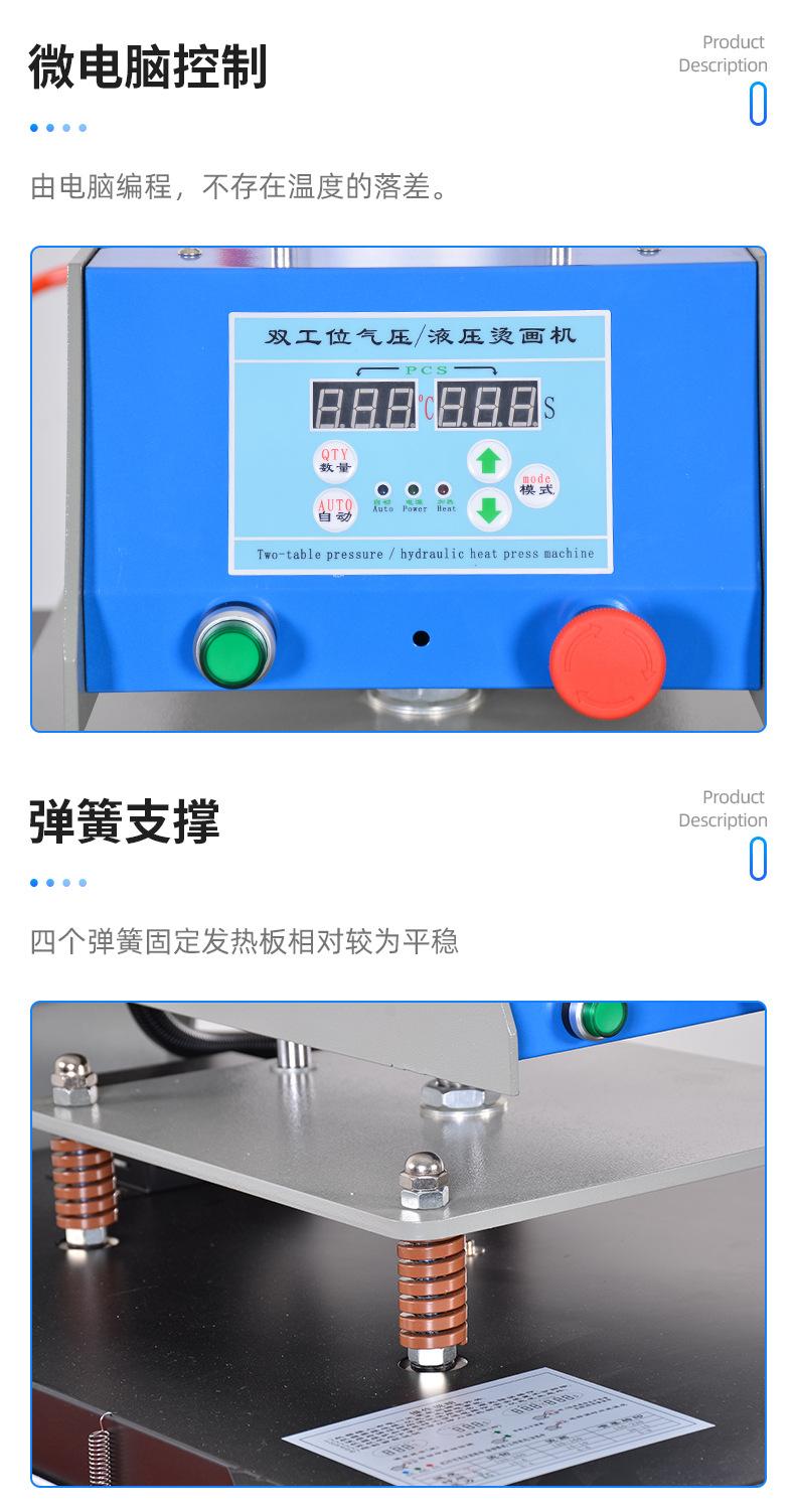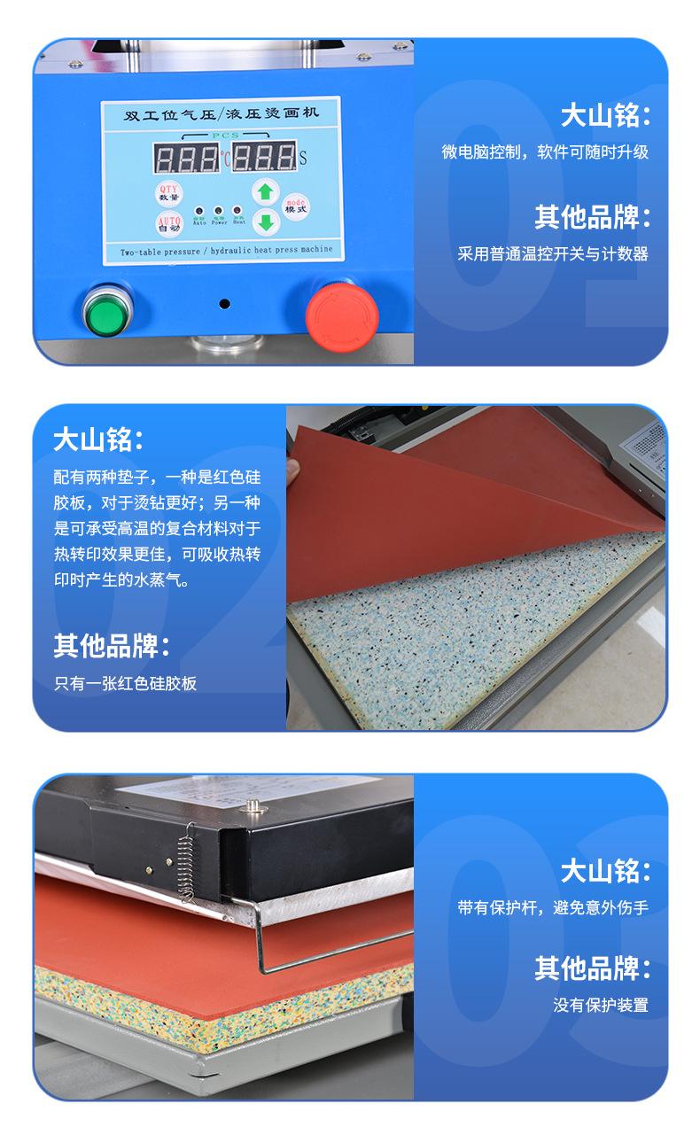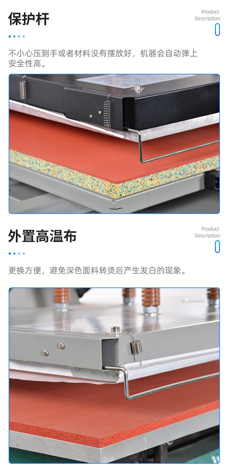 La máquina adopta control por microcomputadora, pantalla digital, conteo,Protección automática en modo de espera prolongado y alarma de sobretemperatura.Tela exterior de alta temperatura, buena antiadherencia, mejora la calidad de la transferencia de calor.