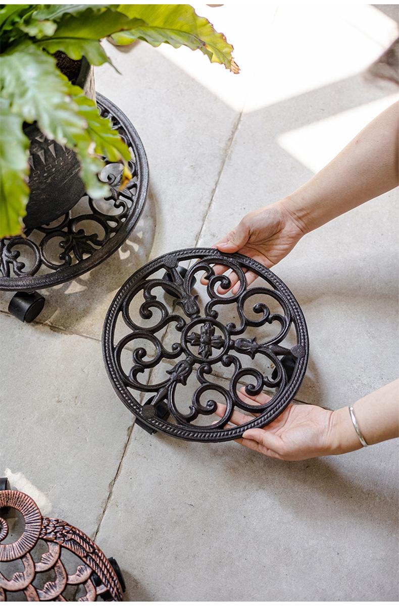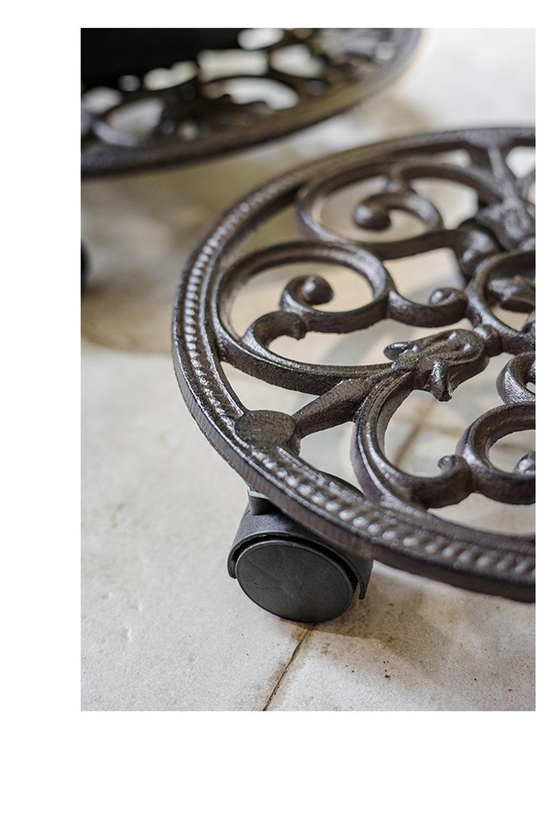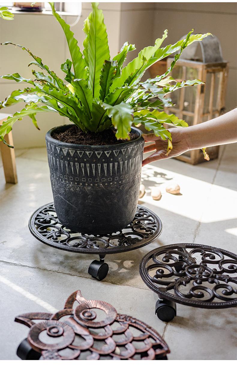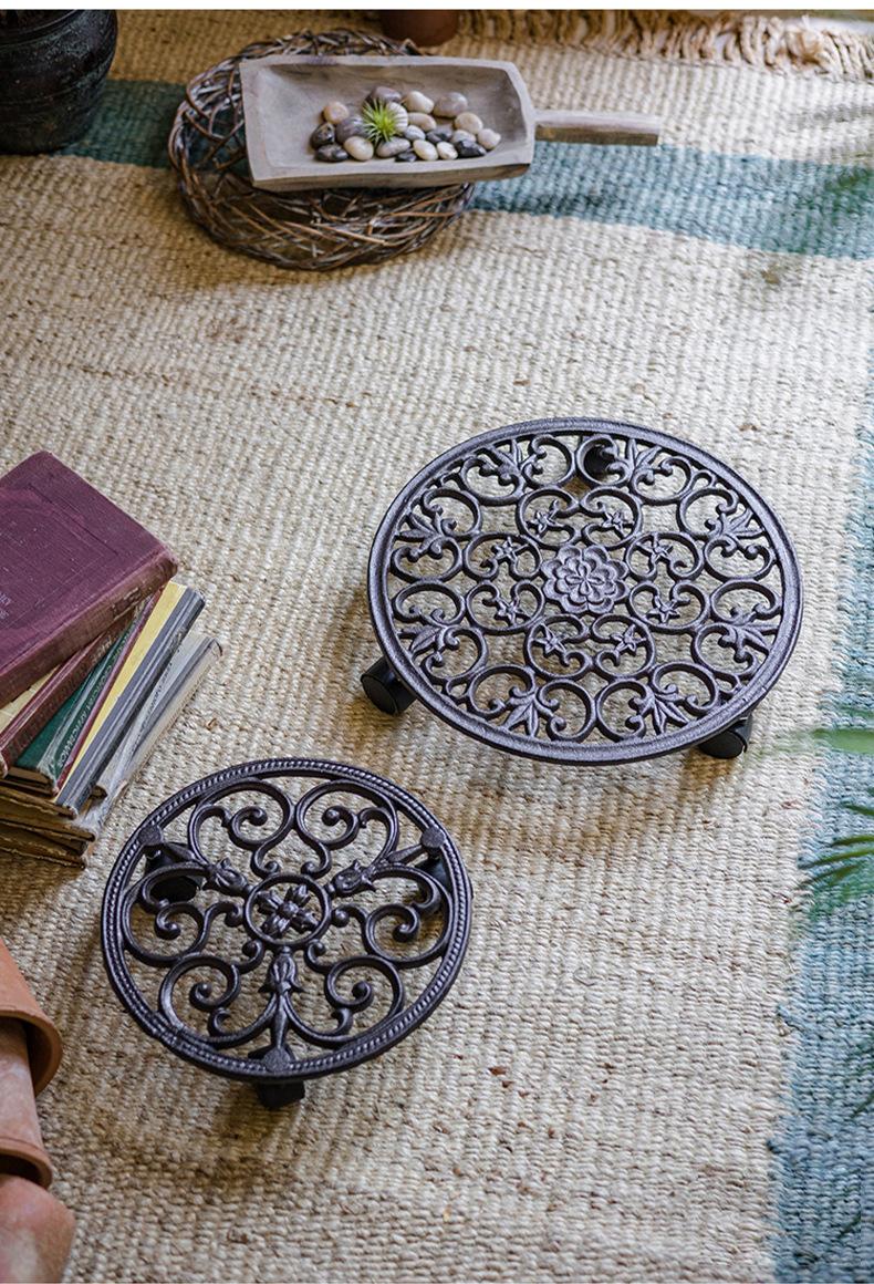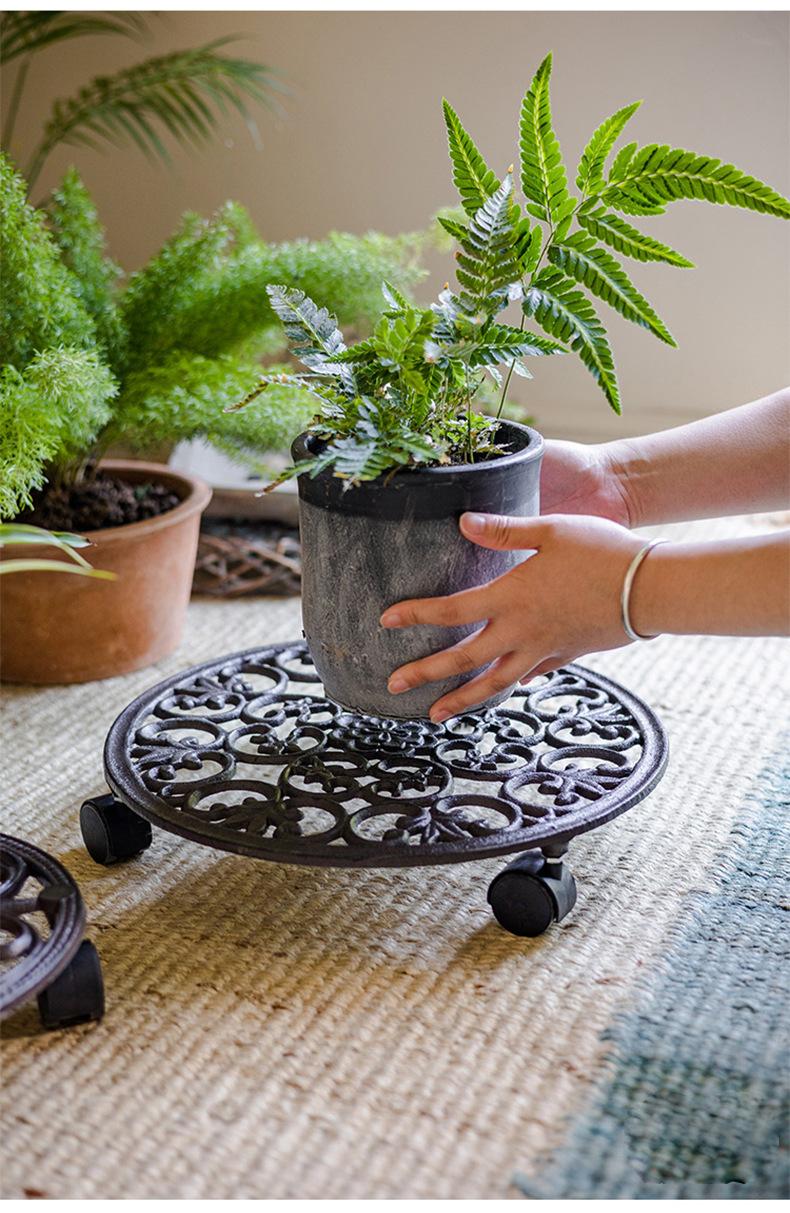 Bandeja para macetas de hierro fundido de estilo europeo con rueda universal para interiores, balcones, salas de estar, hoteles, jardines, patios y oficinas.