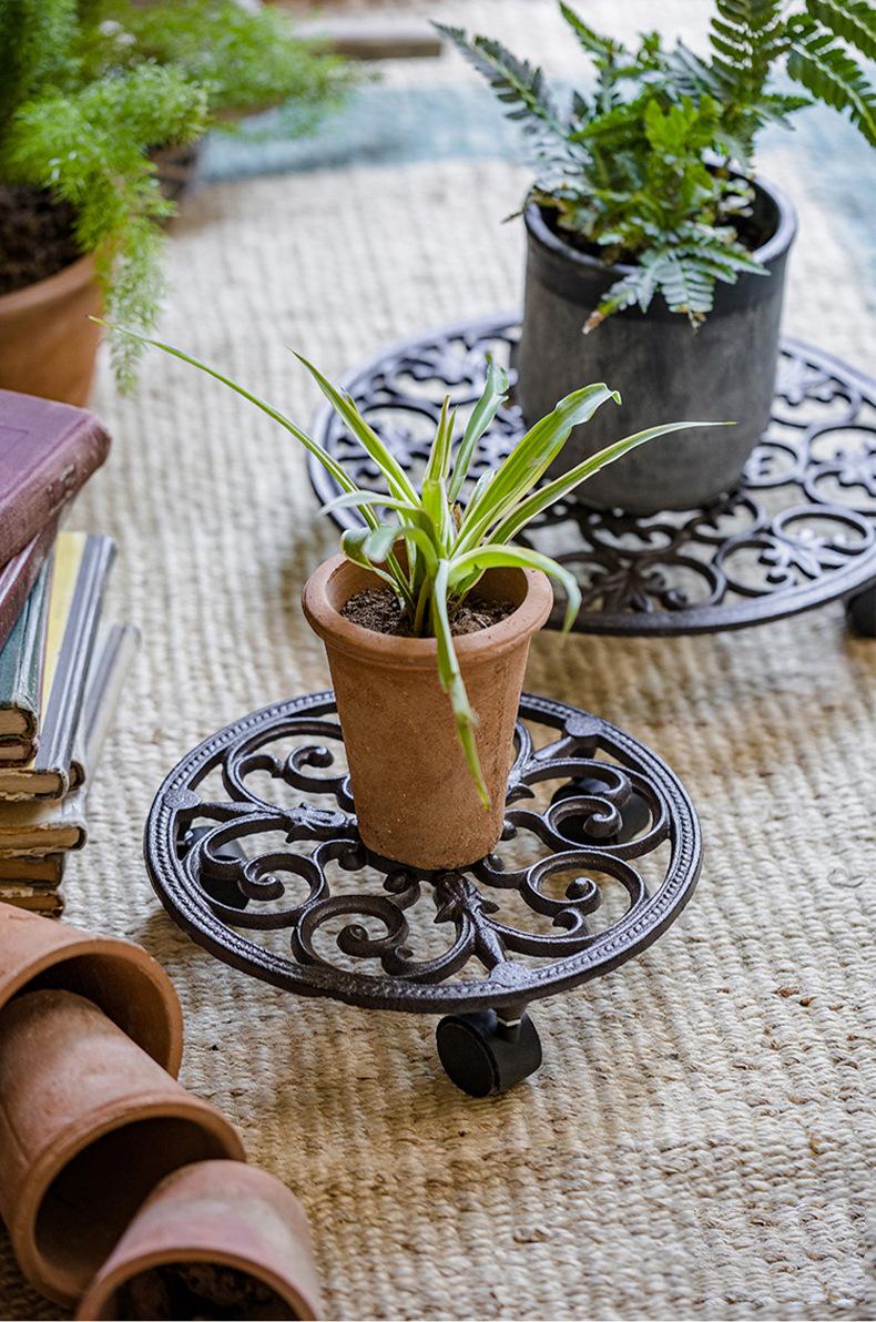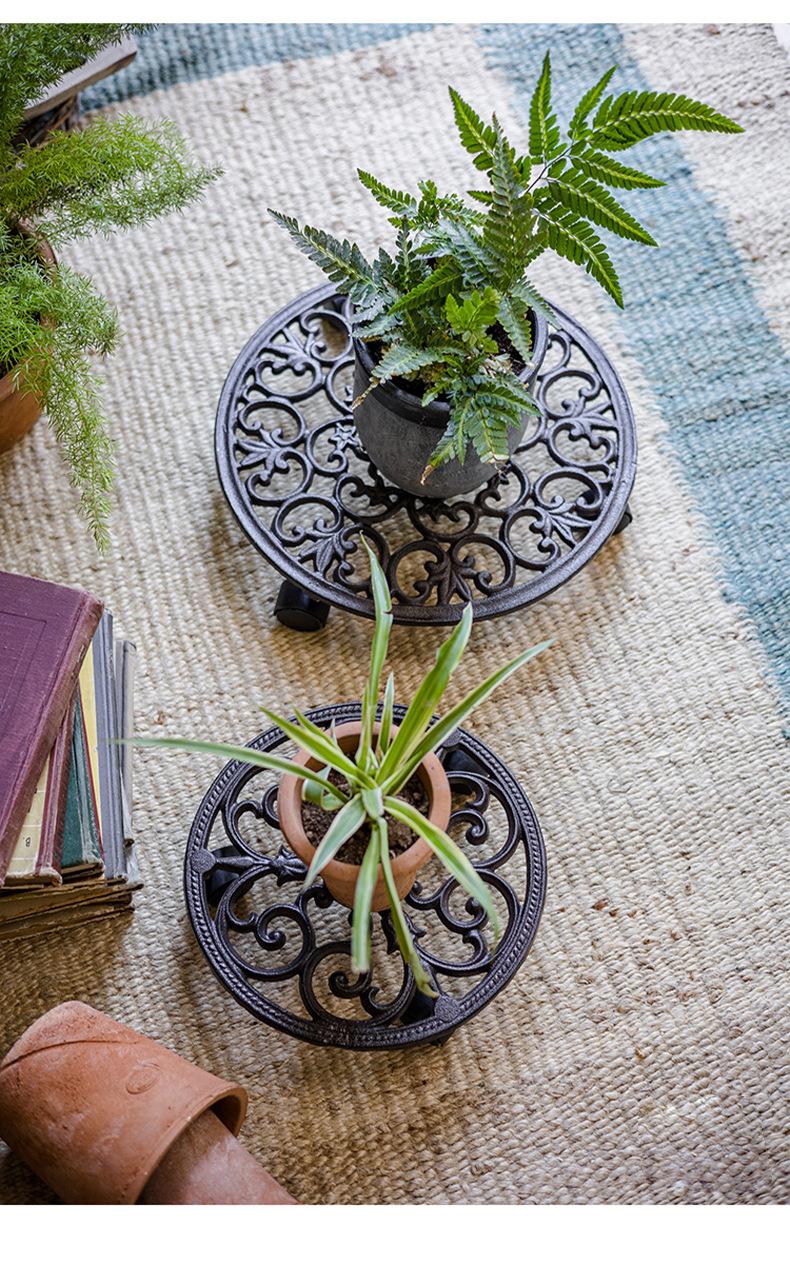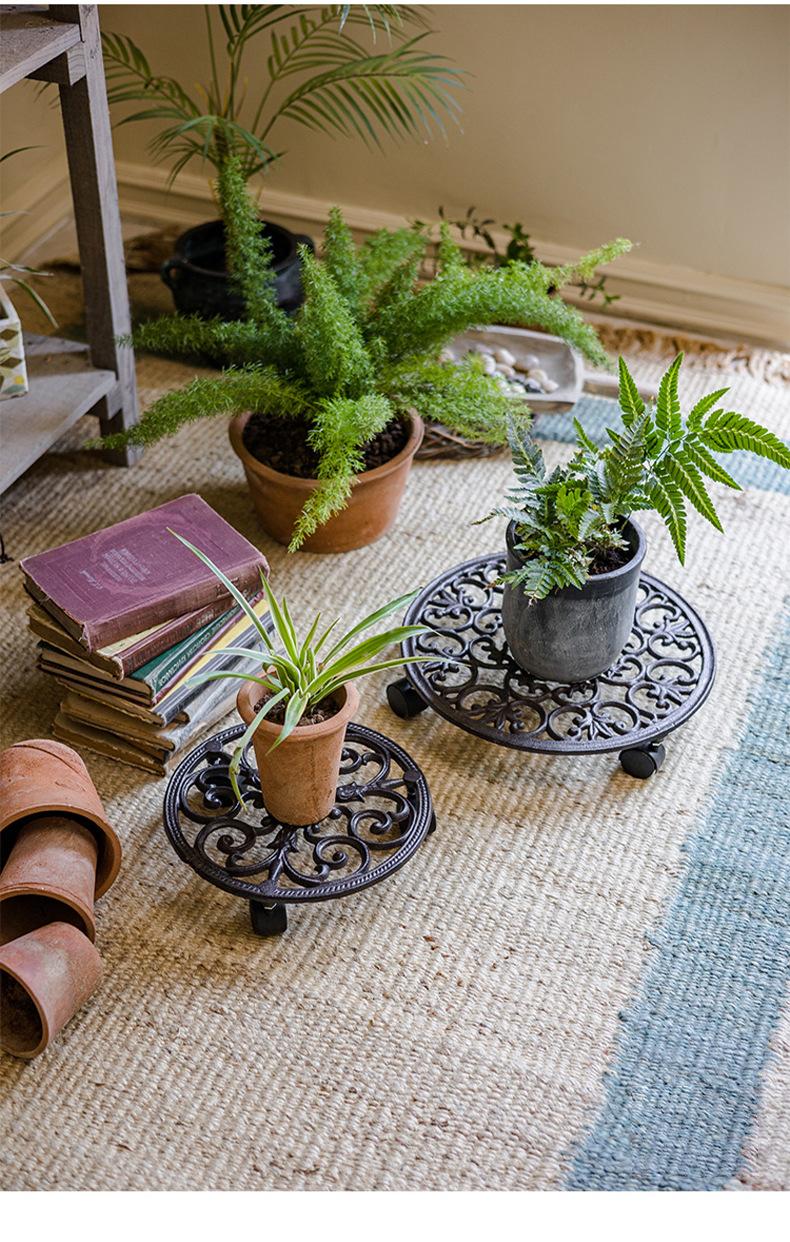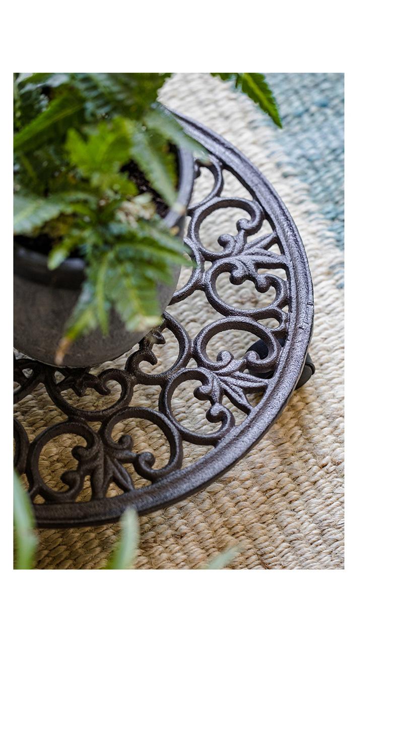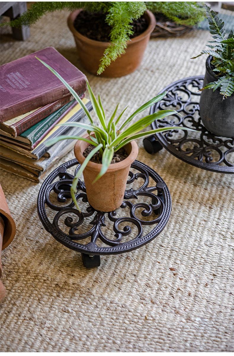 Bandeja para macetas de hierro fundido de estilo europeo con rueda universal para interiores, balcones, salas de estar, hoteles, jardines, patios y oficinas.