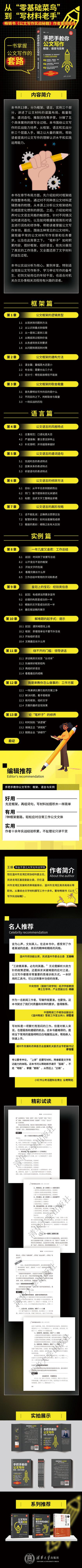 En cuanto a la estructura de los capítulos, este libro presenta primero cómo diseñar la estructura general de los documentos oficiales. Mediante la comprensión del razonamiento lógico de los diferentes tipos de documentos oficiales, analiza las razones por las que la estructura de los documentos oficiales se ha convertido en una convención fija desde el origen. Posteriormente, explica cómo cultivar la sensibilidad hacia el estilo lingüístico de los documentos oficiales, cómo elegir palabras y frases para diferentes situaciones, y cómo pulir y modificar el lenguaje según las circunstancias objetivas, entre otras cosas, para ayudar a los lectores a dominar las habilidades de escritura de documentos oficiales. Finalmente, centrándose en cinco documentos oficiales comunes, muestra el contexto de escritura más común y los requisitos de las tareas de los documentos oficiales, así como cómo los autores recopilan contenido, construyen marcos y organizan el lenguaje en este contexto, lo que muestra plenamente el contexto laboral real y reconstruye por completo el proceso de creación de materiales textuales.