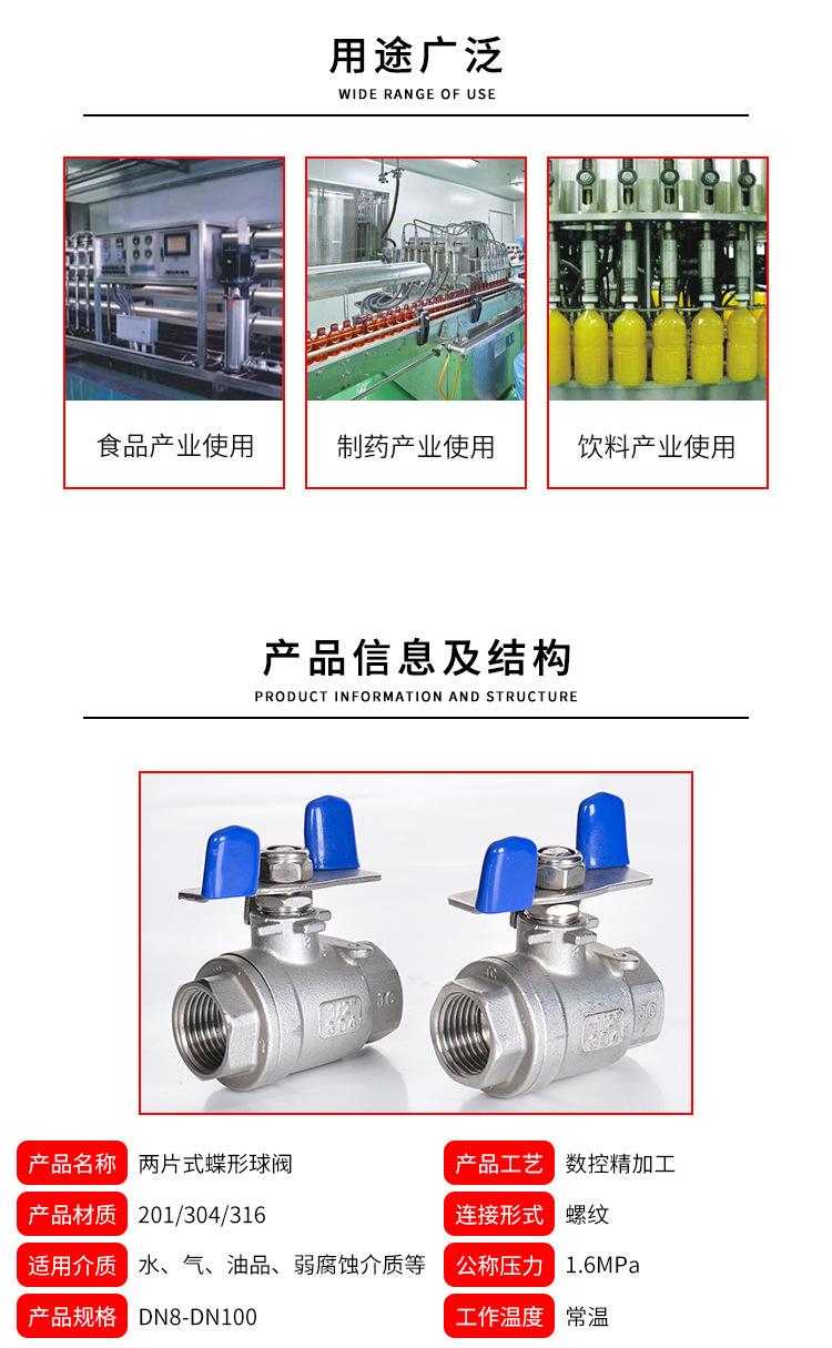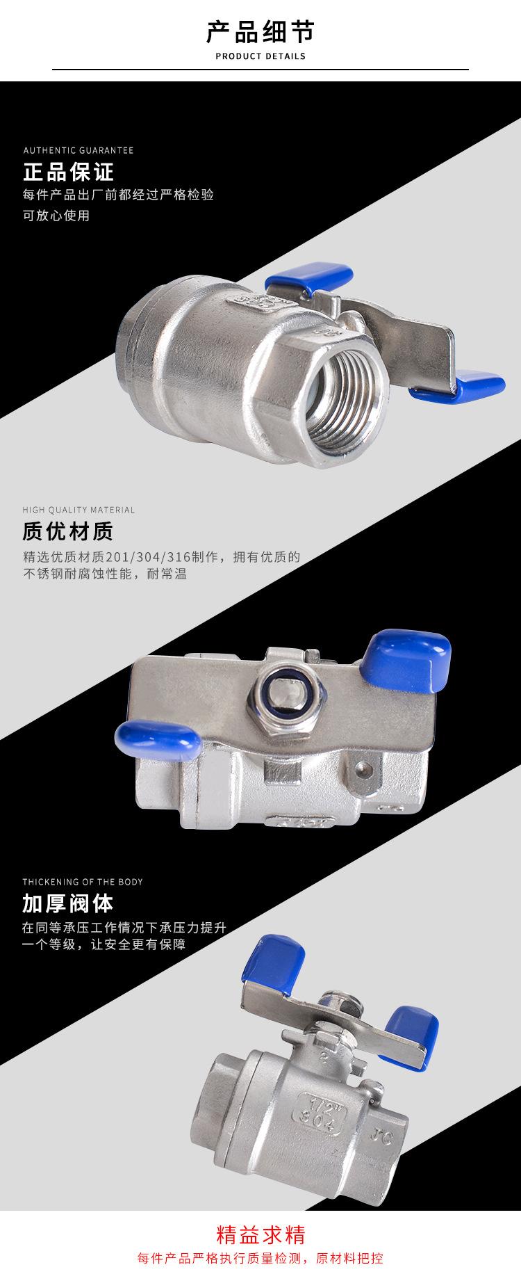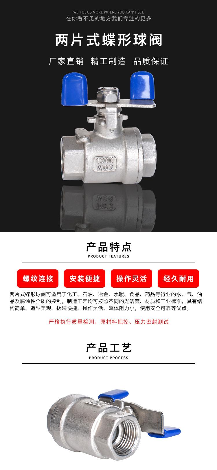 Válvula de bola con manija de mariposa de acero inoxidable 304 Válvula de disco de mariposa de dos piezas Interruptor de tubería de agua de dos piezas 4 puntos 6 puntos 1 pulgada 2