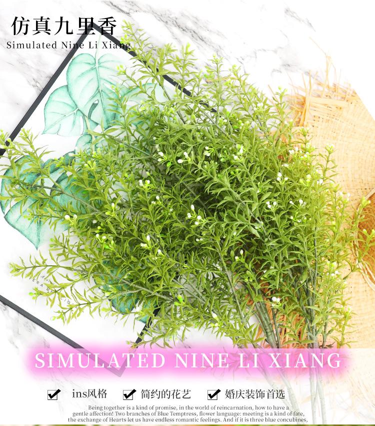Simulación de un auditorio de bodas de Nueve Lixiang con paisaje floral, ramo de plantas verdes con ramas, adornos para el comedor y la sala de estar.